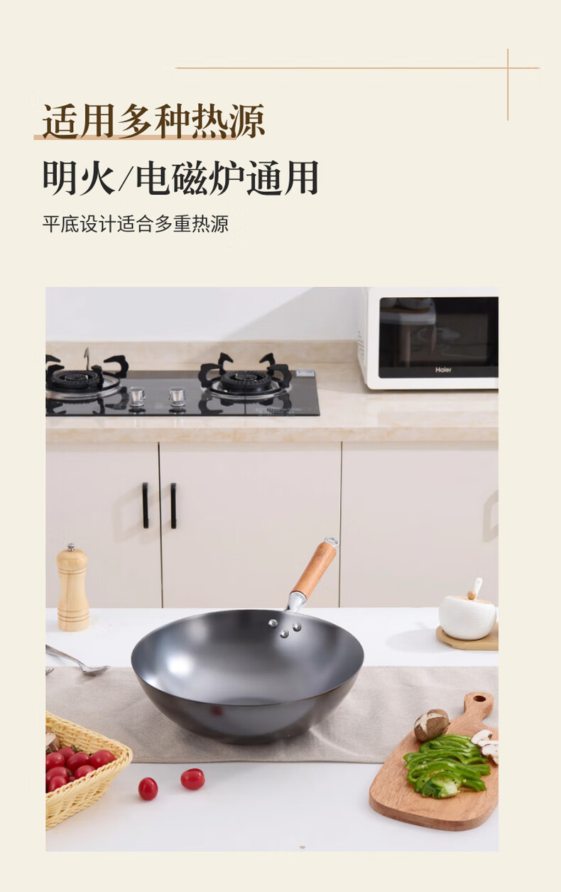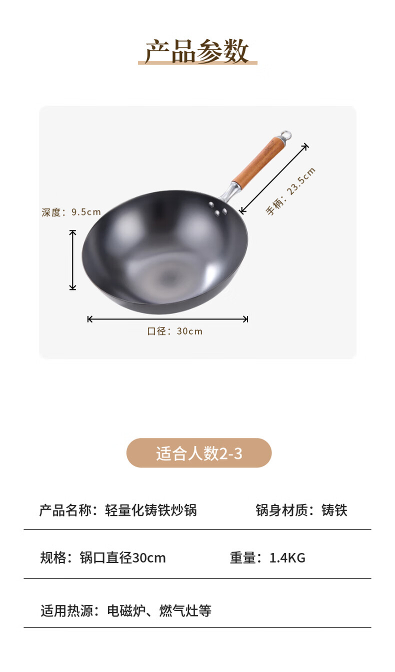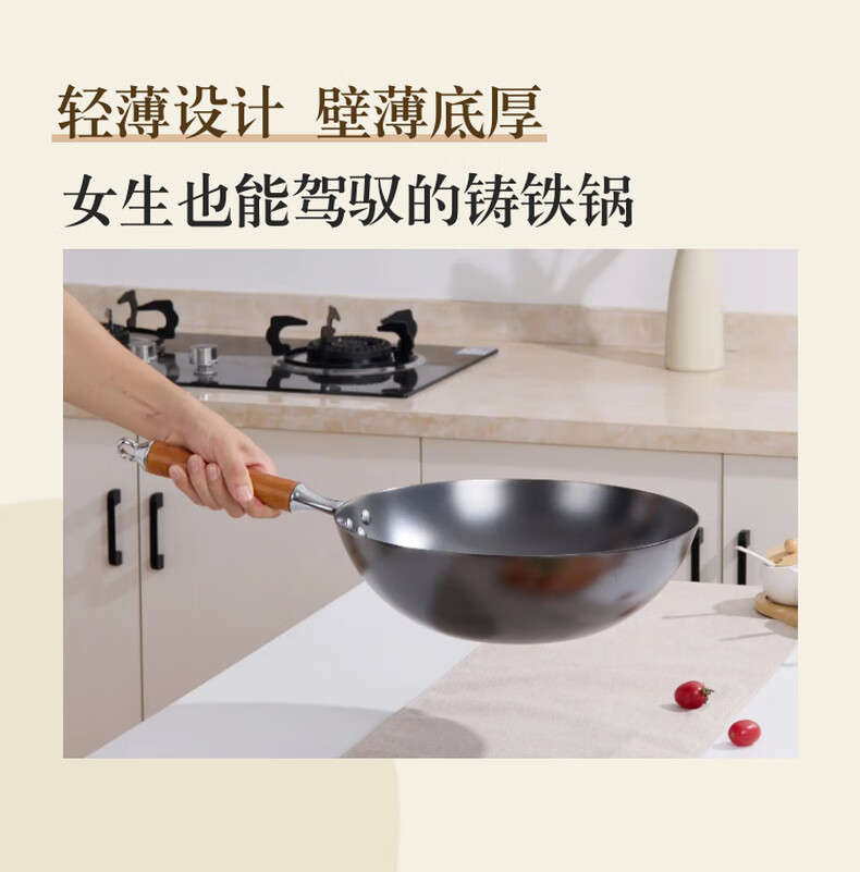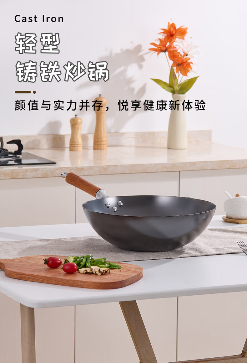 铁仕达(Telssida)轻型铸铁平底炒锅家用无涂层女士生铁锅不粘轻薄款铸铁炒菜锅30cm