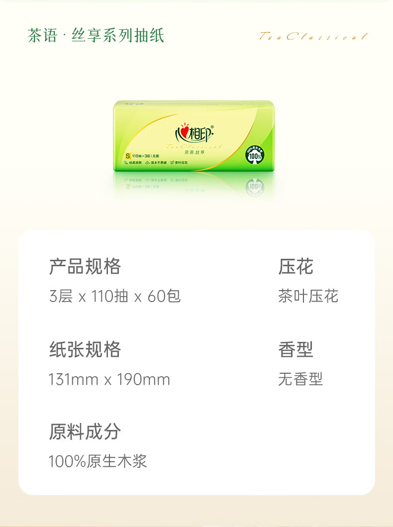 心相印抽纸 茶语丝享3层110抽*60包S码 纸巾 餐巾纸 (整箱销售)