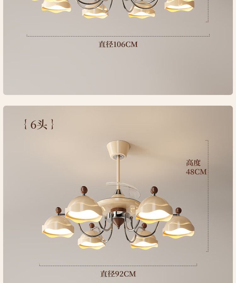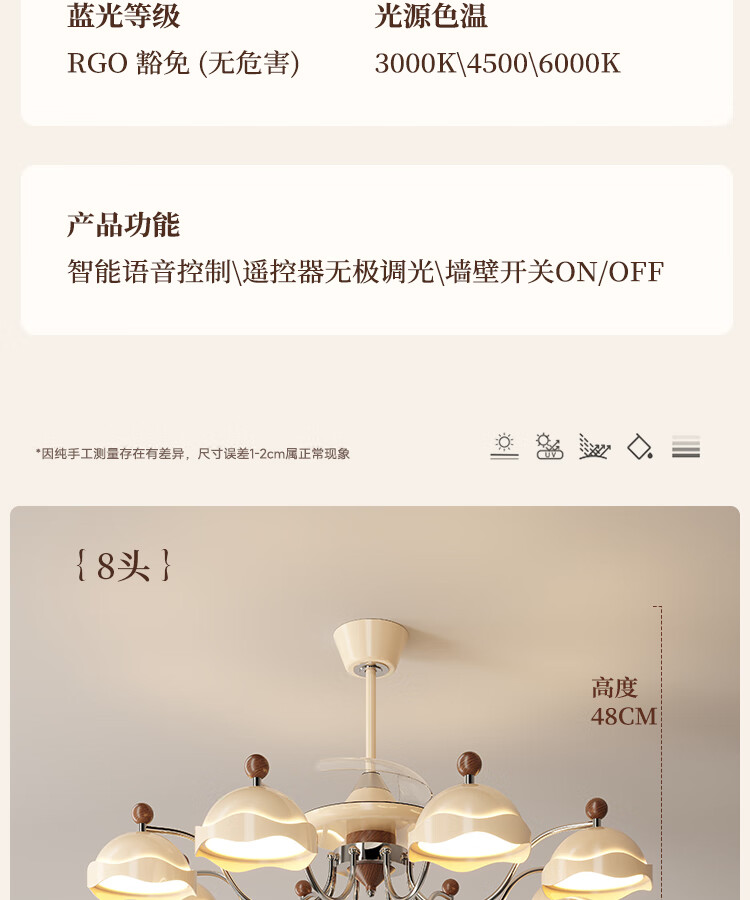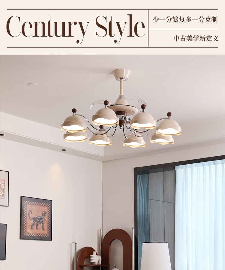 大自然照明客厅风扇吊灯隐形静音大尺寸餐厅吊扇灯风扇灯2025新款中古风吊灯 【全光谱护眼光源】吊顶款 奶油色8头106CM 三色变光