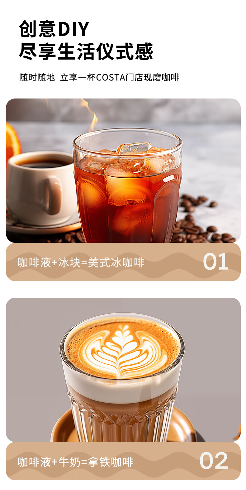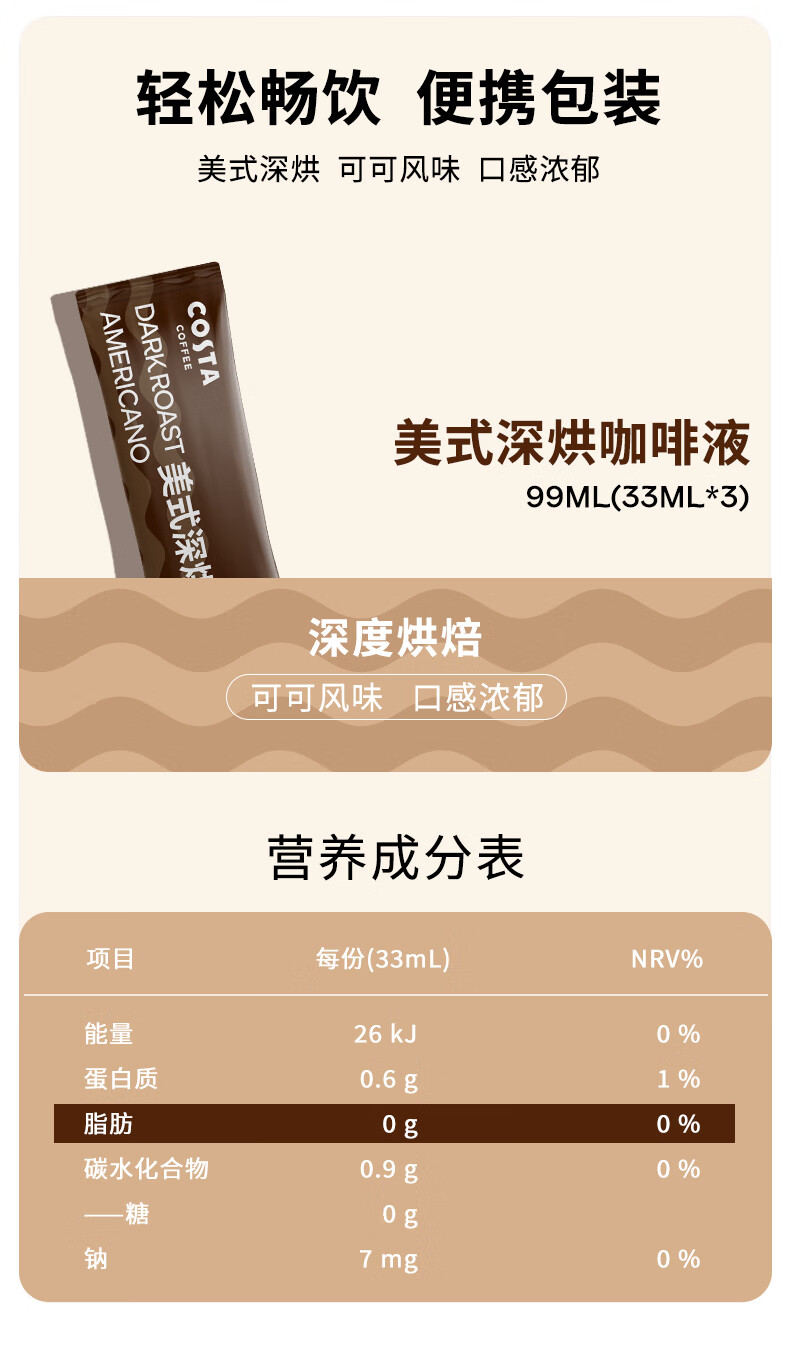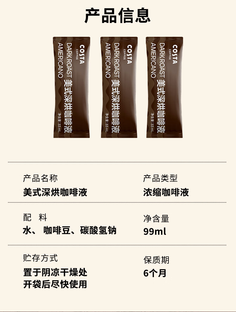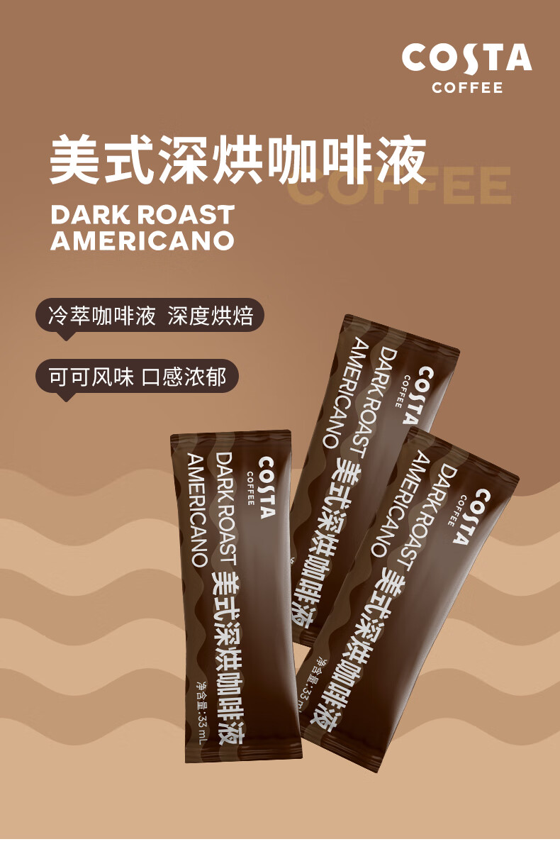 COSTA美式浓缩咖啡液门店同款0蔗糖0脂深烘可可风味黑咖啡原液33ml*3条
