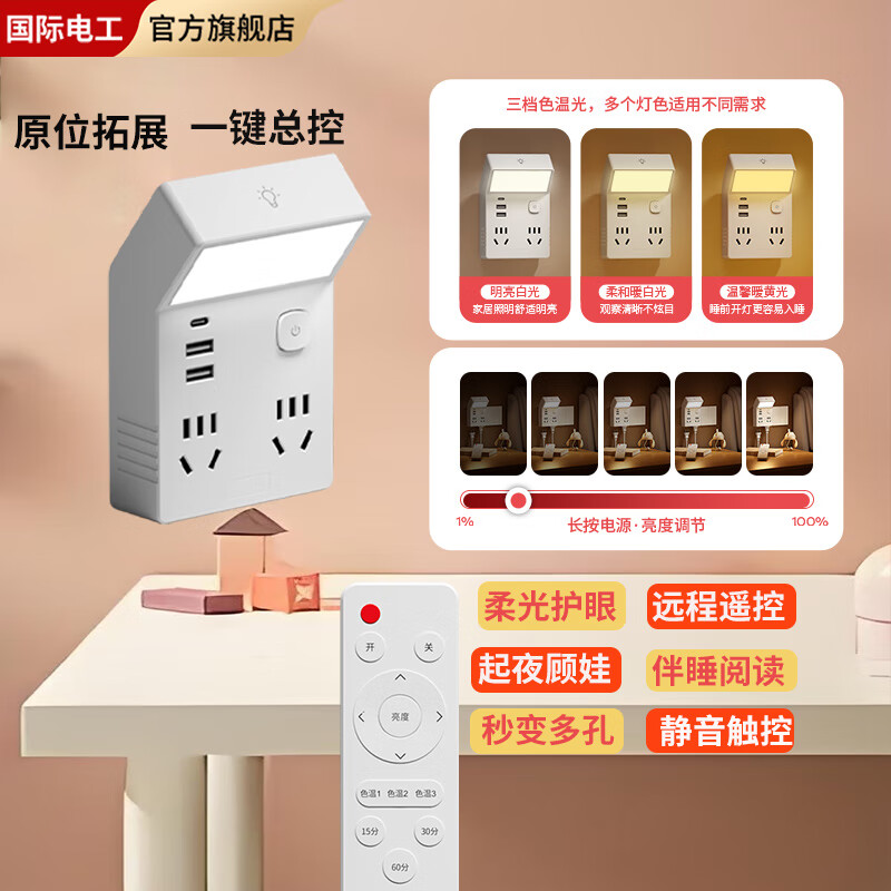 FDD国际电工86型一转四拓展插座书房床头多功能带小夜灯直插转换插头暗装插座 一转四带灯拓展插座-白色