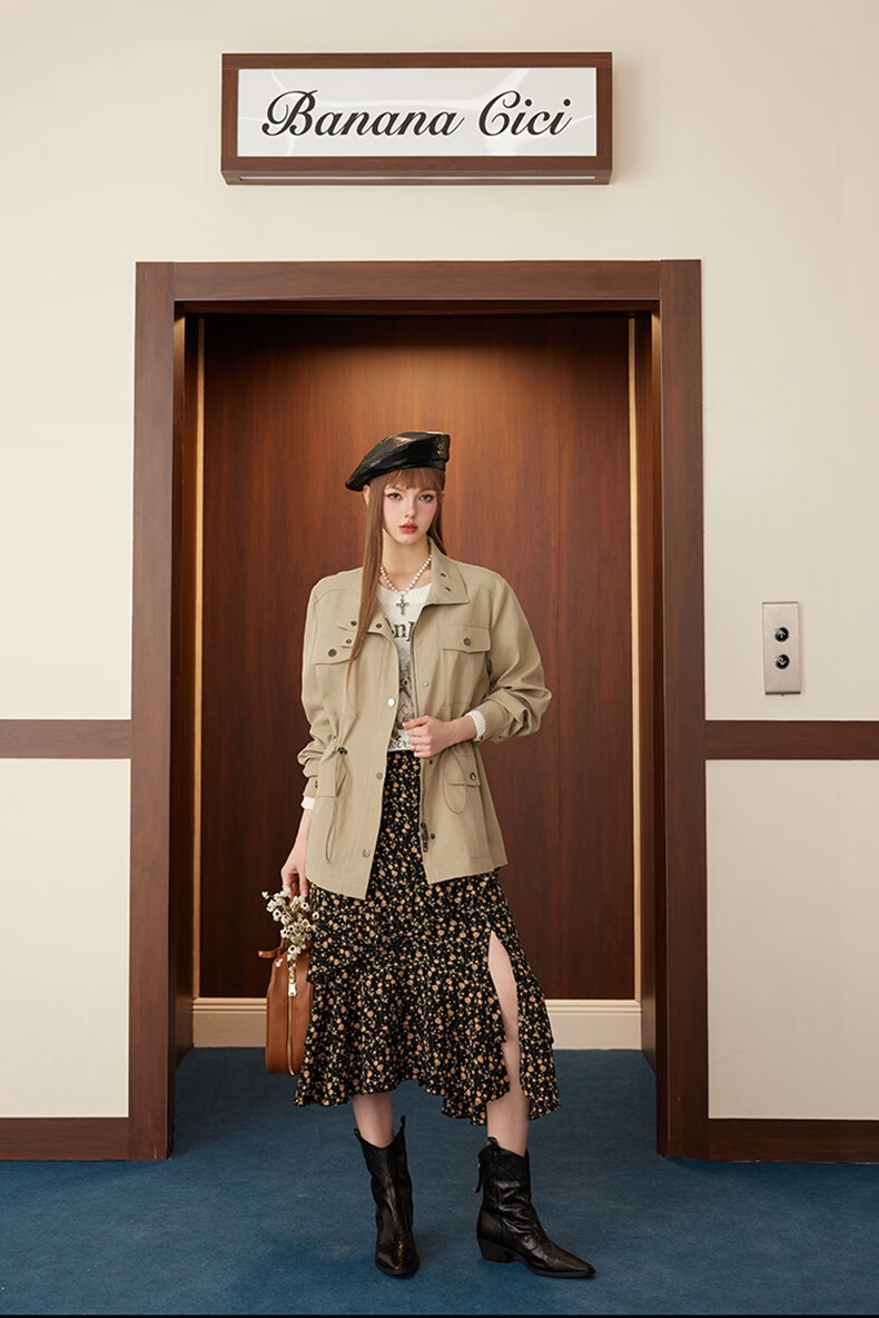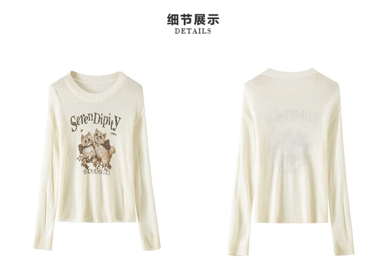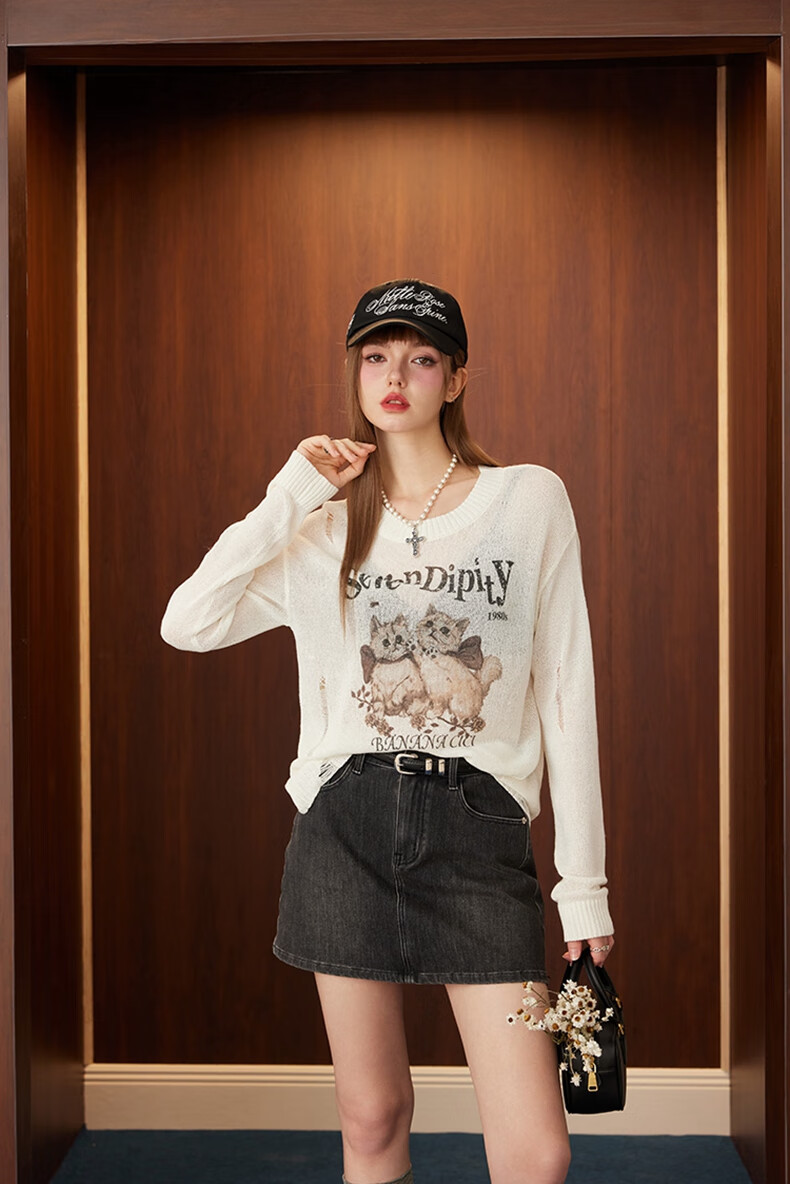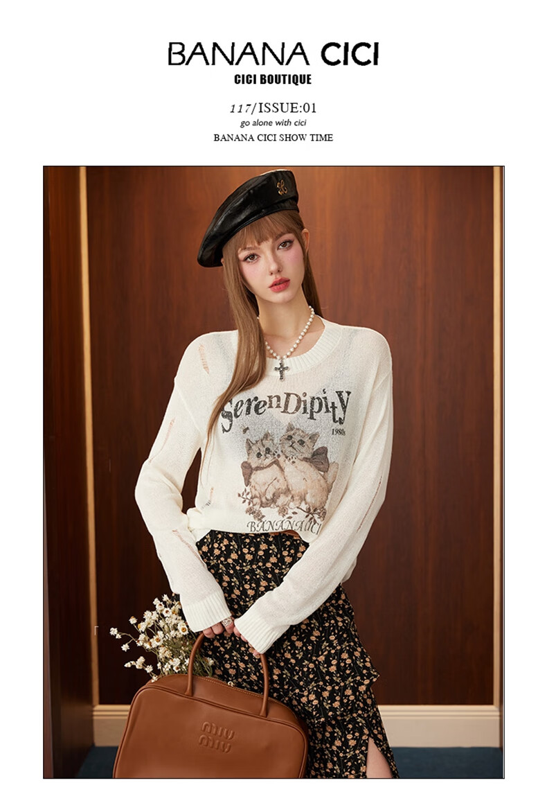 banana cici2025年秋季新款破洞复古做旧猫咪印花oversize针织衫女C243MY069 米白 S