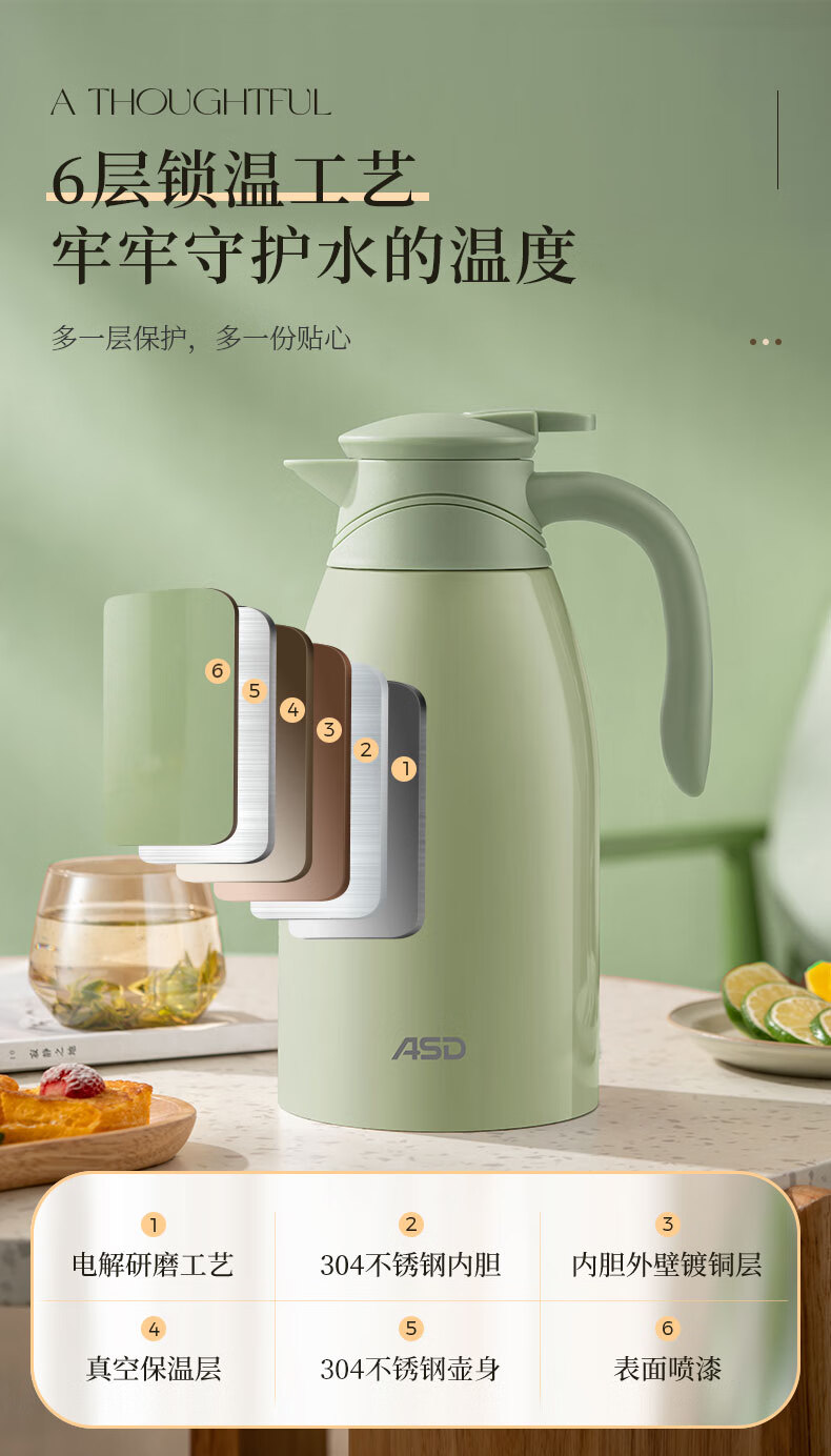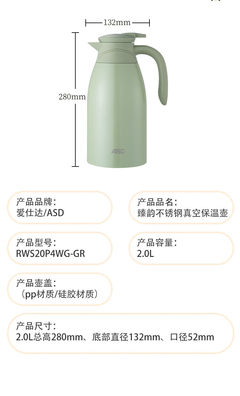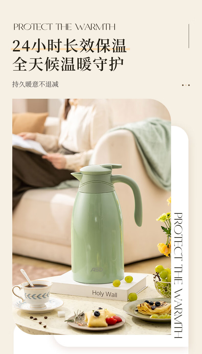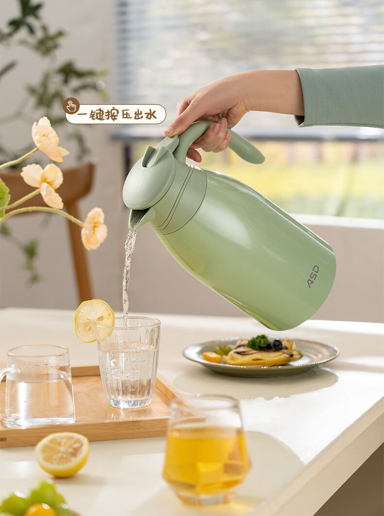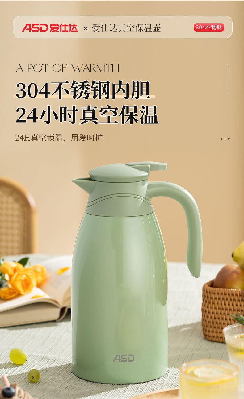 爱仕达(ASD)304不锈钢真空保温壶 家用办公大容量热水瓶 长效保温 2.0L 绿色