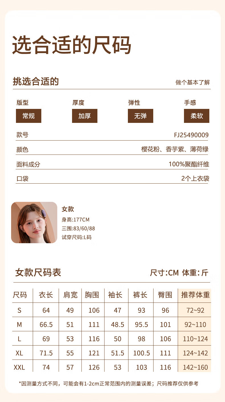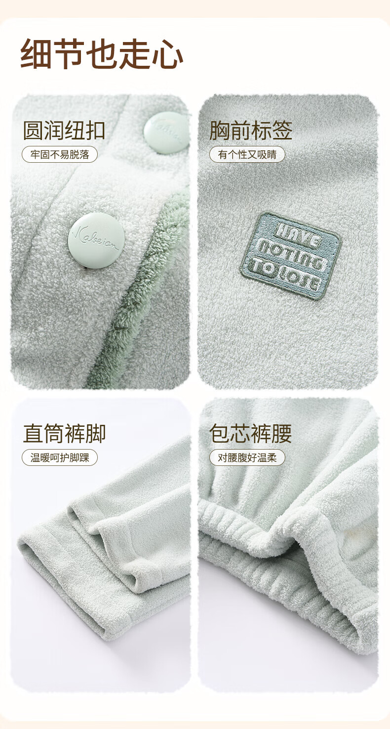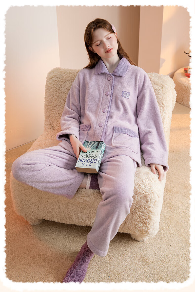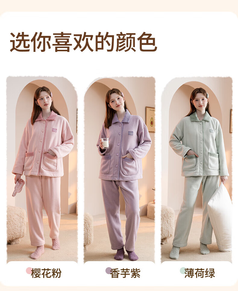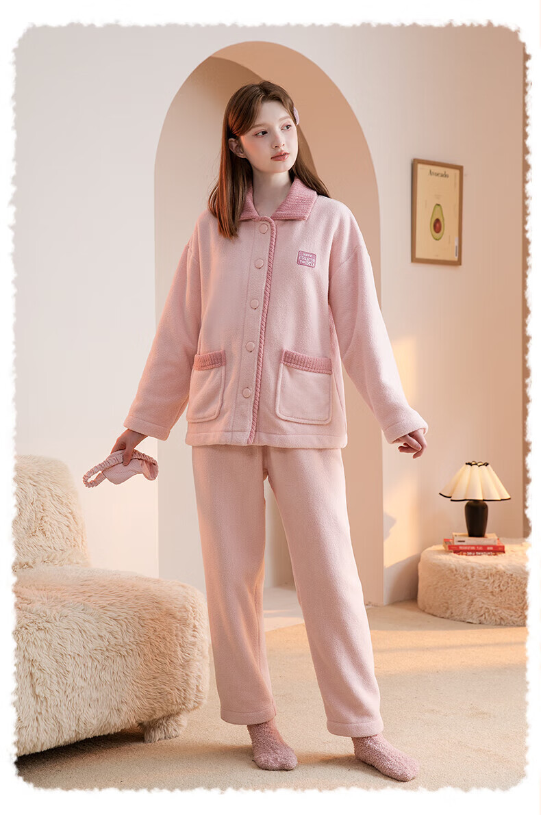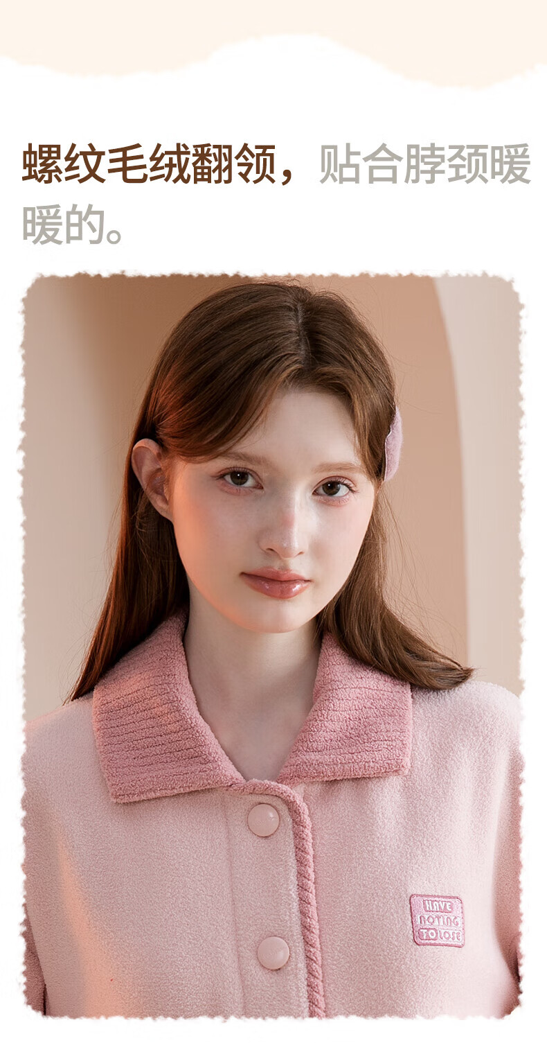 芬腾睡衣女【双面暖绒】秋冬翻领开衫长袖加厚加绒家居服套装 樱花粉 L