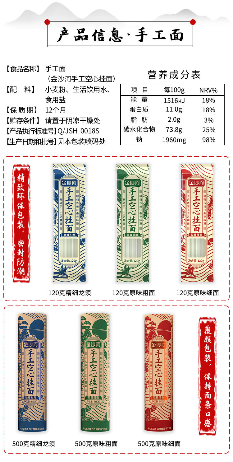 金沙河手工挂面面条 农家手工拉面线面龙须面早餐面 汤面凉面早餐 500g*1袋 手工原味粗面