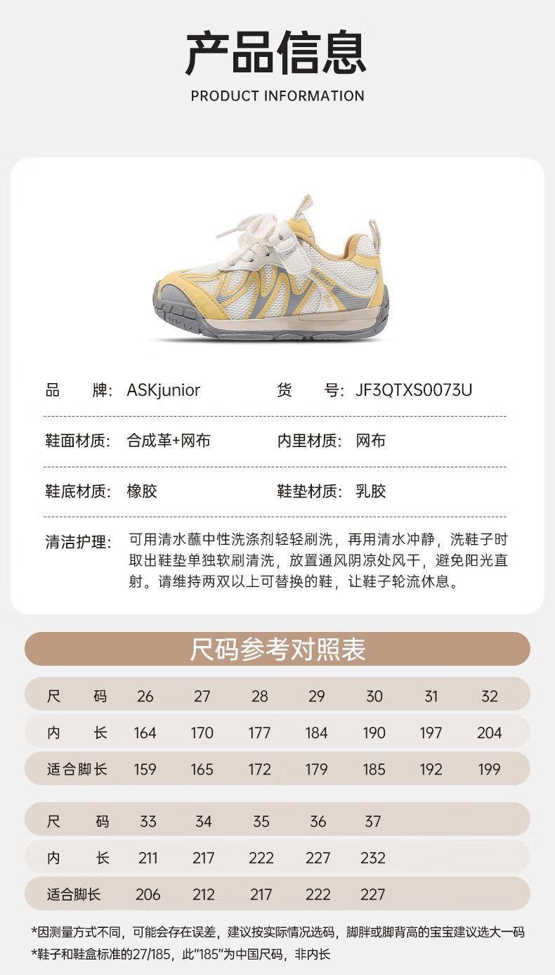 ASK JUNIOR童鞋女童运动鞋2025年秋冬季耐磨跑步鞋小学生休闲鞋 日曜黄 31