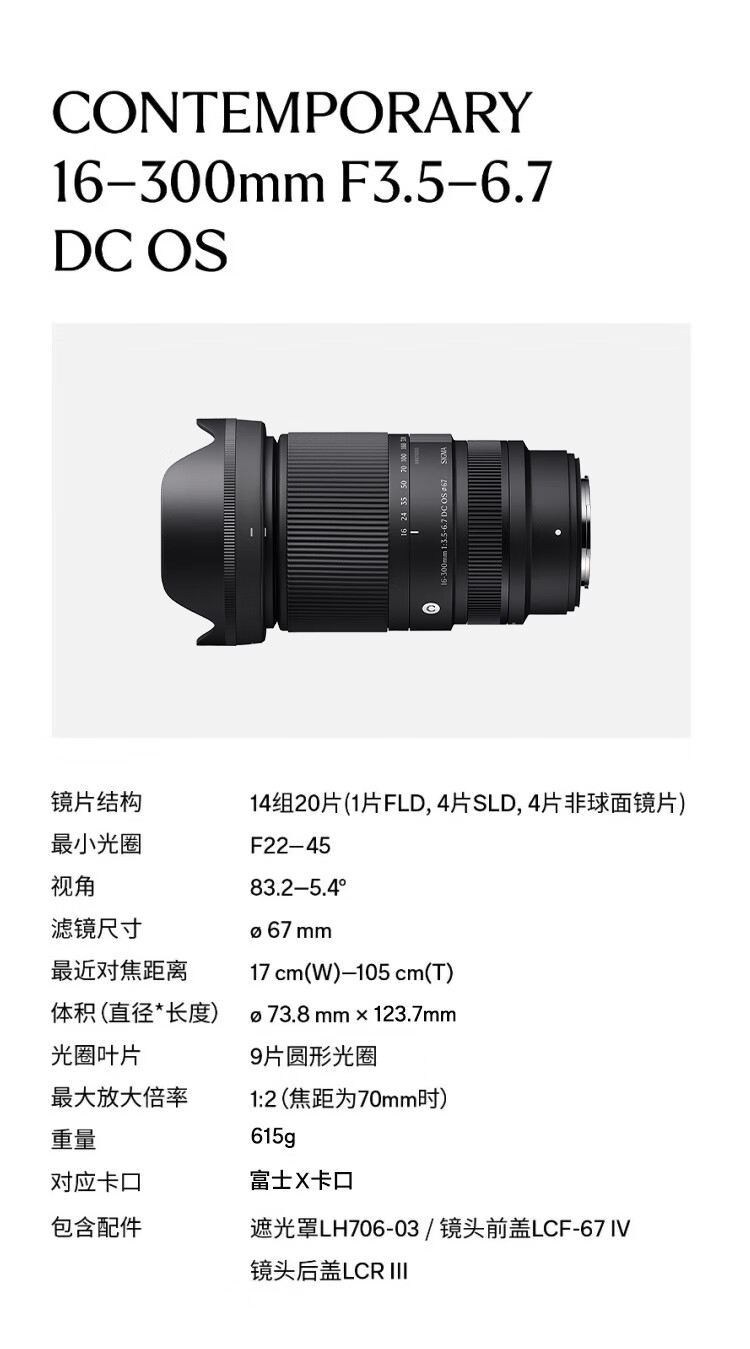 适马(SIGMA)16-300mm f3.5-6.7 DC OS |Contemporary 半画幅 远摄变焦镜头 旅游风光人像(富士X卡口)