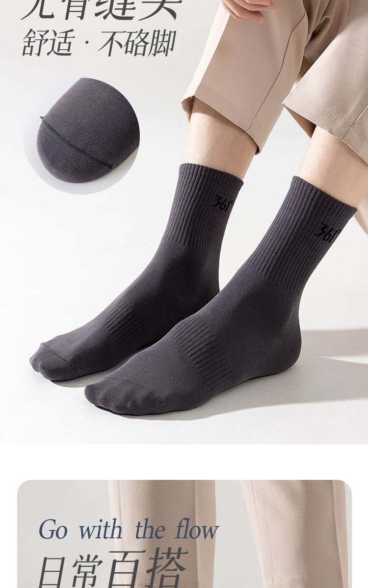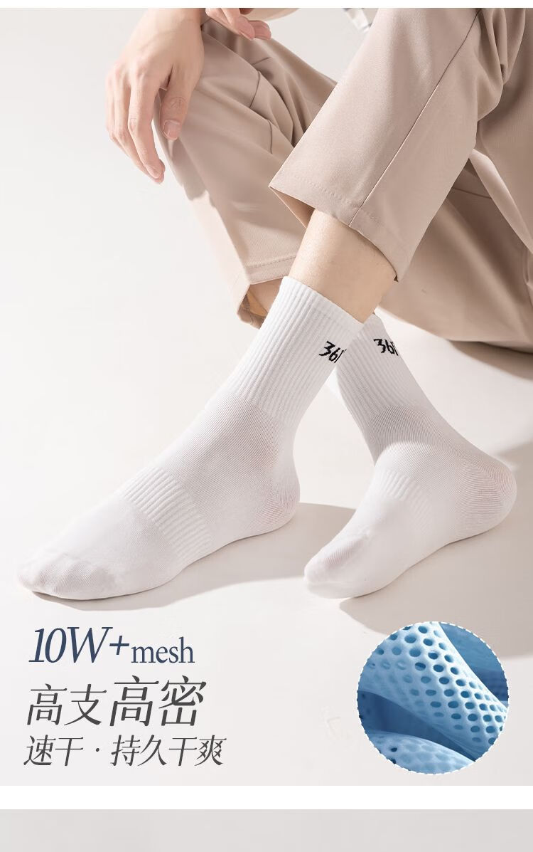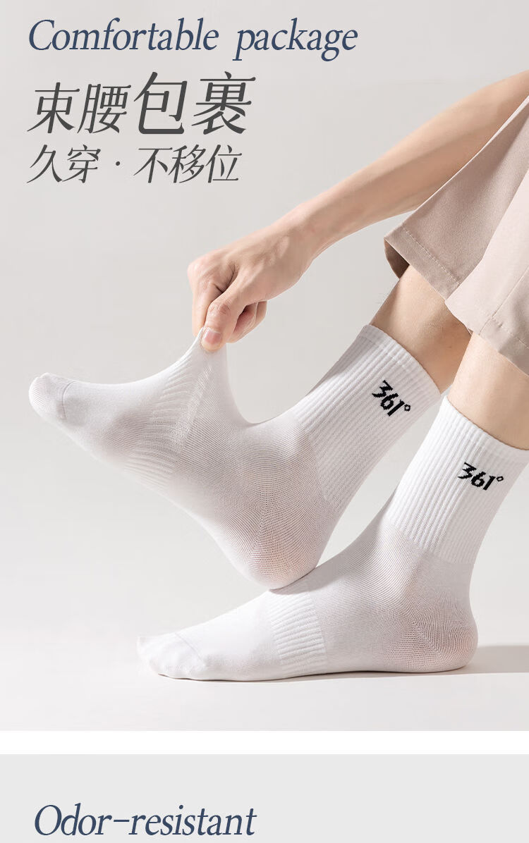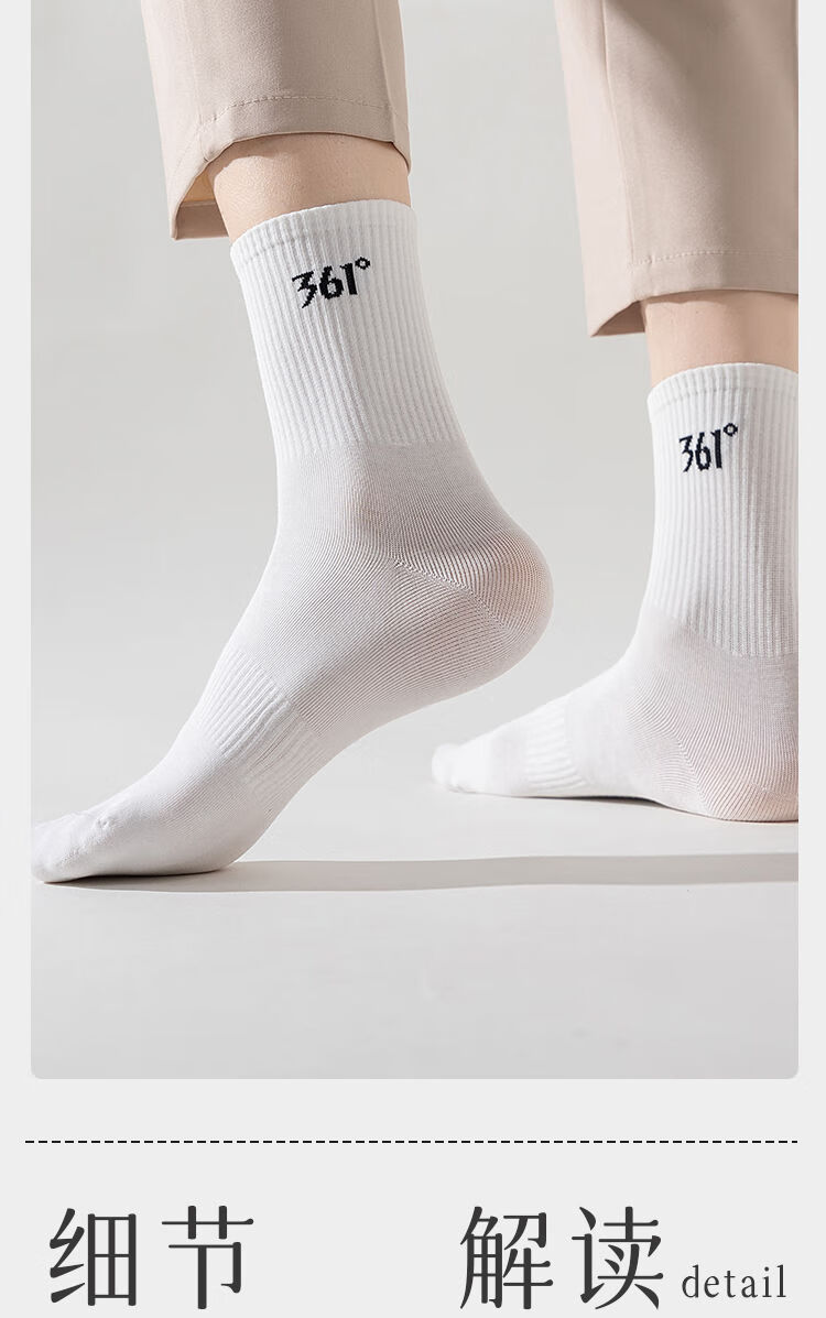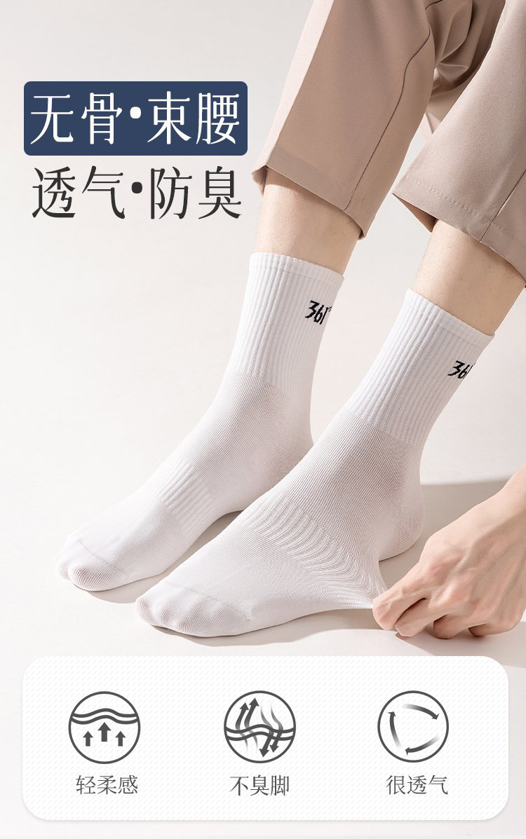 361°白袜子男士运动袜中筒袜学院风透气简约耐磨百搭抗菌长袜运动袜 白色3双装【耐穿耐磨】 均码