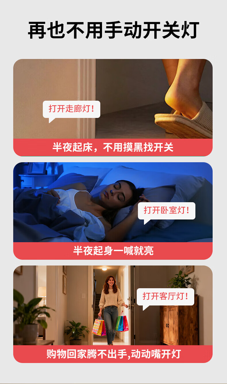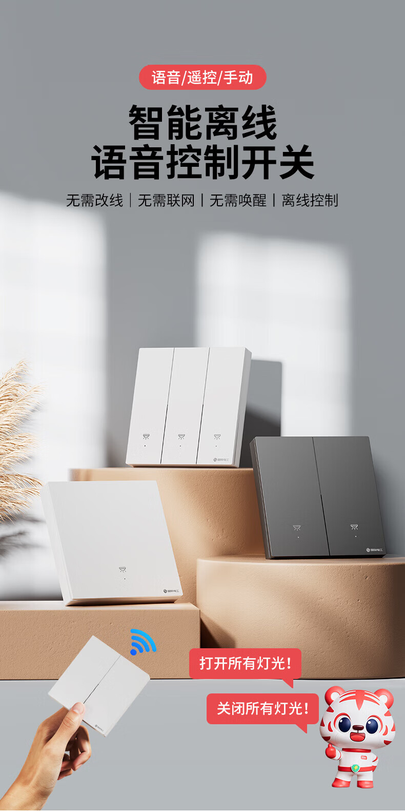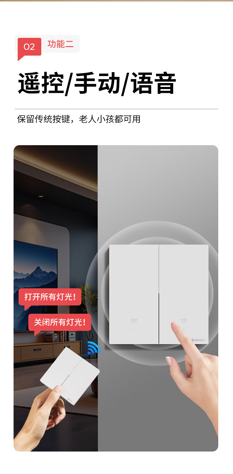 国际电工无线智能语音遥控开关双控免布线家用随意贴远程控制关灯神器220v 白色一开主机1个+一开随意贴1个【离线语音控制】