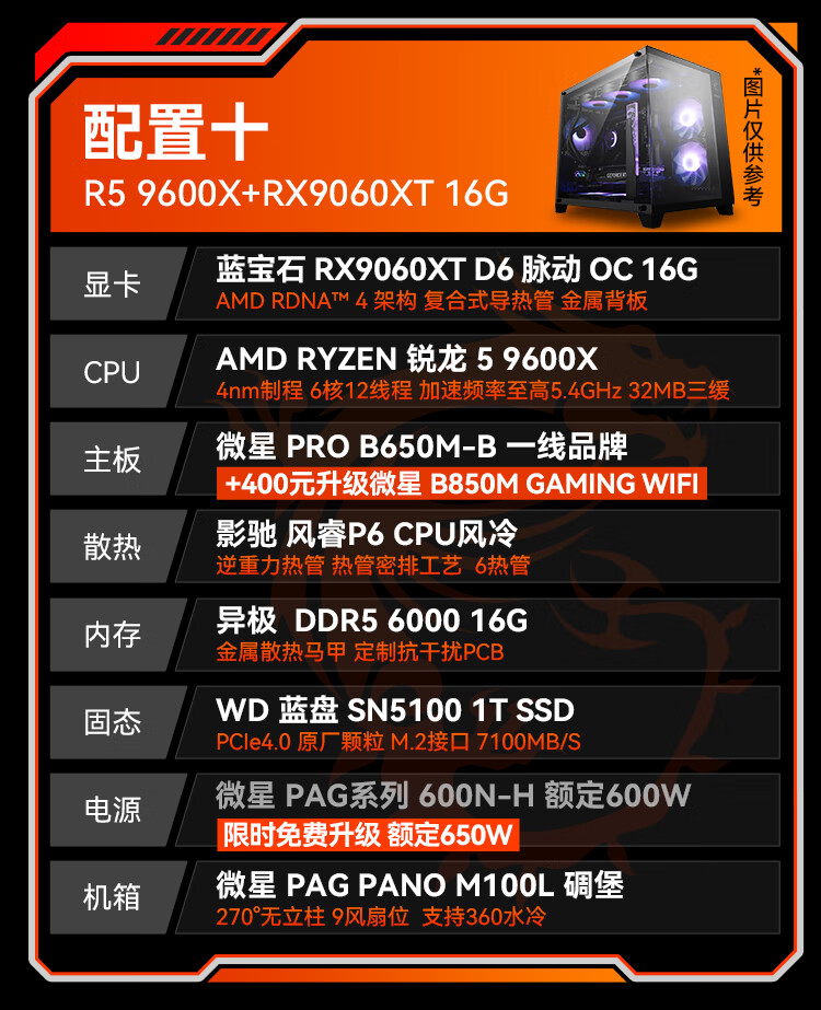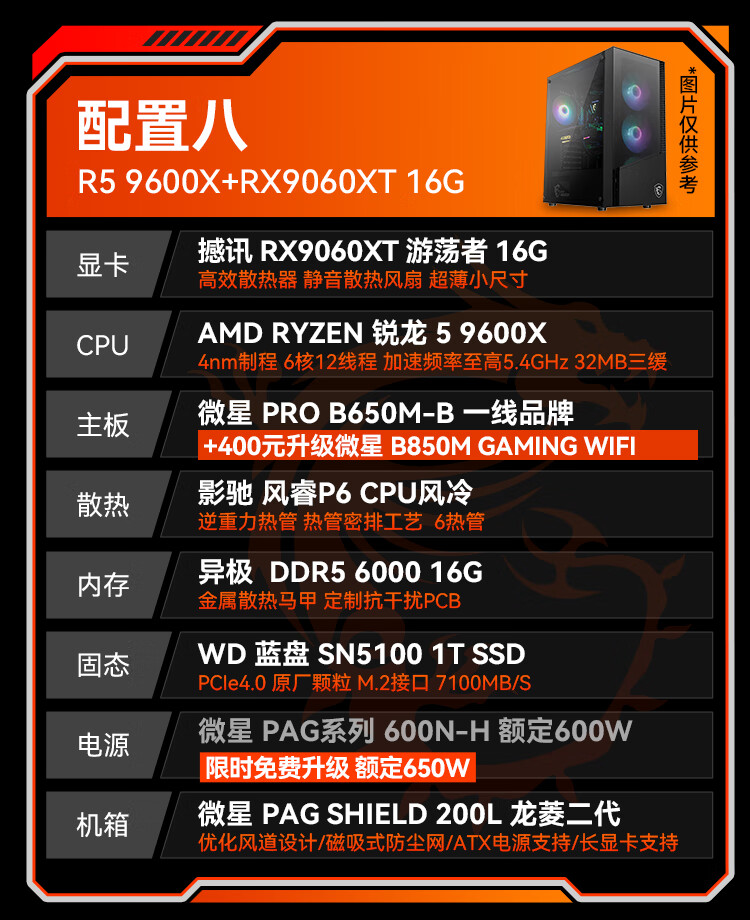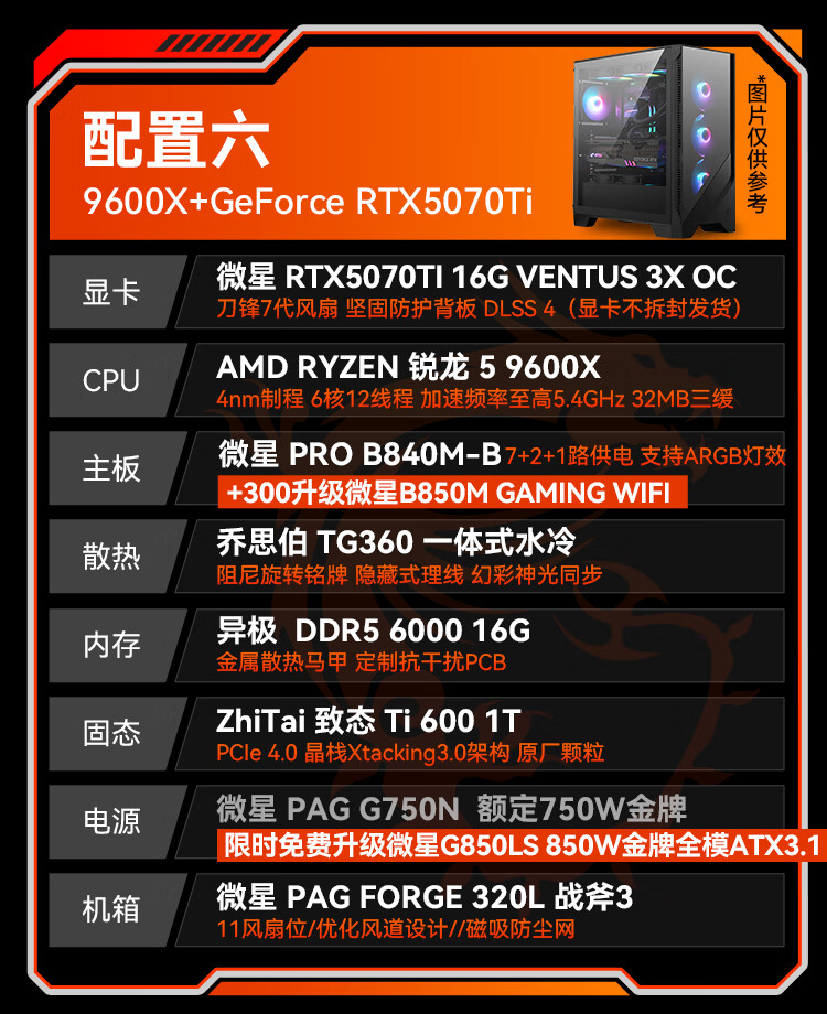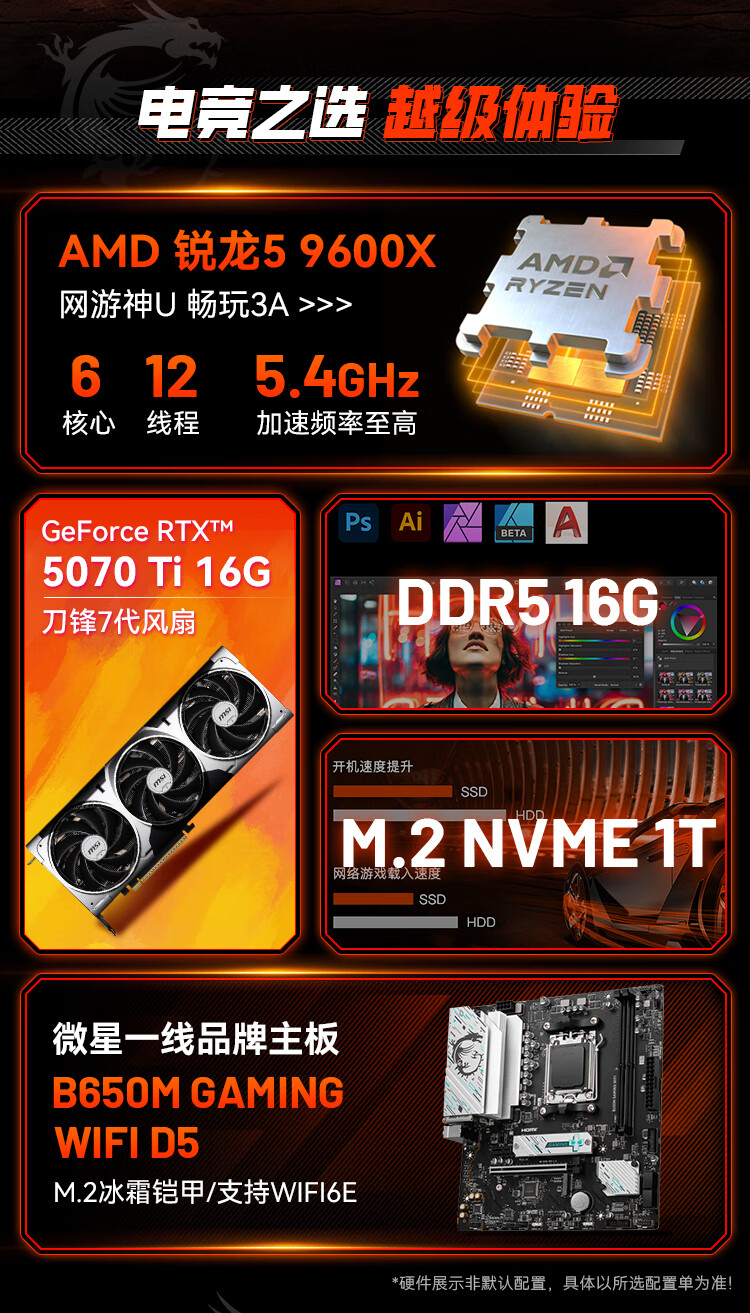 微星(MSI)全家桶 锐龙R5 9600X主机5060/5070Ti/9060XT/7650GRE电竞游戏DIY台式机直播设计深度学习组装电脑 配置2:9600X/RTX5060
