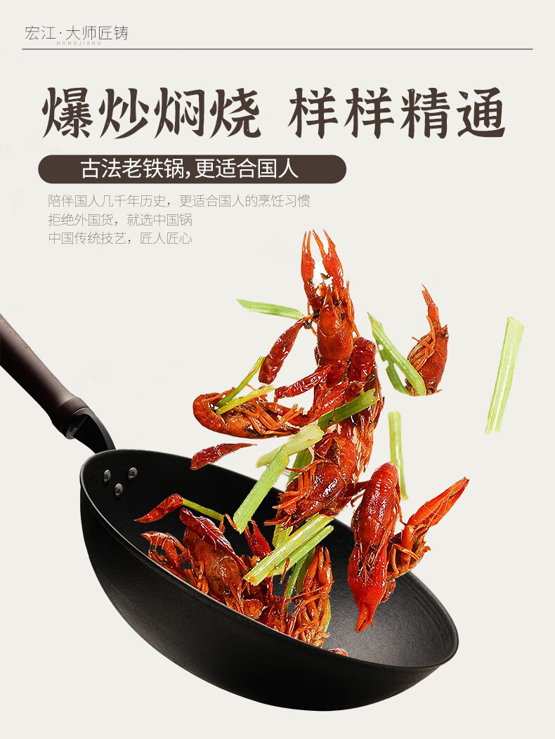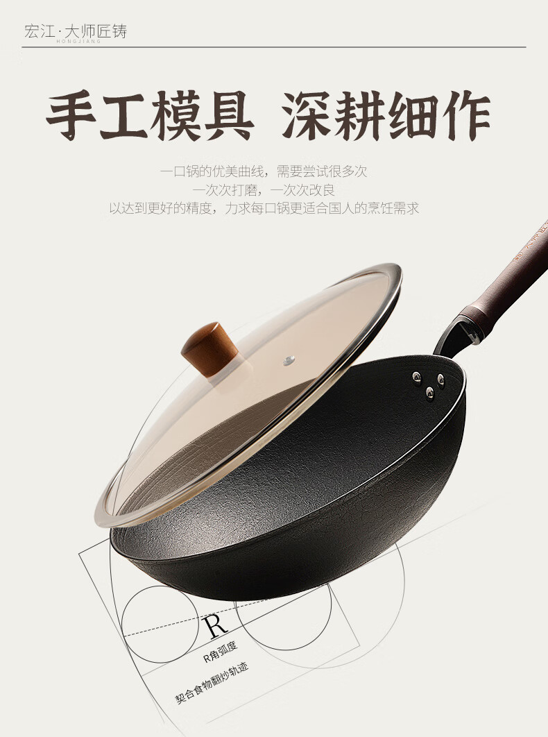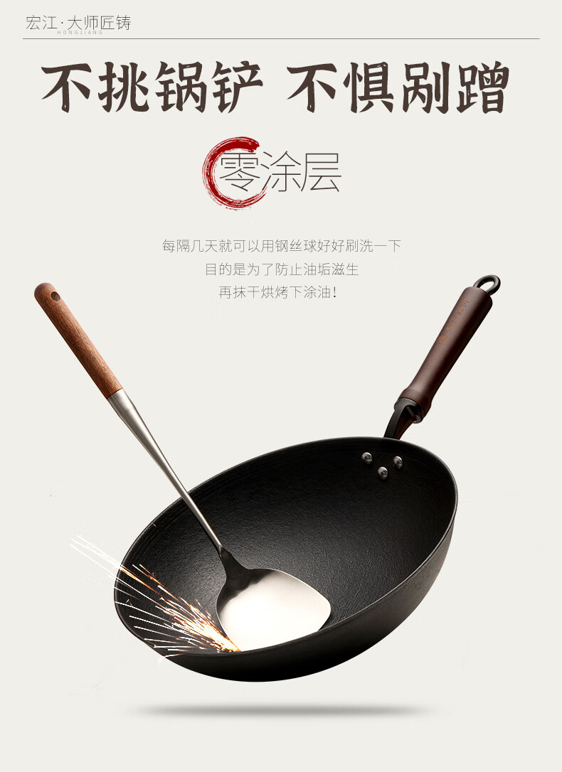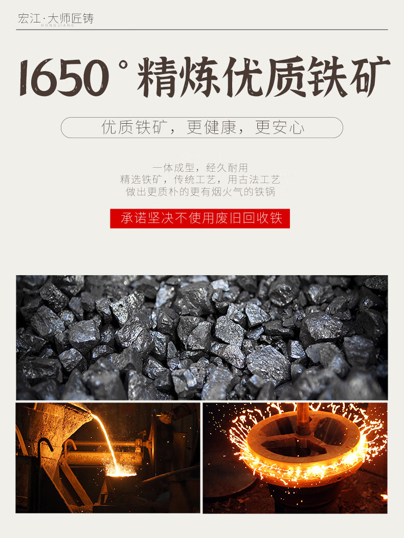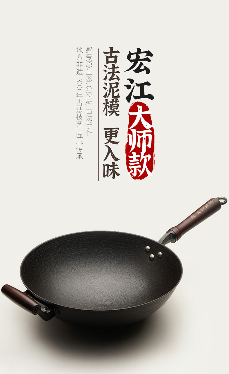 宏江 江油老式手工铁锅无涂层铁锅家用炒锅生铁圆底平底炒锅铸铁锅 32圆底无耳(大师款套装) 32cm