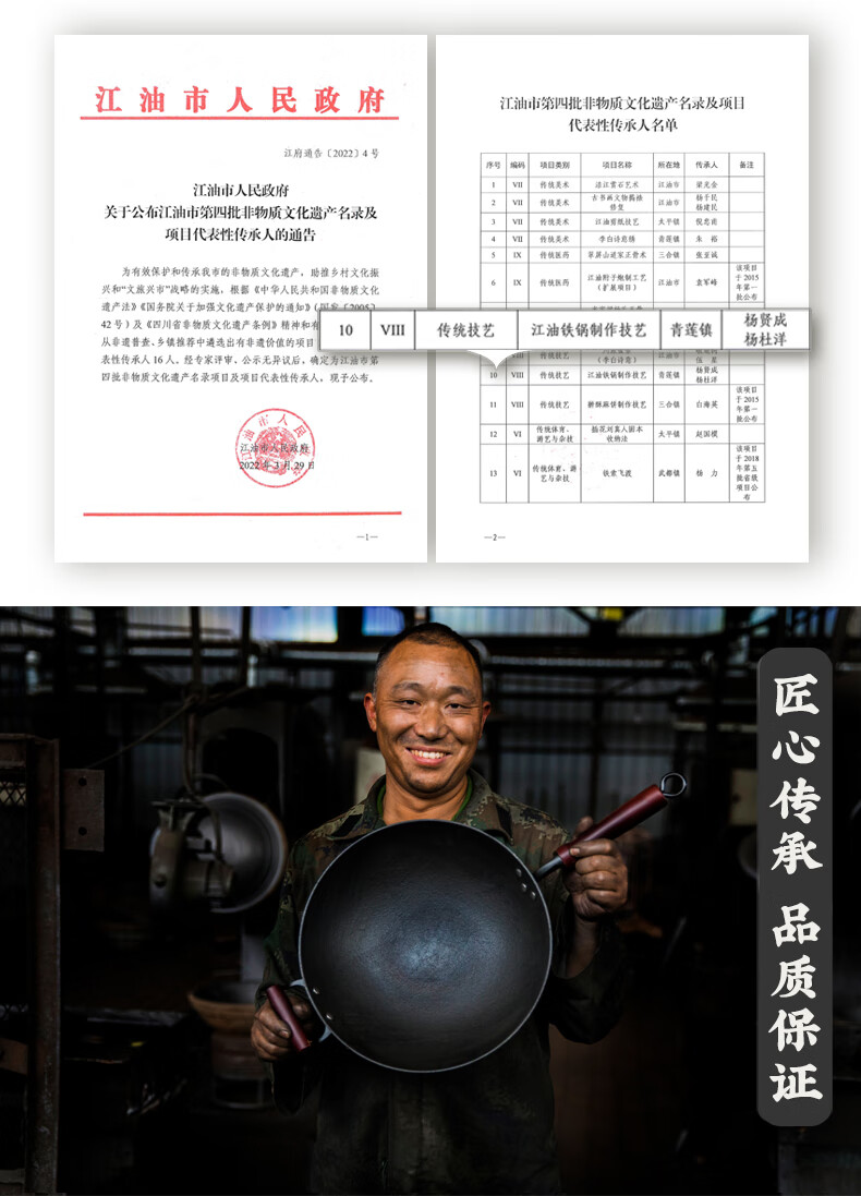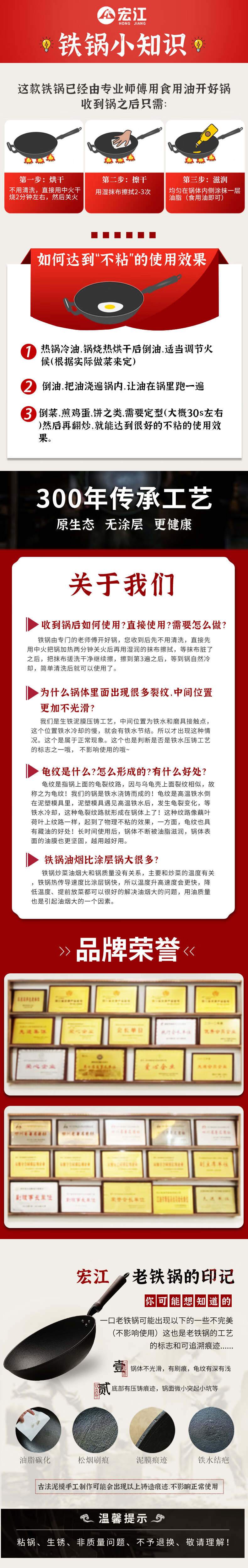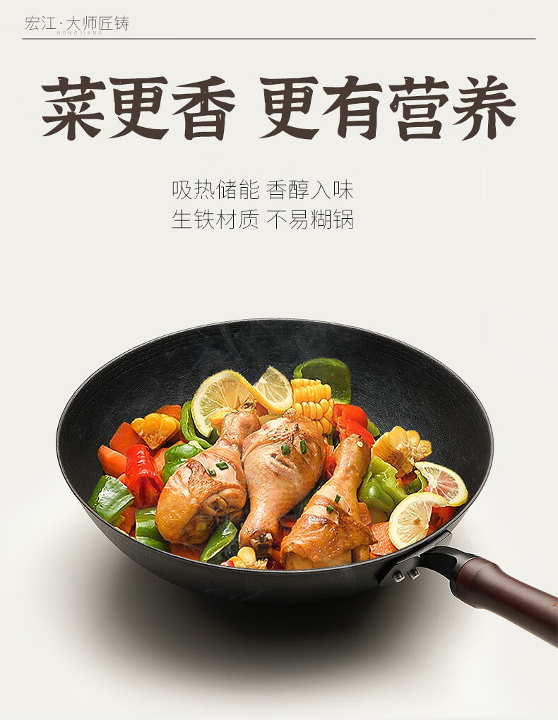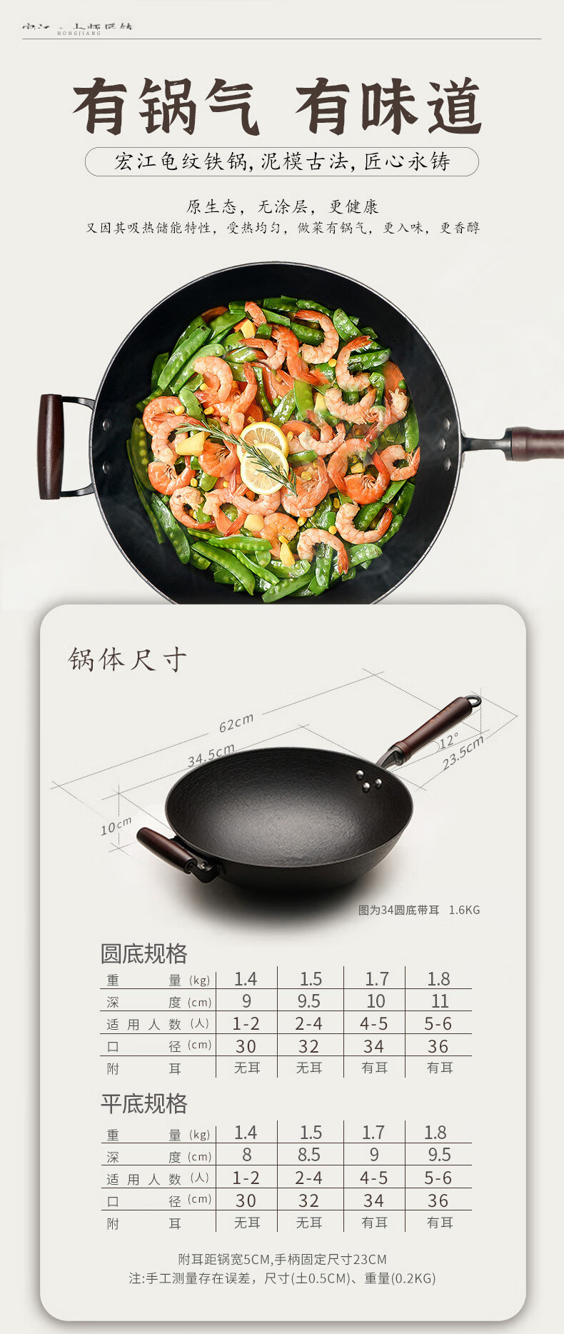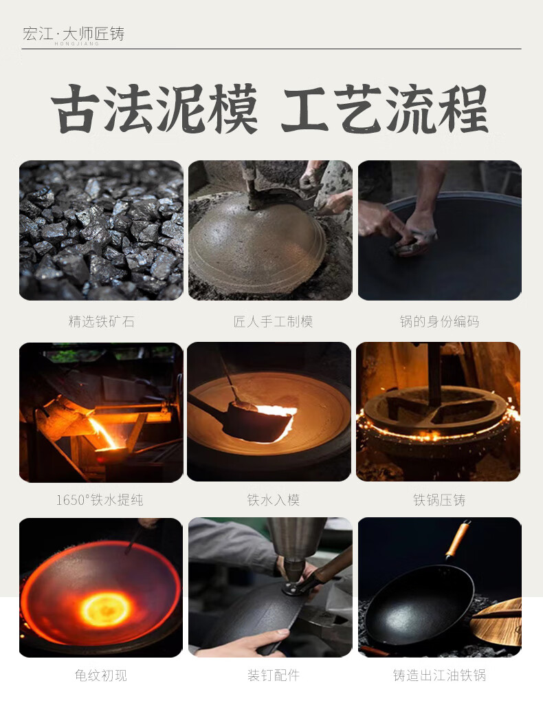 宏江 江油老式手工铁锅无涂层铁锅家用炒锅生铁圆底平底炒锅铸铁锅 32圆底无耳(大师款套装) 32cm