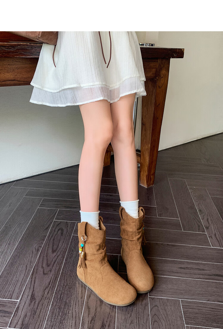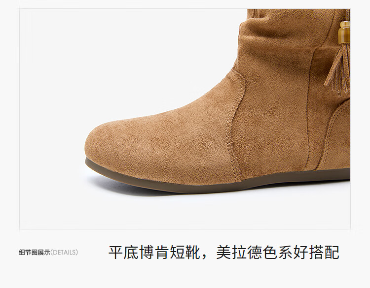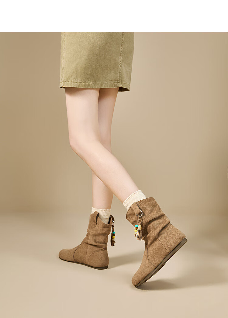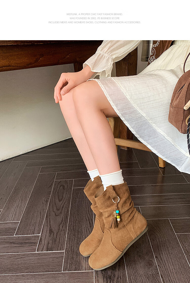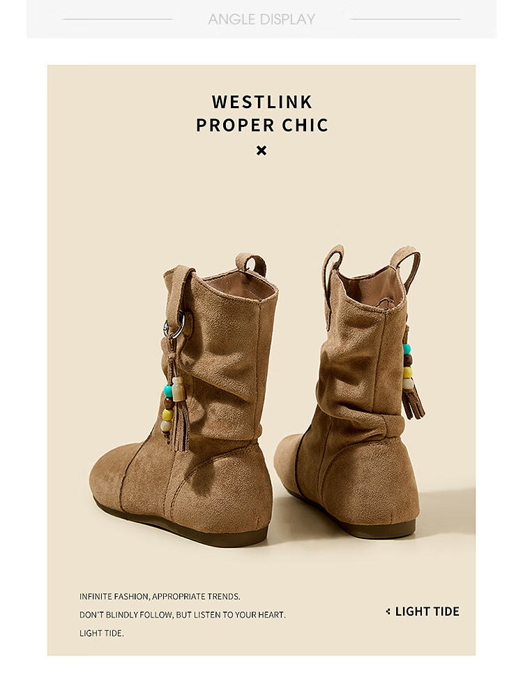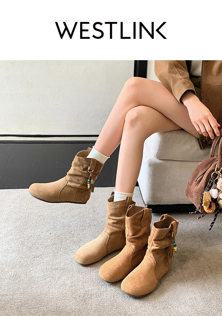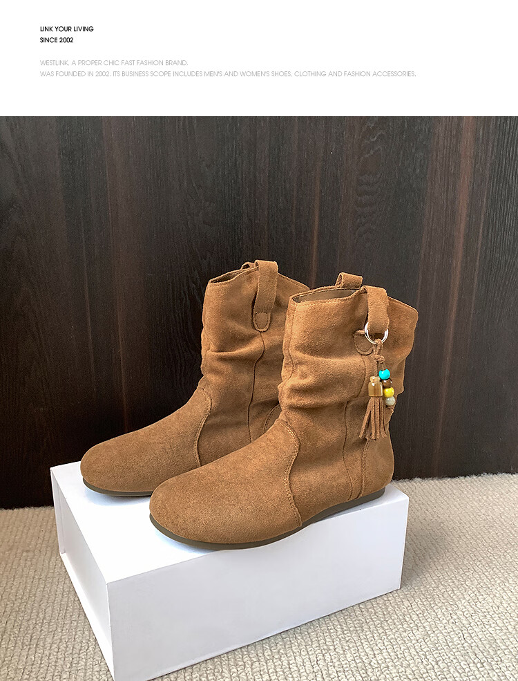 西遇(Westlink)西遇勃肯短靴女2025新款秋季复古美拉德流苏圆头平底堆堆靴西部靴 卡其色 39 (245)