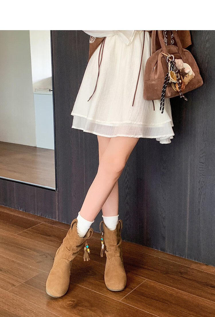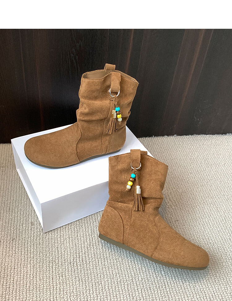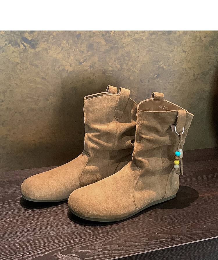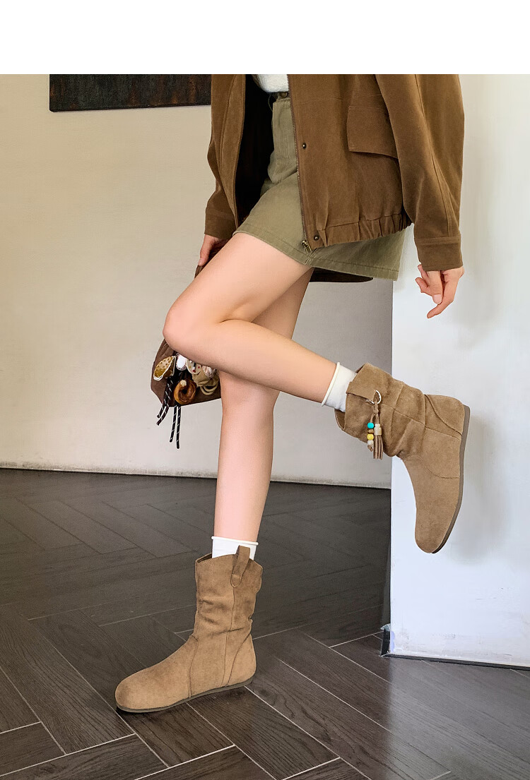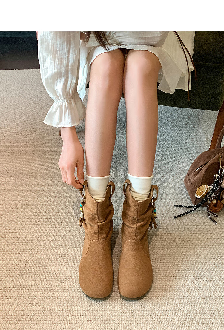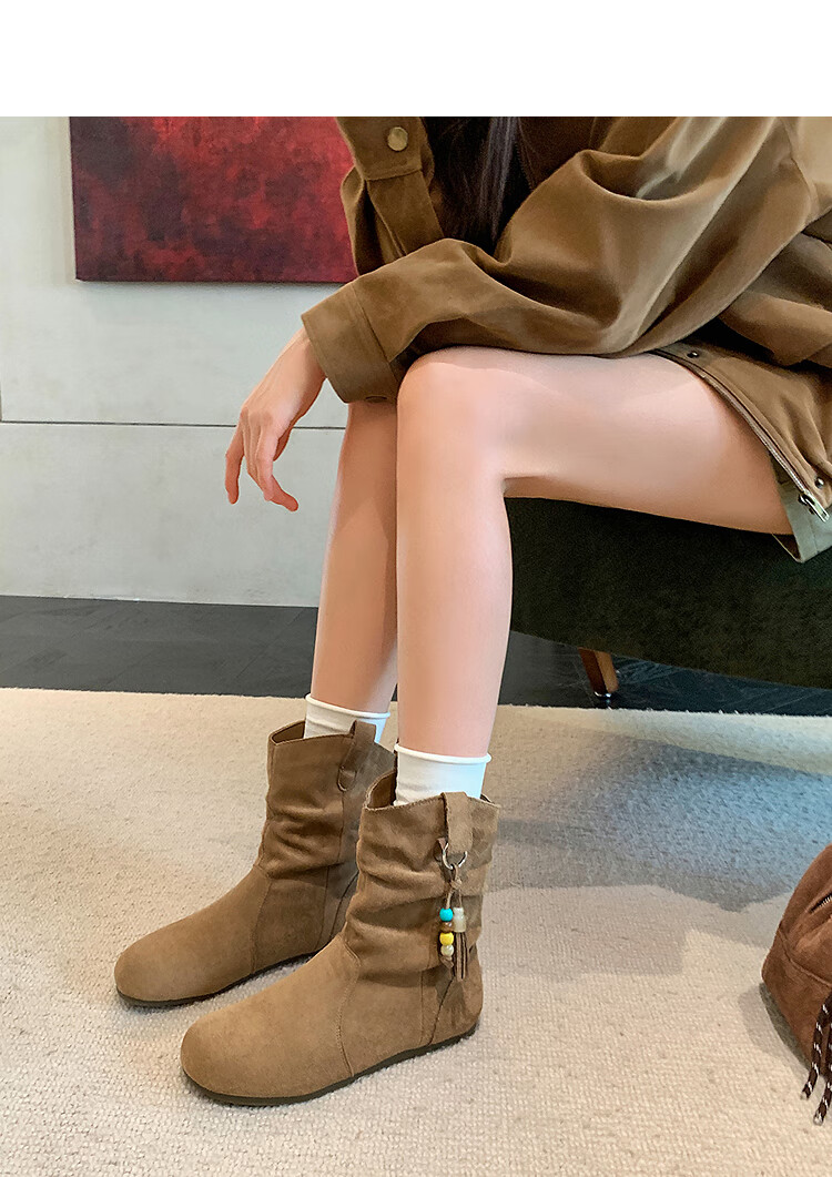 西遇(Westlink)西遇勃肯短靴女2025新款秋季复古美拉德流苏圆头平底堆堆靴西部靴 卡其色 39 (245)