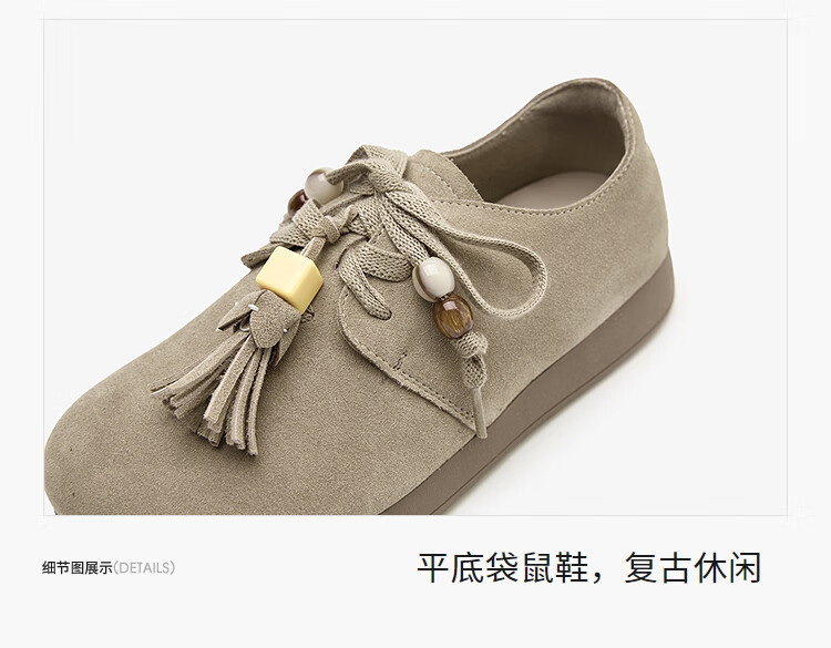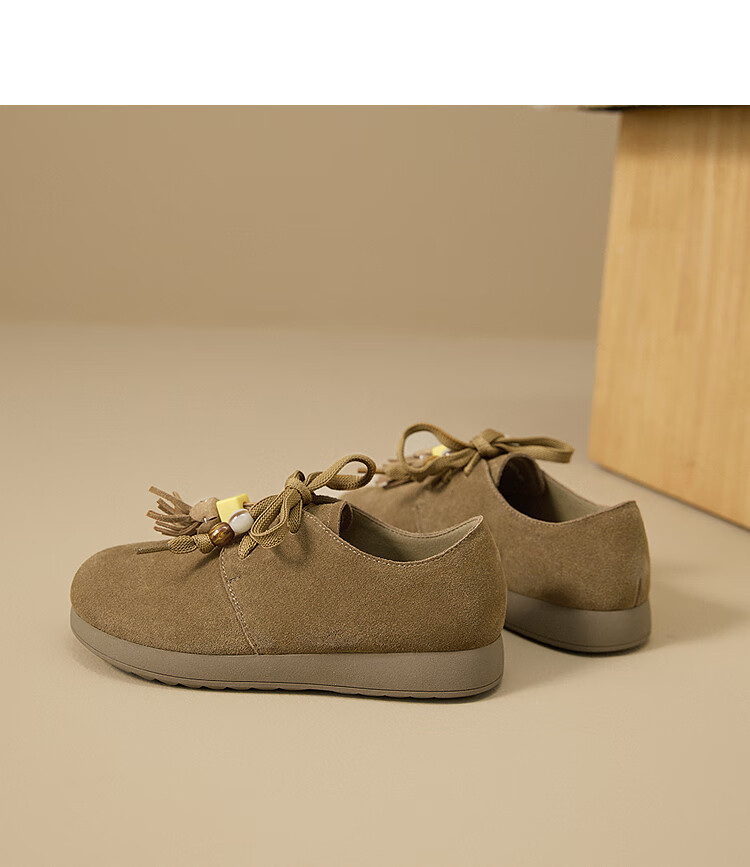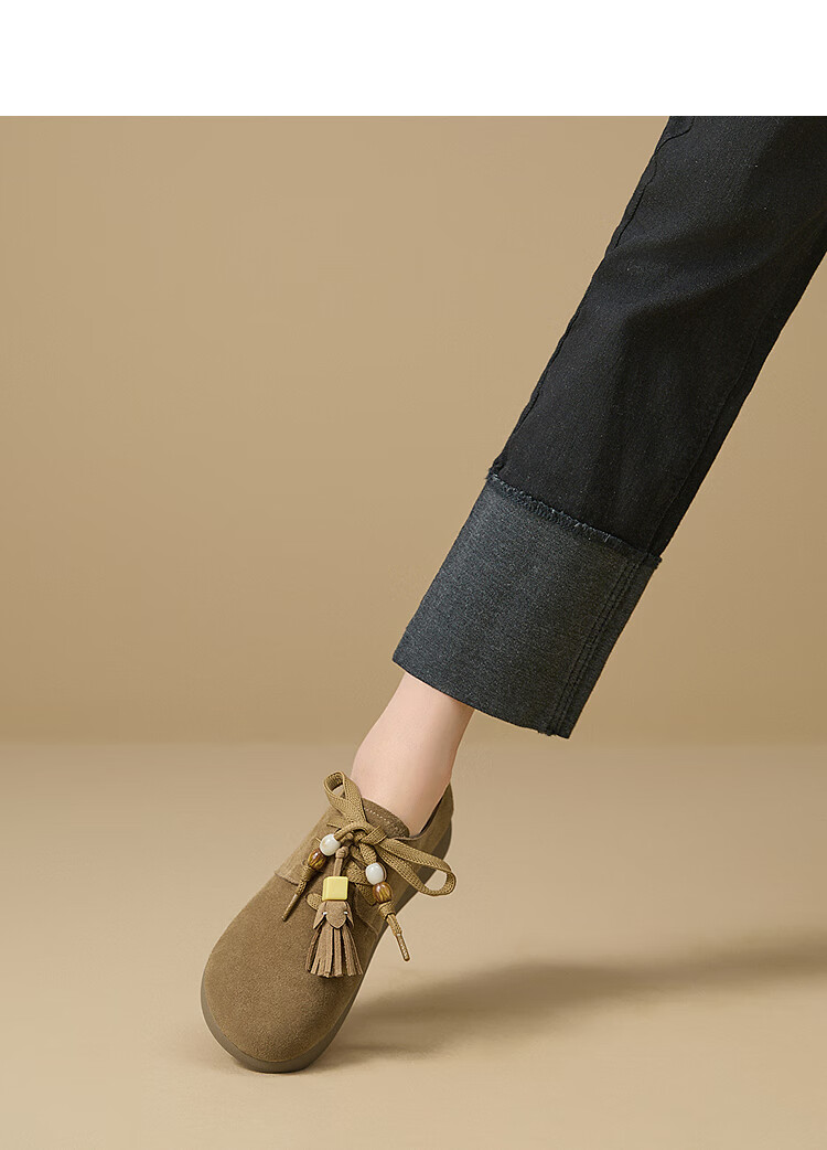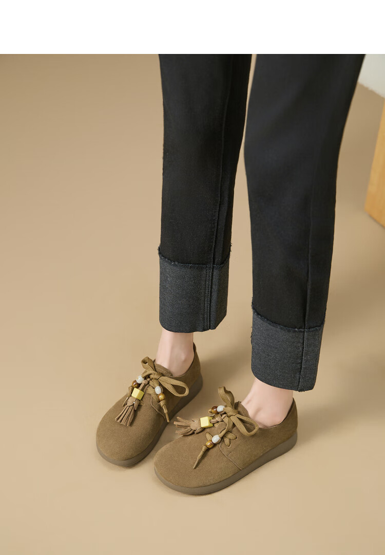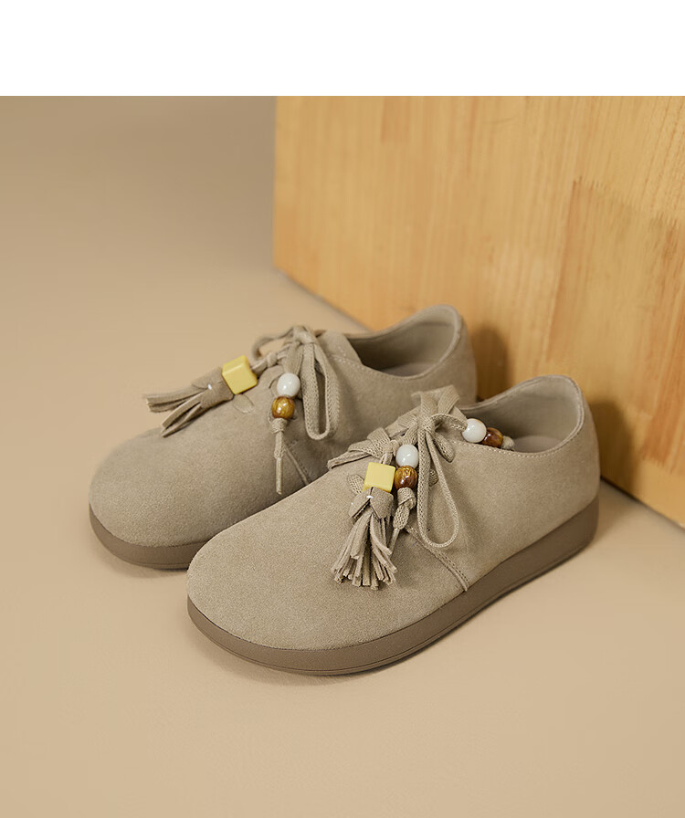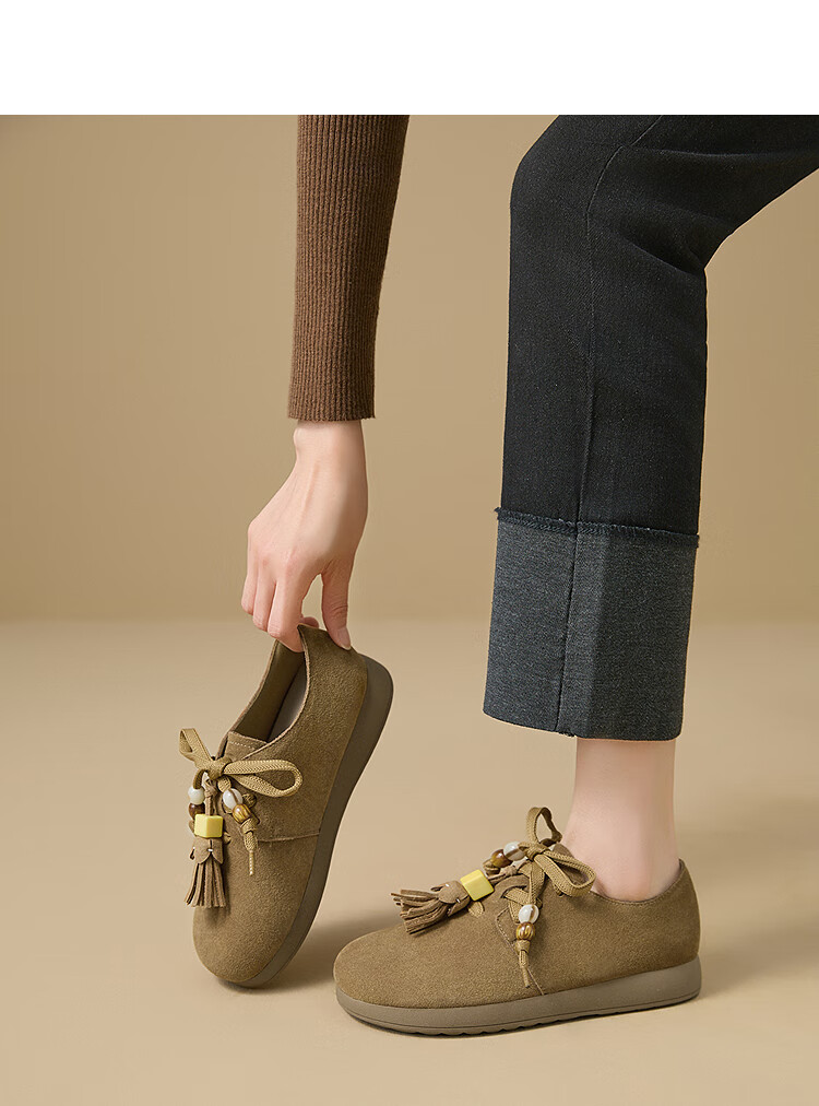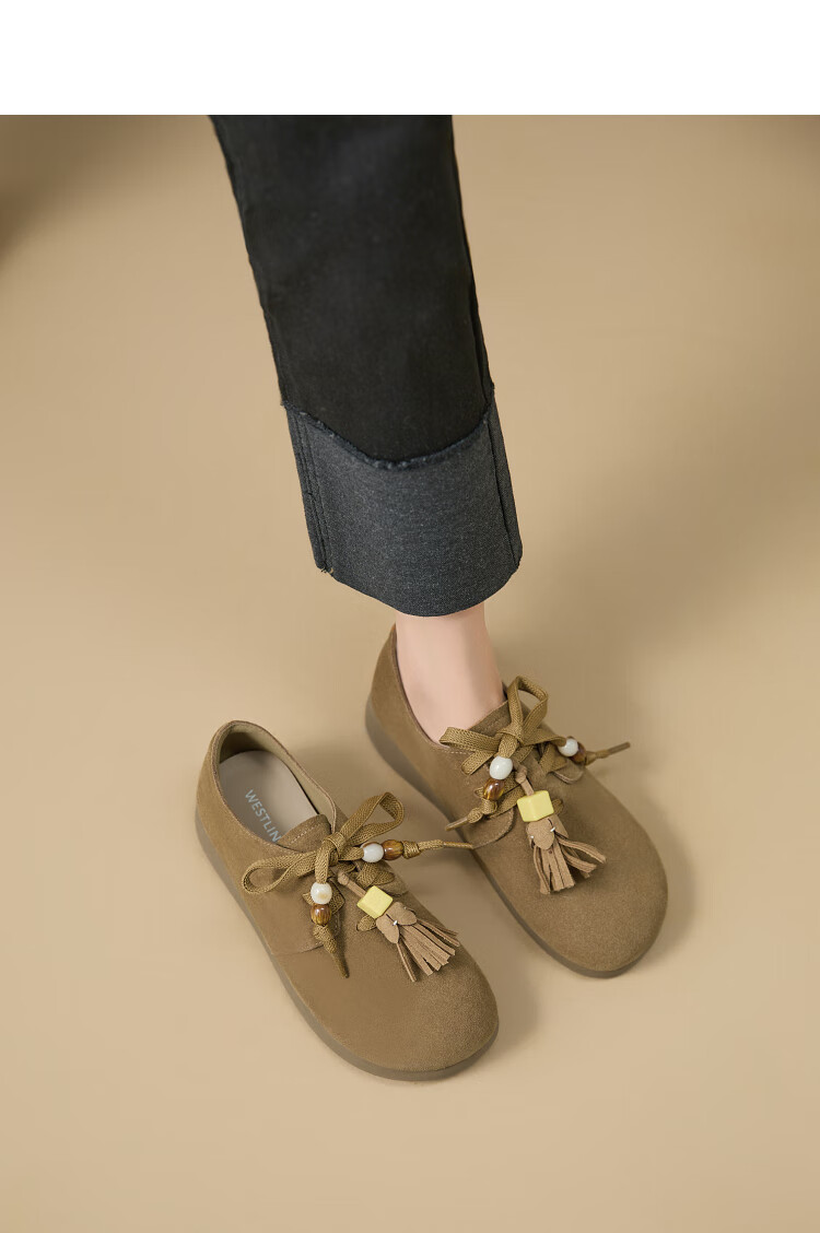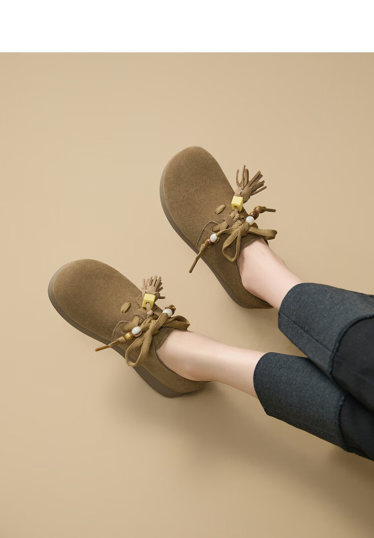 西遇复古勃肯鞋女2025新款秋季串珠流苏系带小皮鞋软底平底乐福鞋 驼色 37 (235)
