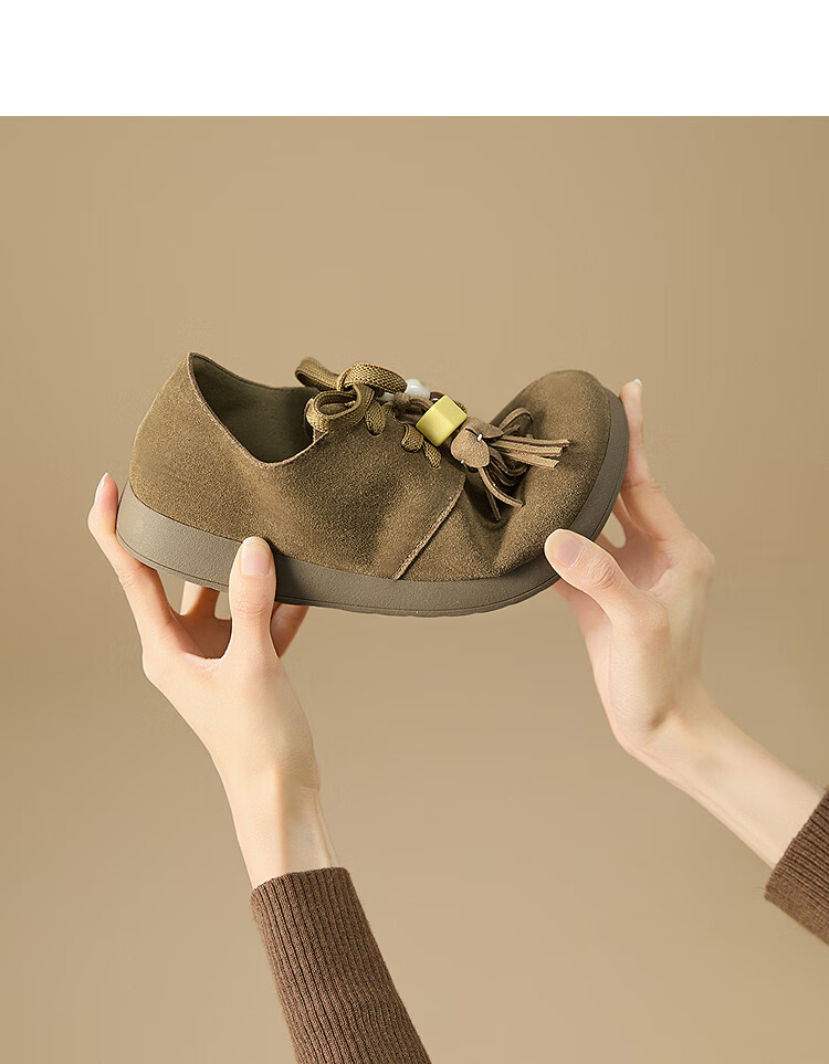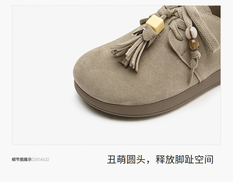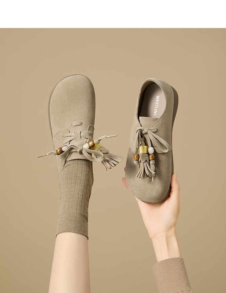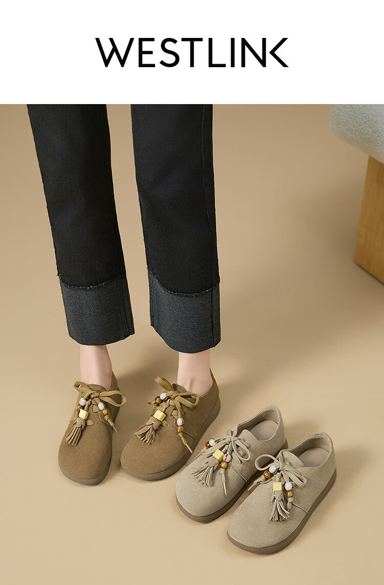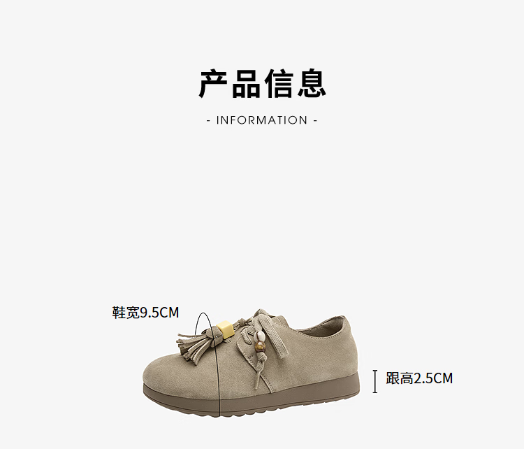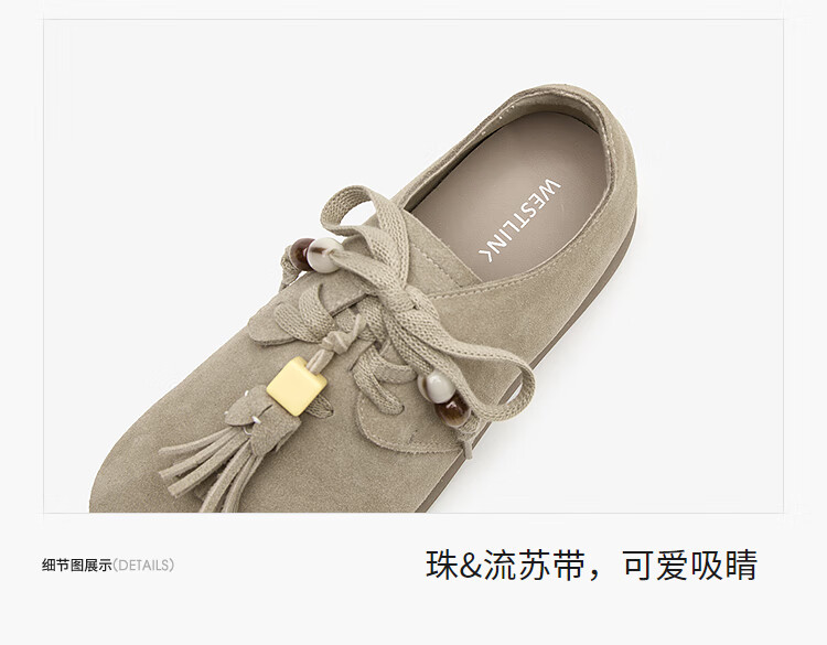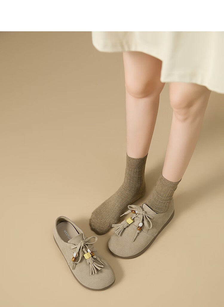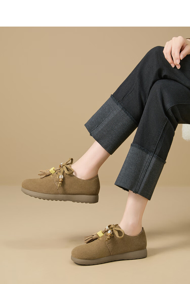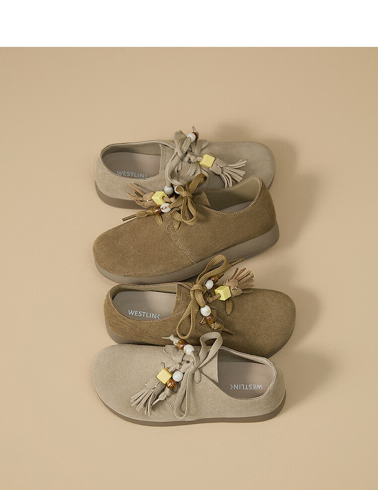 西遇复古勃肯鞋女2025新款秋季串珠流苏系带小皮鞋软底平底乐福鞋 驼色 37 (235)