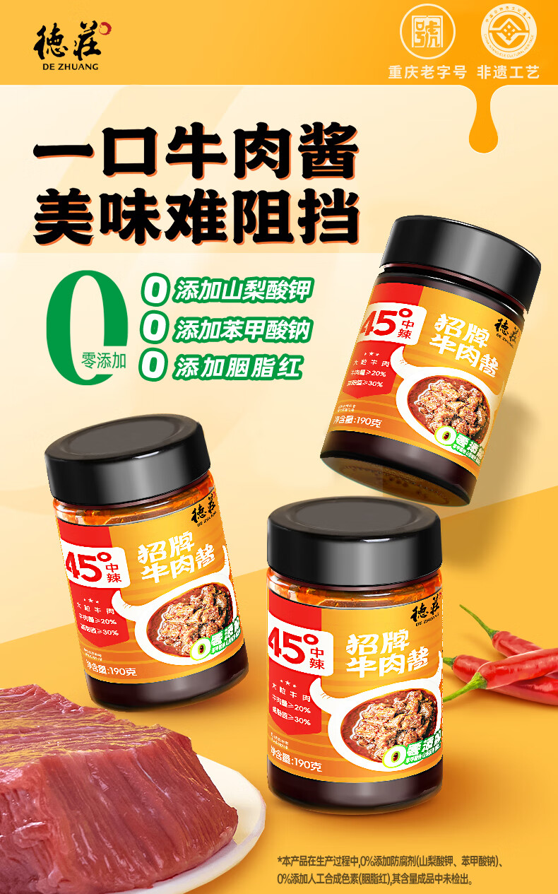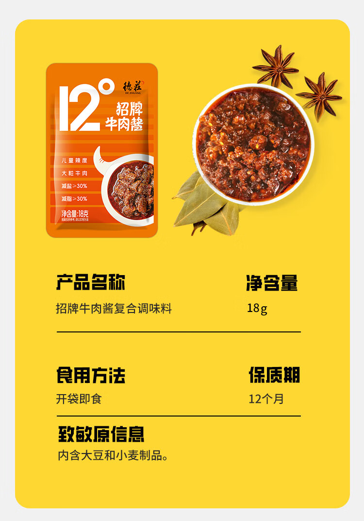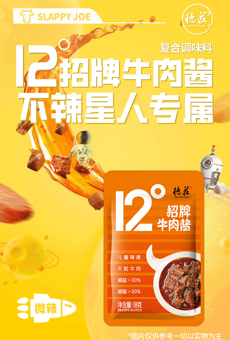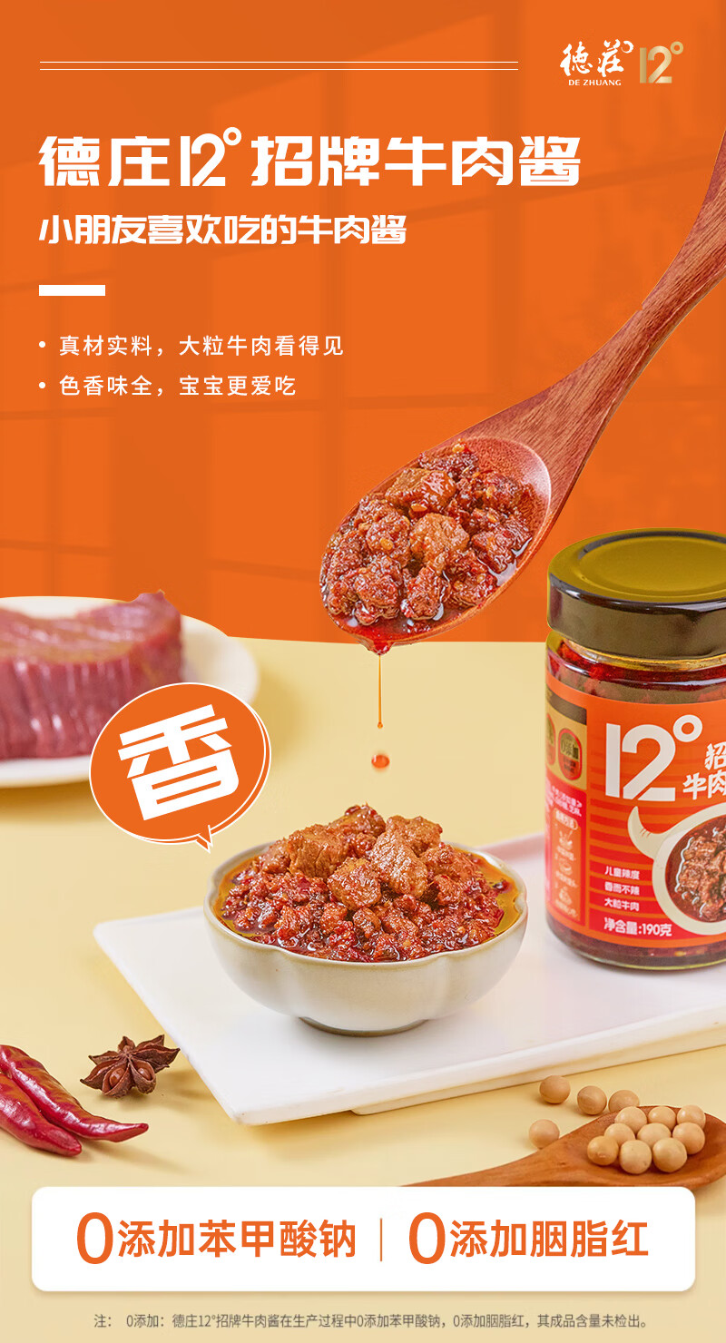 德庄 招牌12°微辣牛肉酱190g 线下商超同款 下饭菜拌饭夹馒头酱0添加 【南航同款】12°牛肉酱18g*10袋