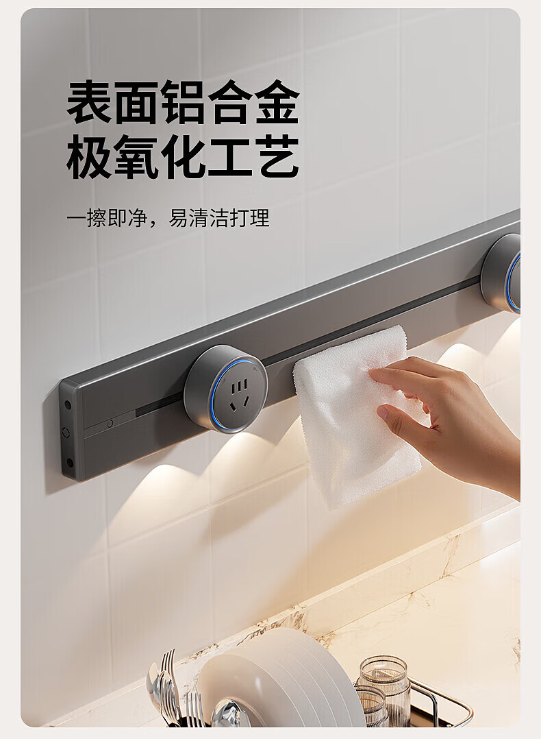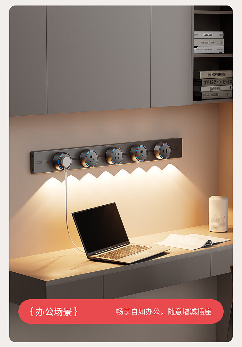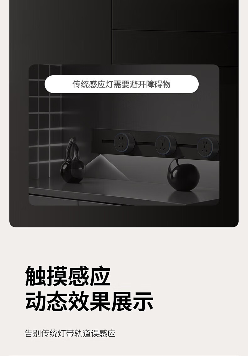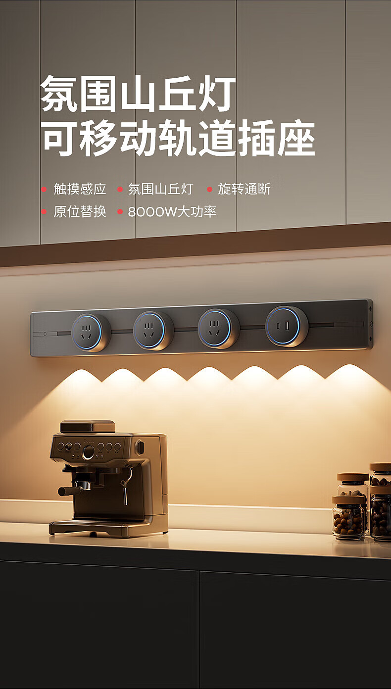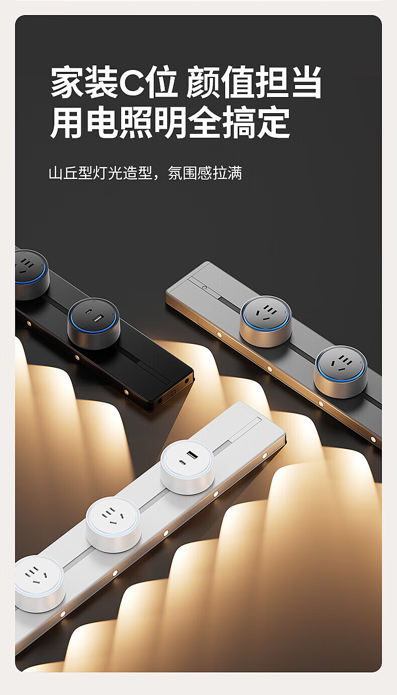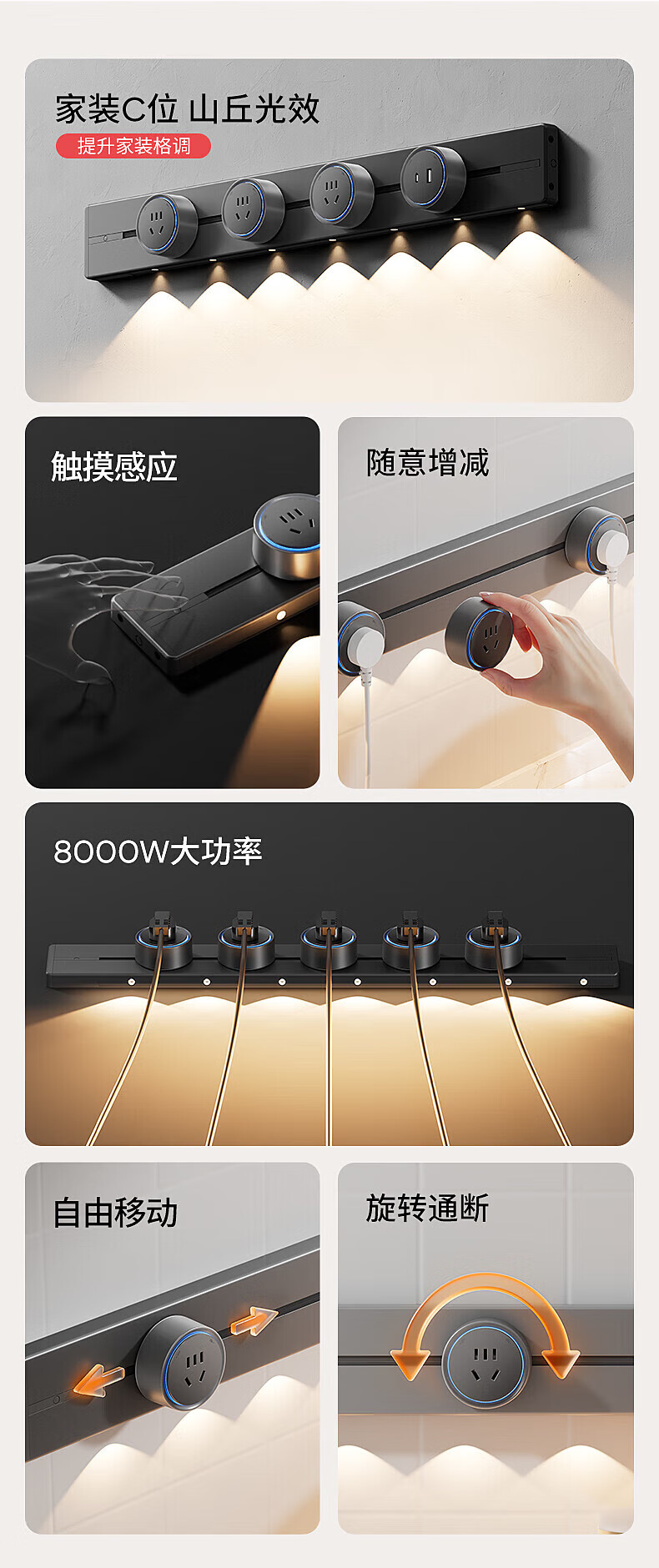 国际电工明装山丘感应灯轨道插座可移动壁挂式滑动电源餐边柜电力导轨 黑色(感应+山丘灯)50cm+3个五孔