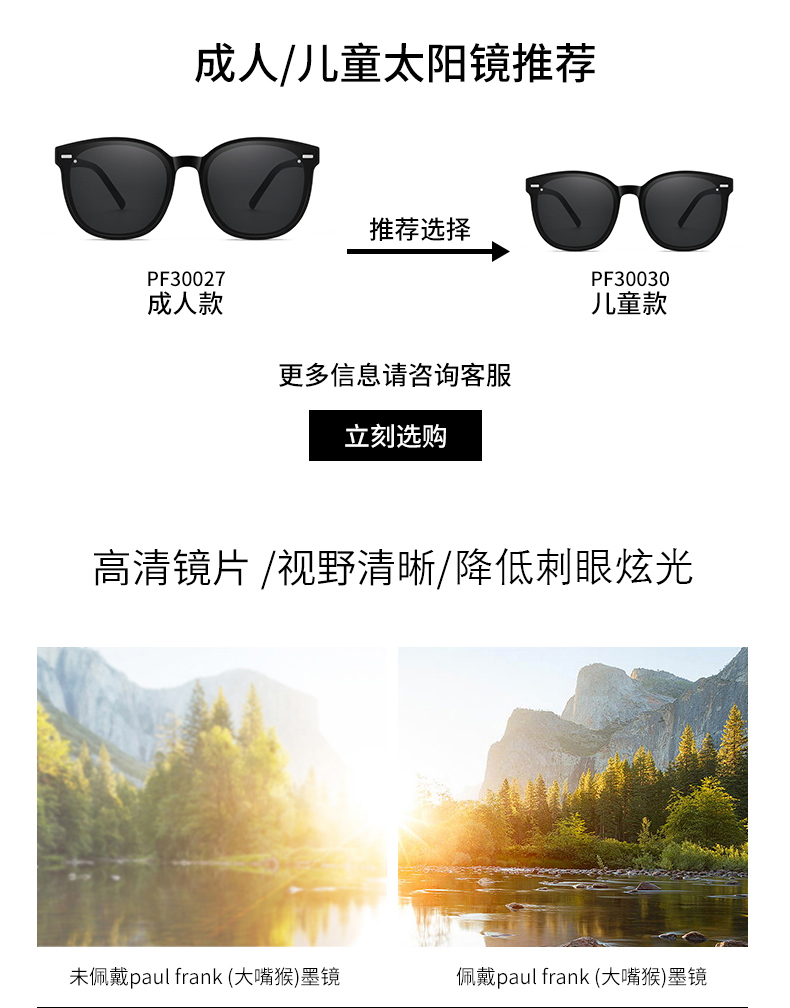 Paul Frank大嘴猴儿童太阳镜成人墨镜女亲子同款男女宝宝墨镜小孩成人防紫外线防晒 PF30030