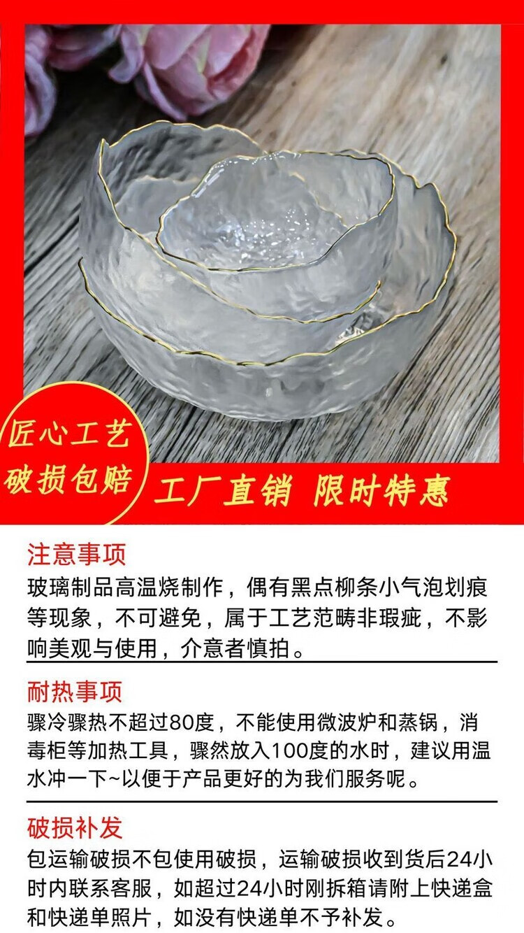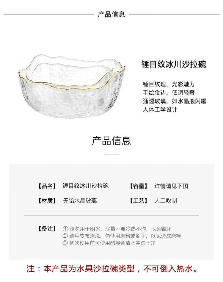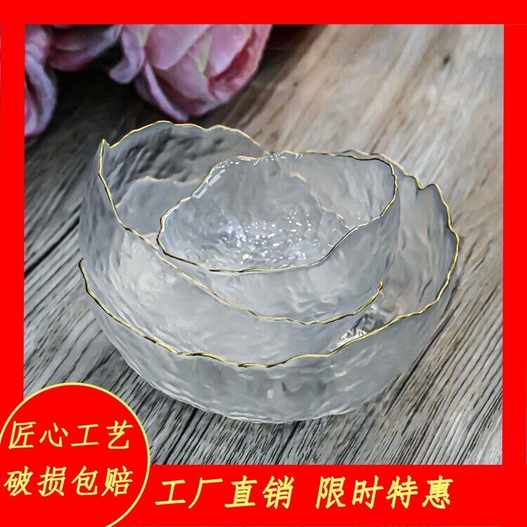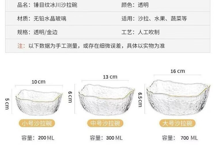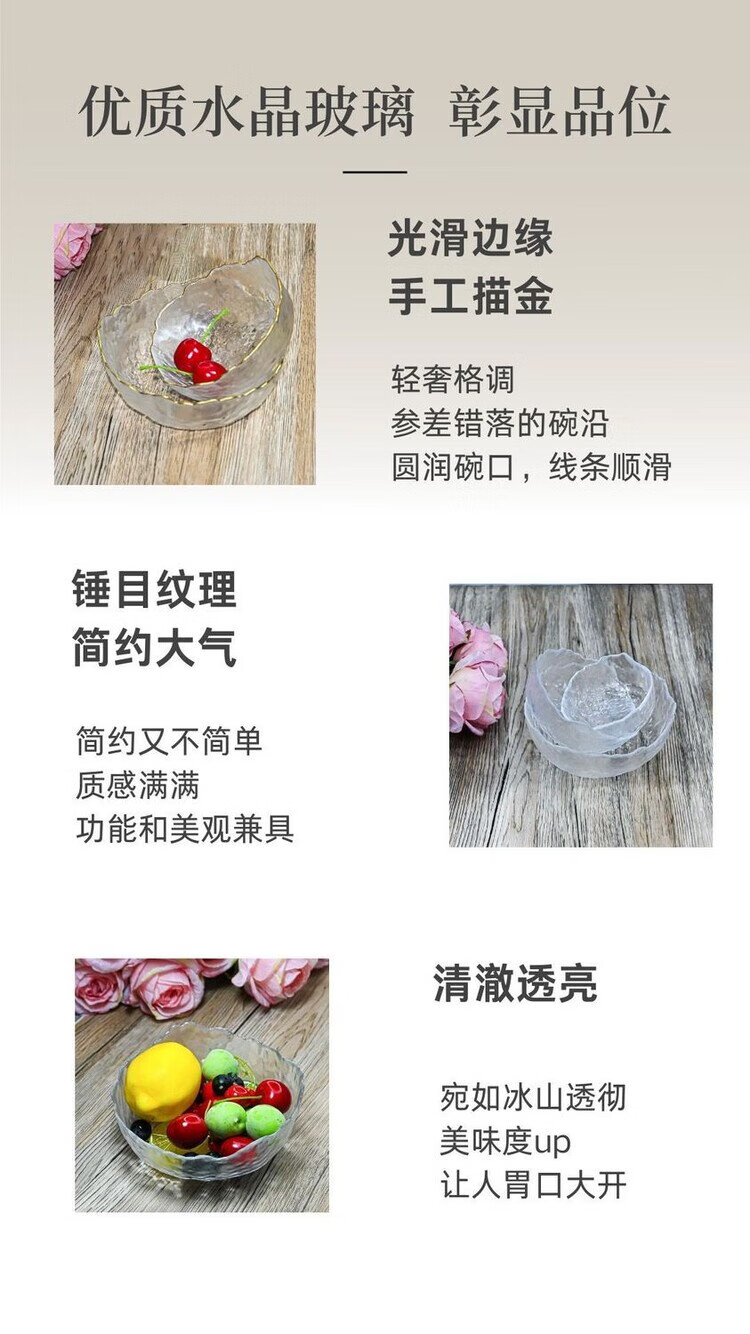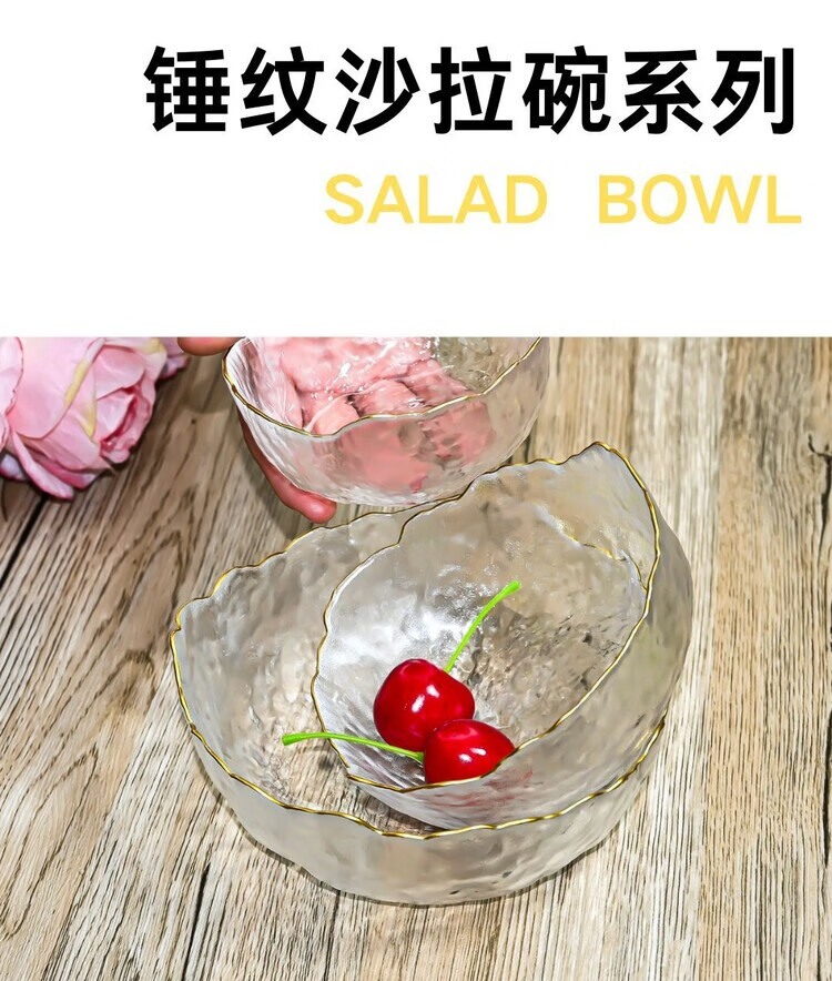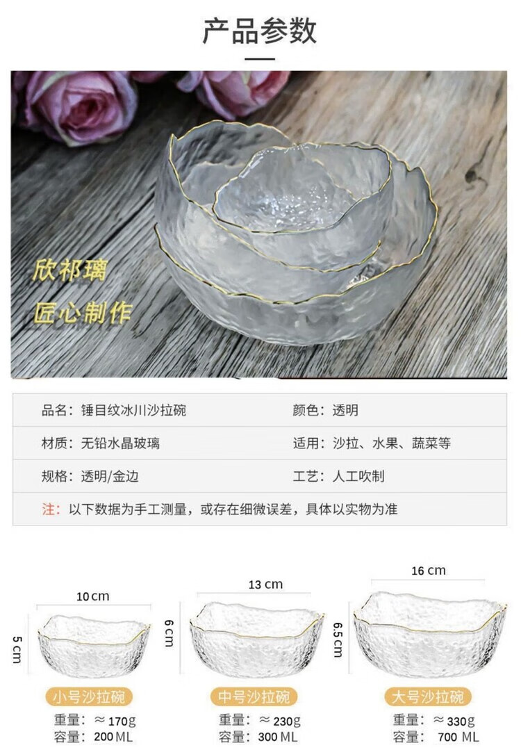 DEATKN日式锤纹金边玻璃碗透明沙拉碗家用水果碗创意水果盘网红餐具套装 直径:大号16cm中号13cm小号10cm 【加厚金边碗】锤纹三件套大中小