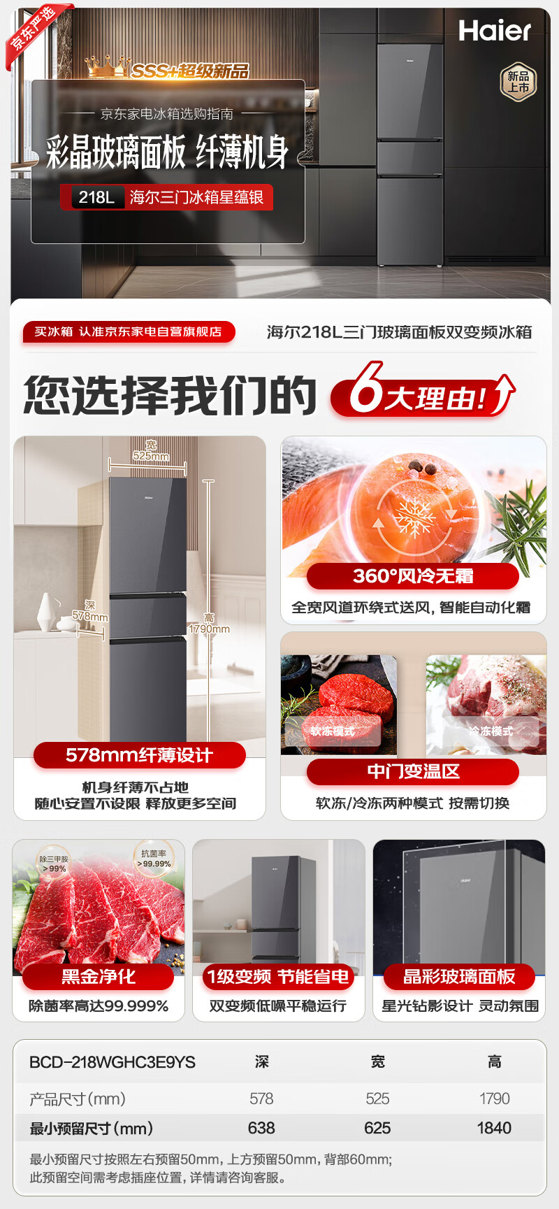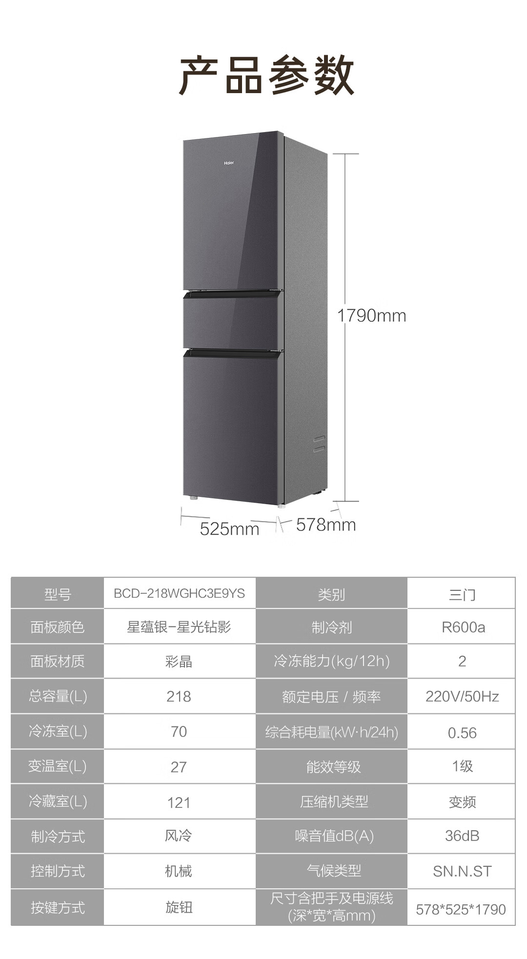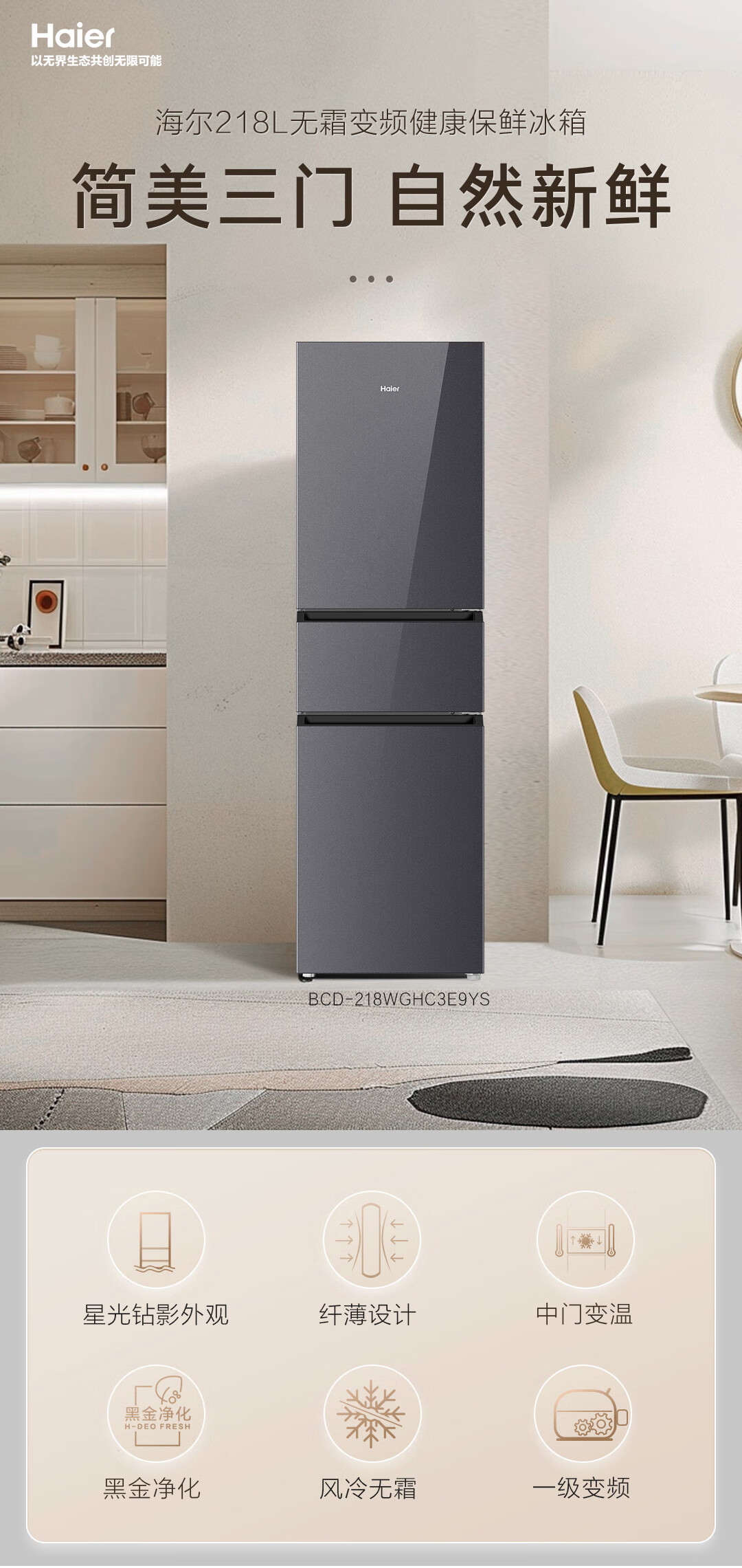 海尔(Haier)冰箱218L三门玻璃面板新一级能效双变频三开门风冷黑金净化软冷冻家用冰箱大容量BCD-218WGHC3E9YS