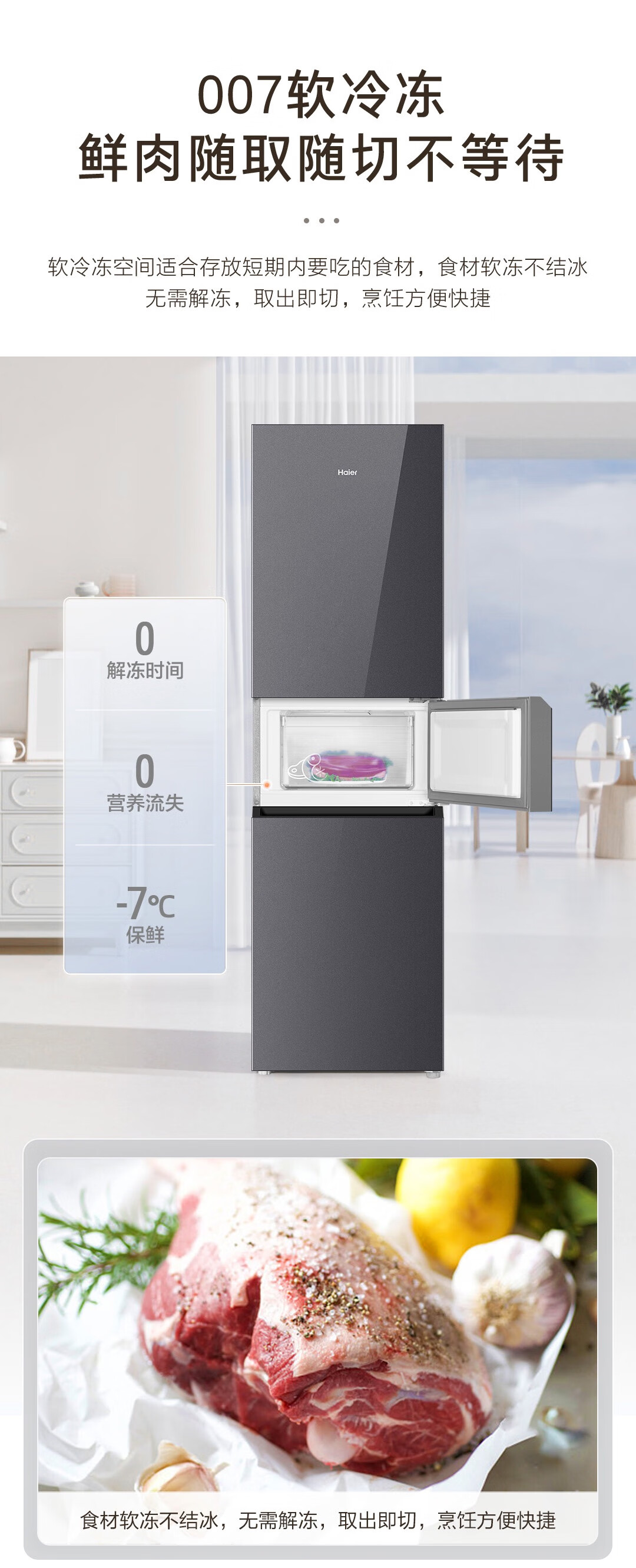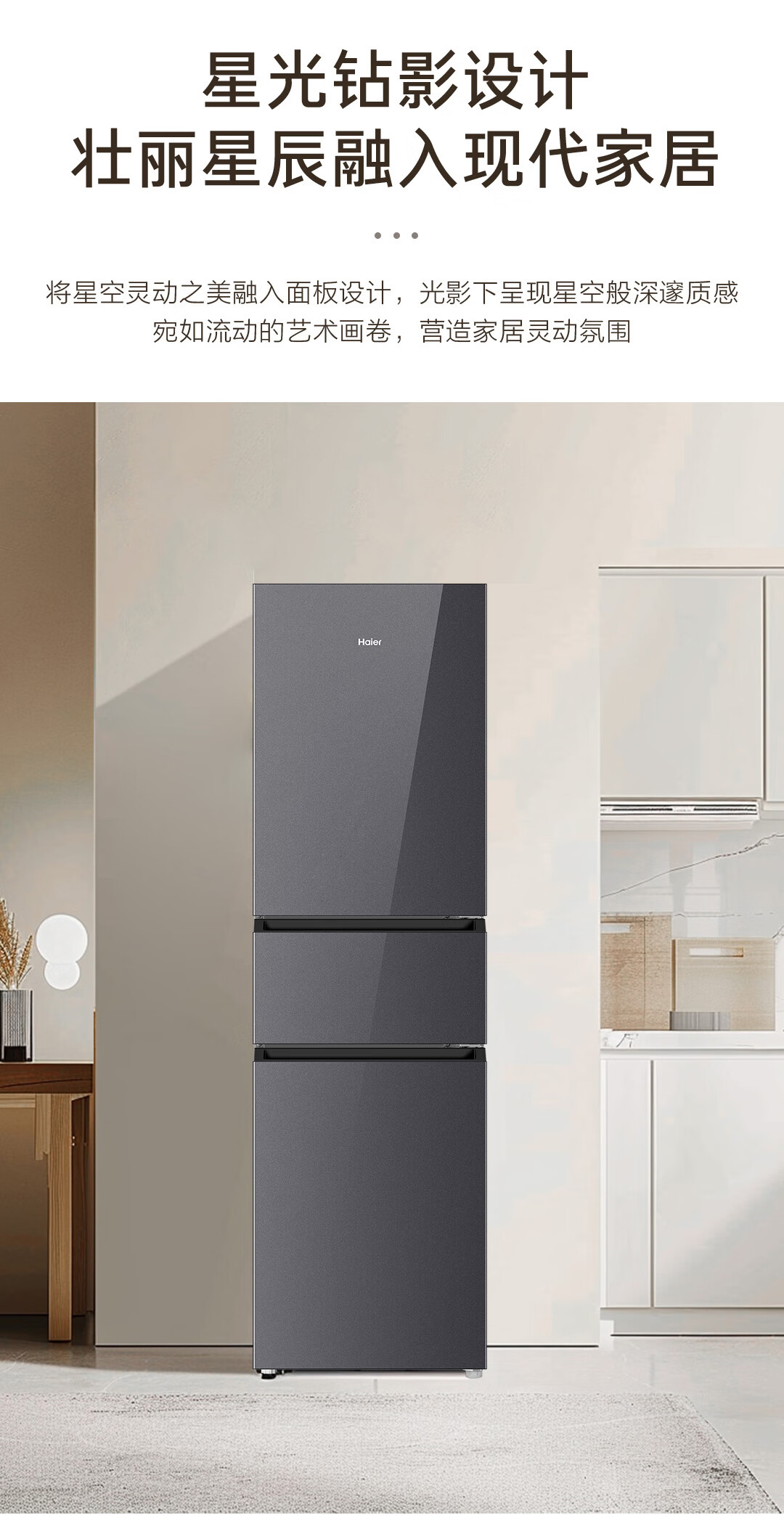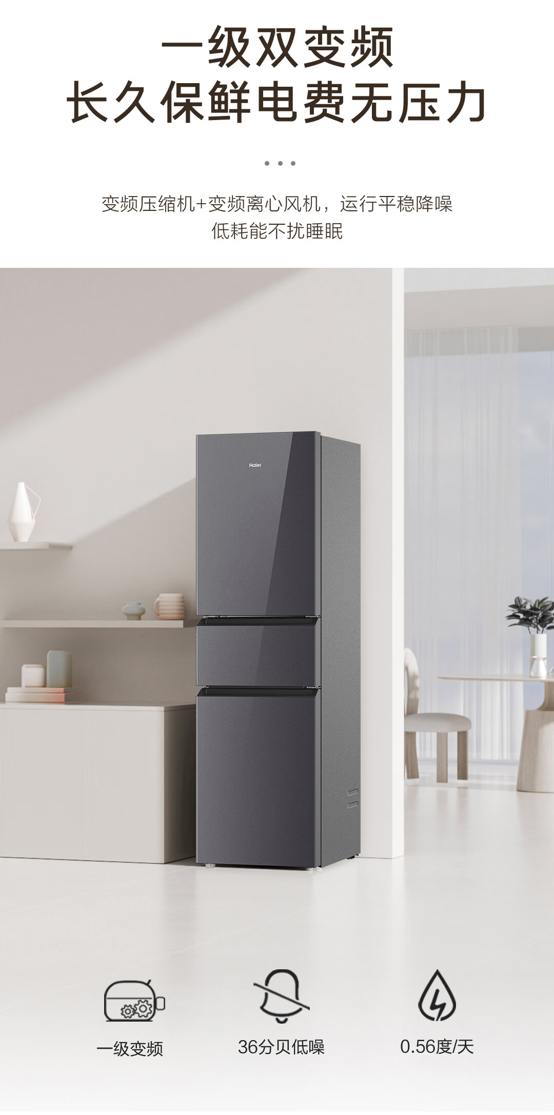 统帅(Leader)海尔出品三门三温三开门家用电冰箱218升 一级双变频风冷无霜黑金净化宿舍租房办公室国家补贴20% 【省电王】2天仅约1度电 冰箱