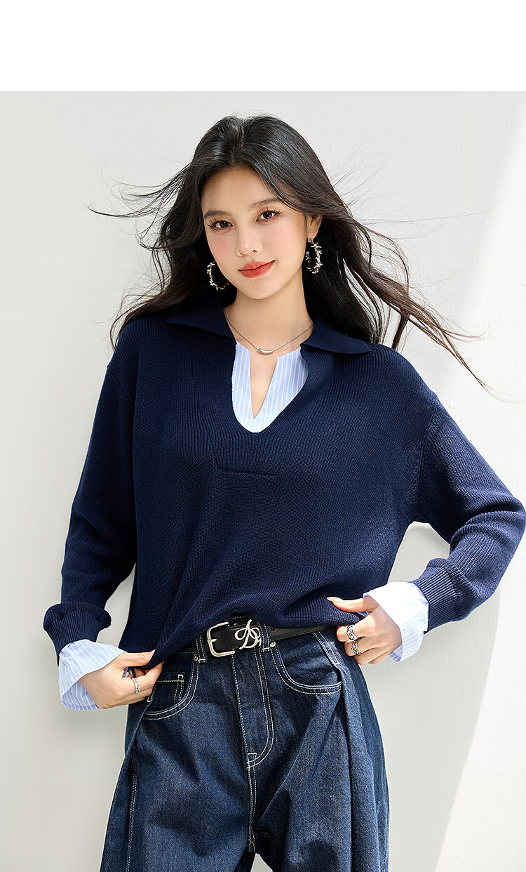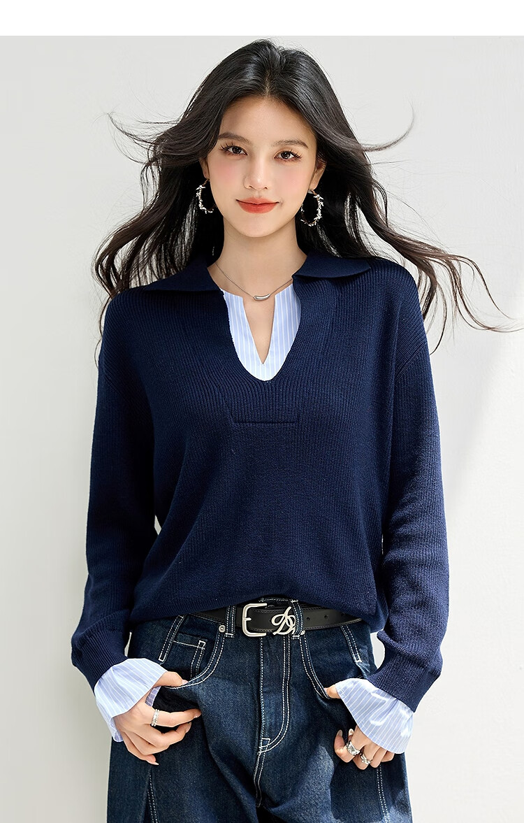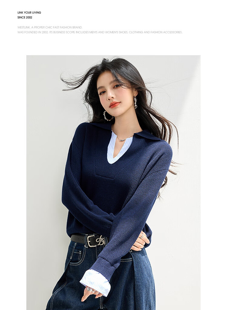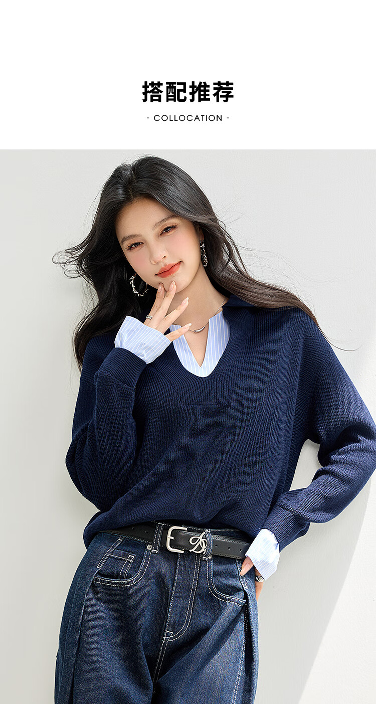 西遇(Westlink)西遇假两件长袖针织衫女2025年秋季新款翻领条纹拼接蓝色套头毛衣 蓝色 (预售15天) M (160)