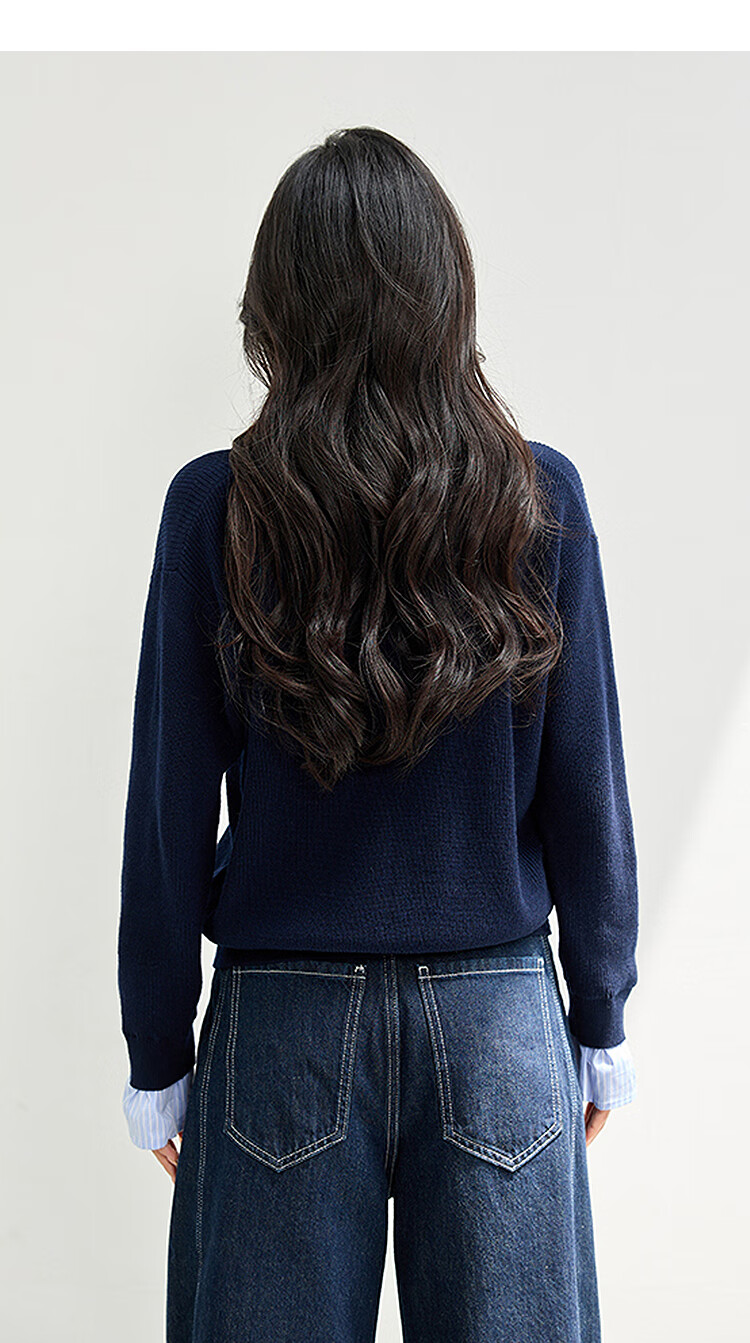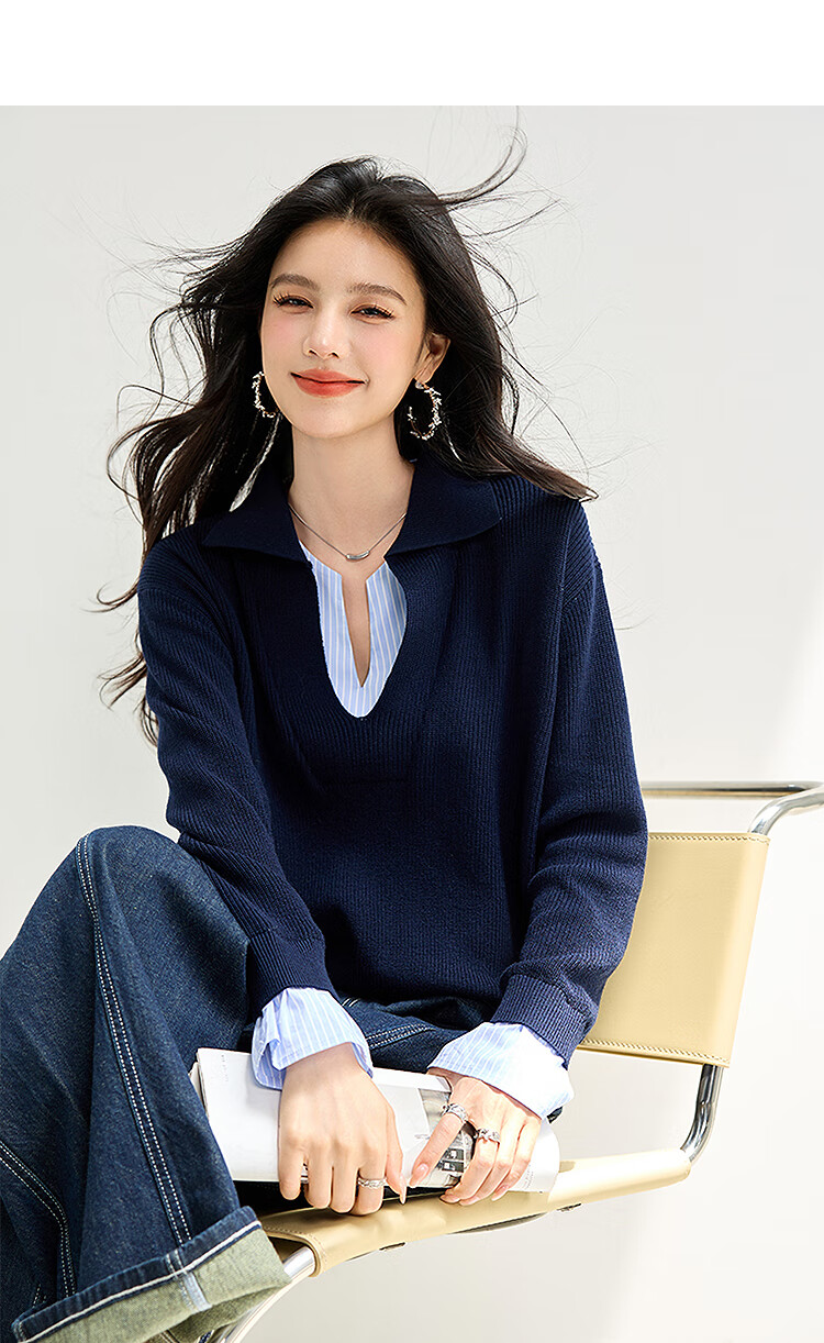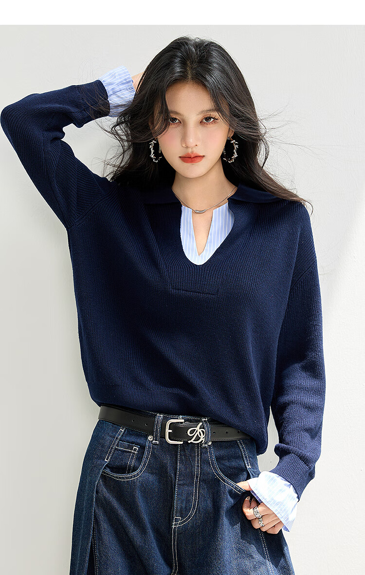 西遇(Westlink)西遇假两件长袖针织衫女2025年秋季新款翻领条纹拼接蓝色套头毛衣 蓝色 (预售15天) M (160)