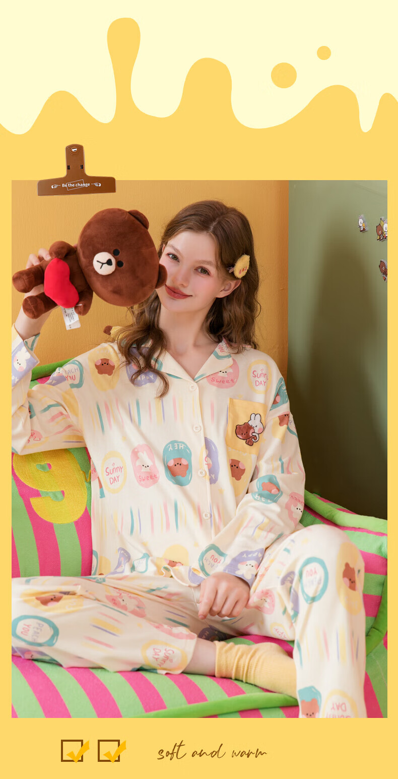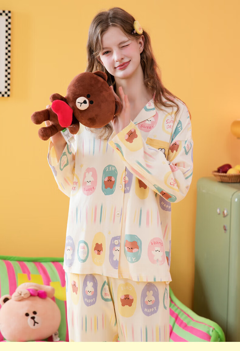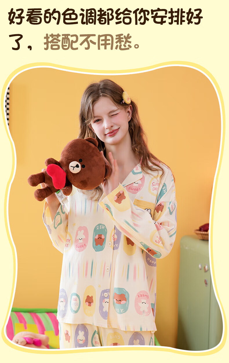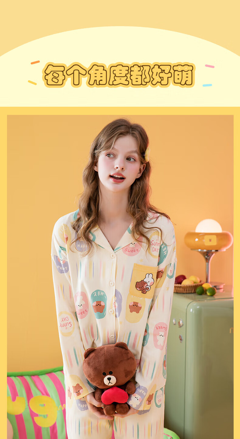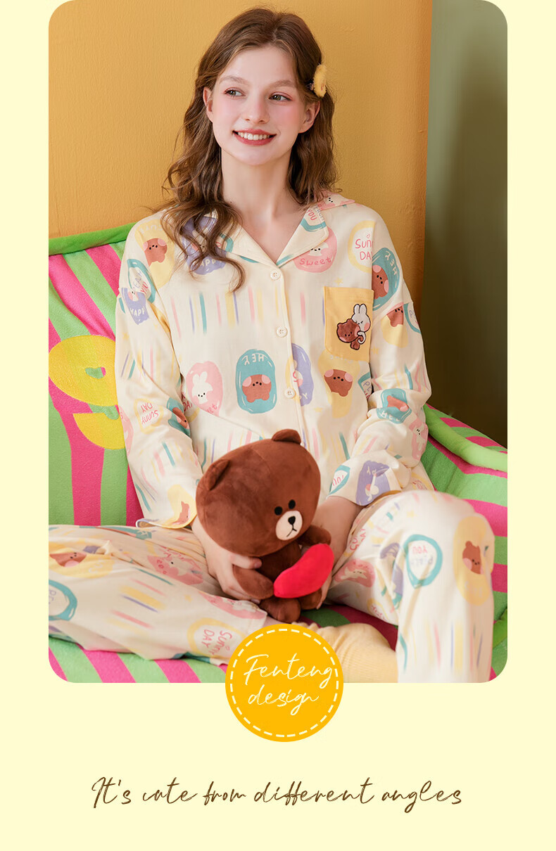 芬腾睡衣女生【布朗熊IP】40支纯棉翻领长袖可爱女士家居服套装 浅黄 M