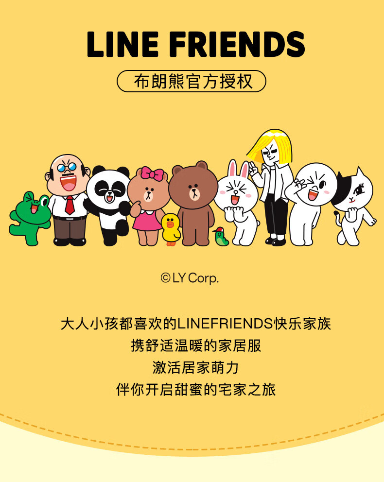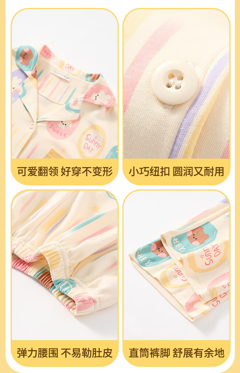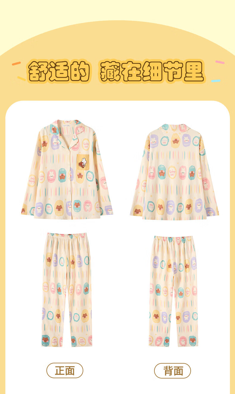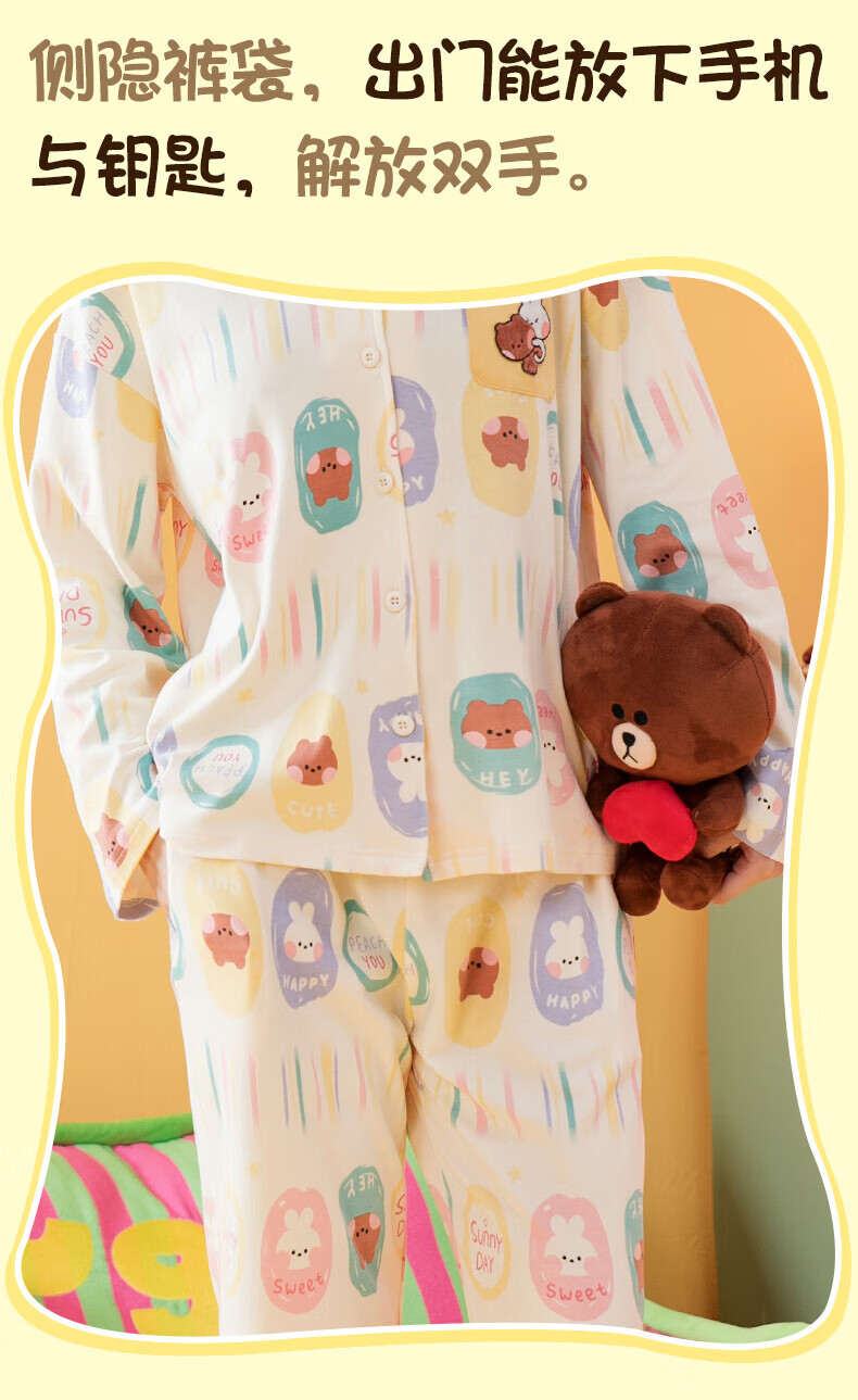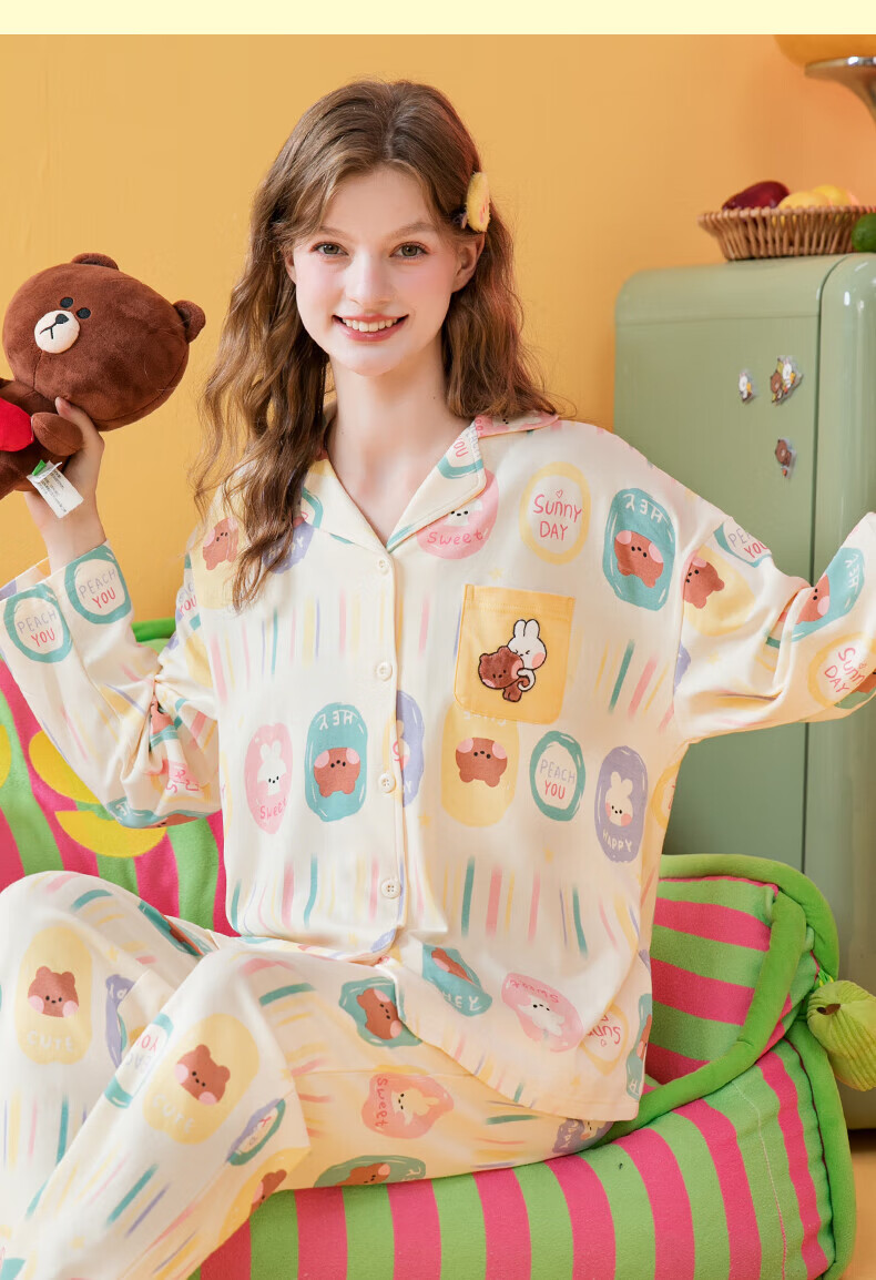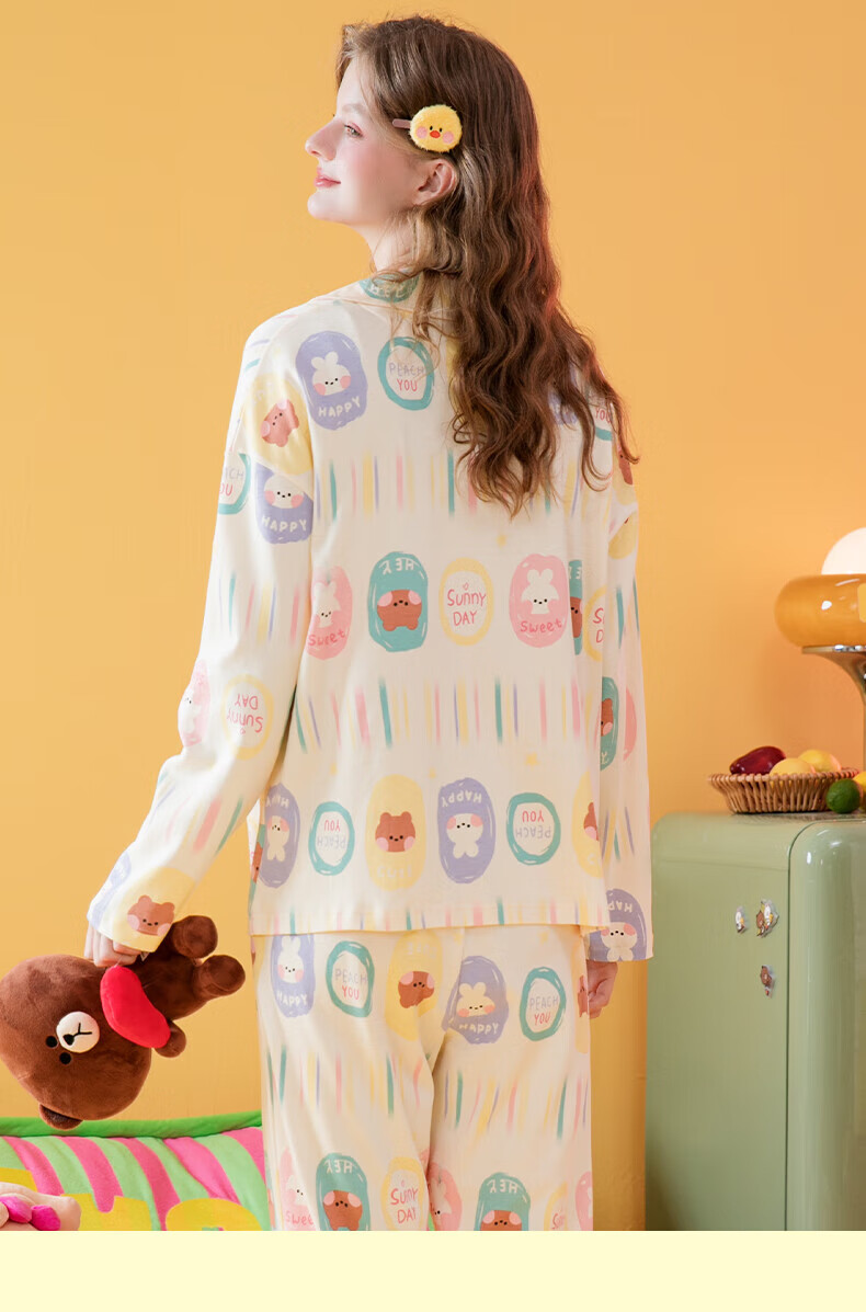 芬腾睡衣女生【布朗熊IP】40支纯棉翻领长袖可爱女士家居服套装 浅黄 M