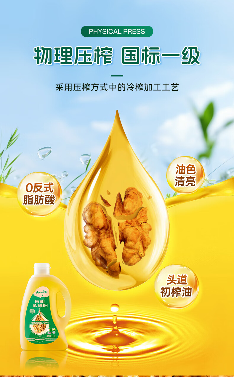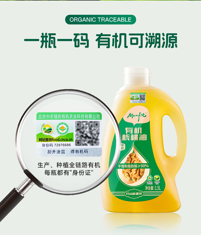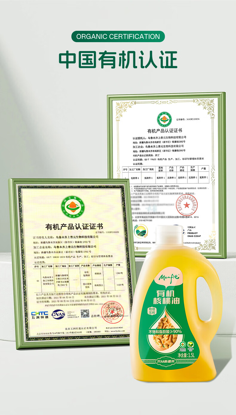 Monfit新疆有机核桃油1.5L磨砂瓶 一级物理冷榨 食用油