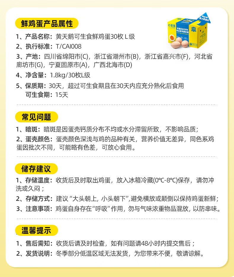 黄天鹅可生食鸡蛋 30枚L级大蛋/3.6斤礼盒装 生鲜鸡蛋源头直发 无抗生素