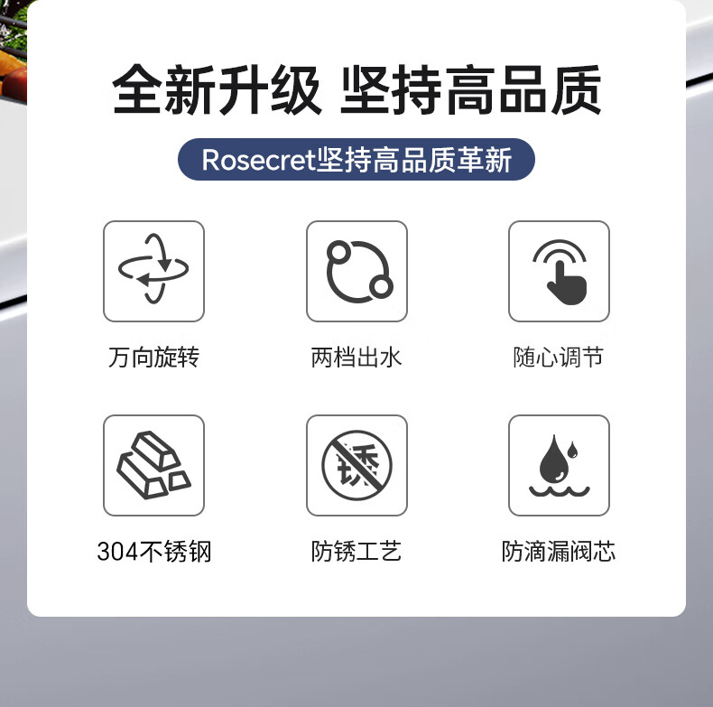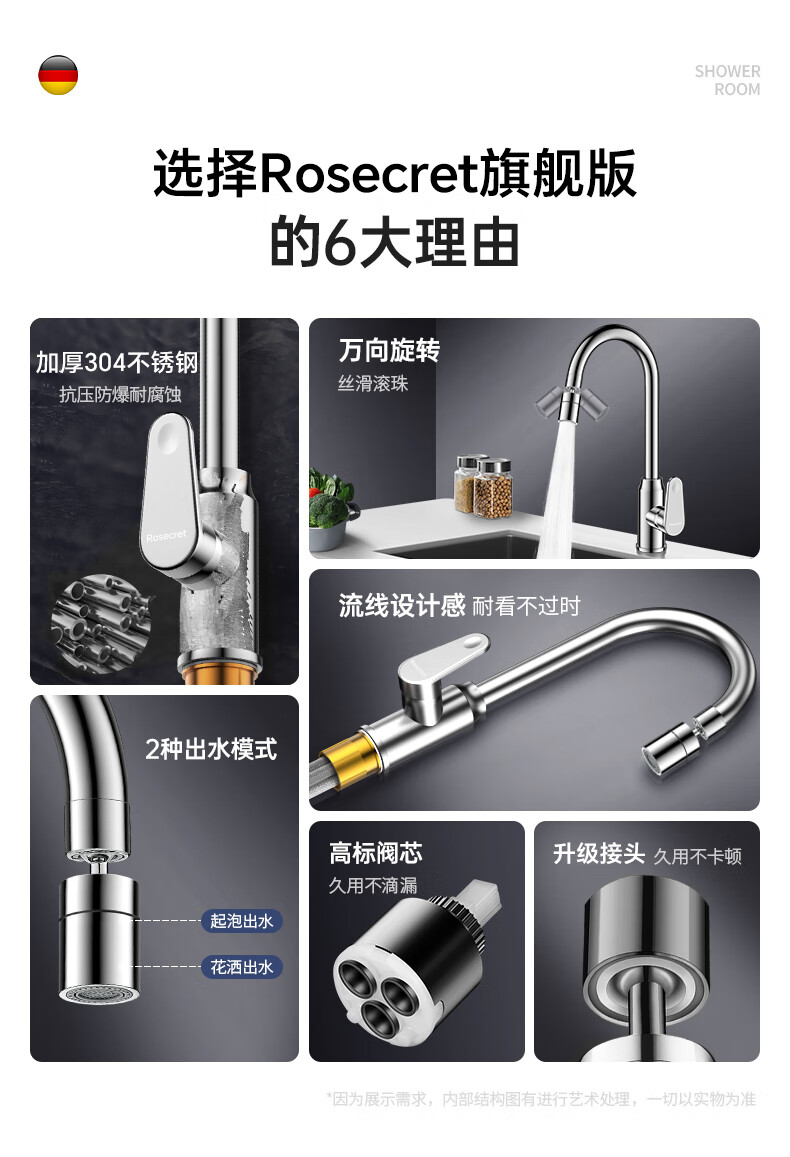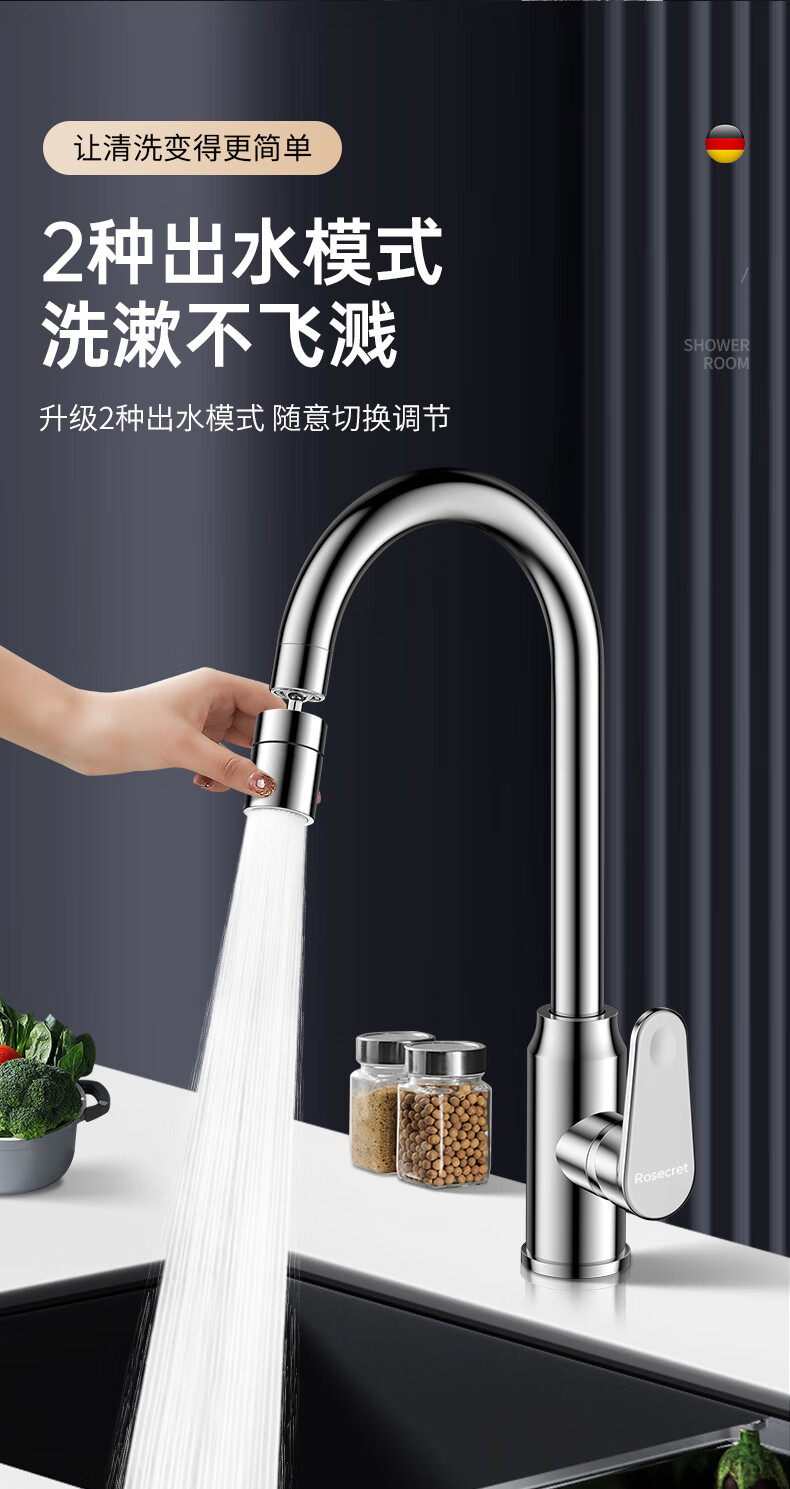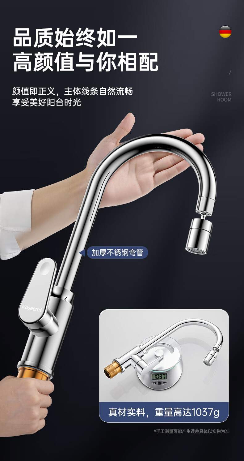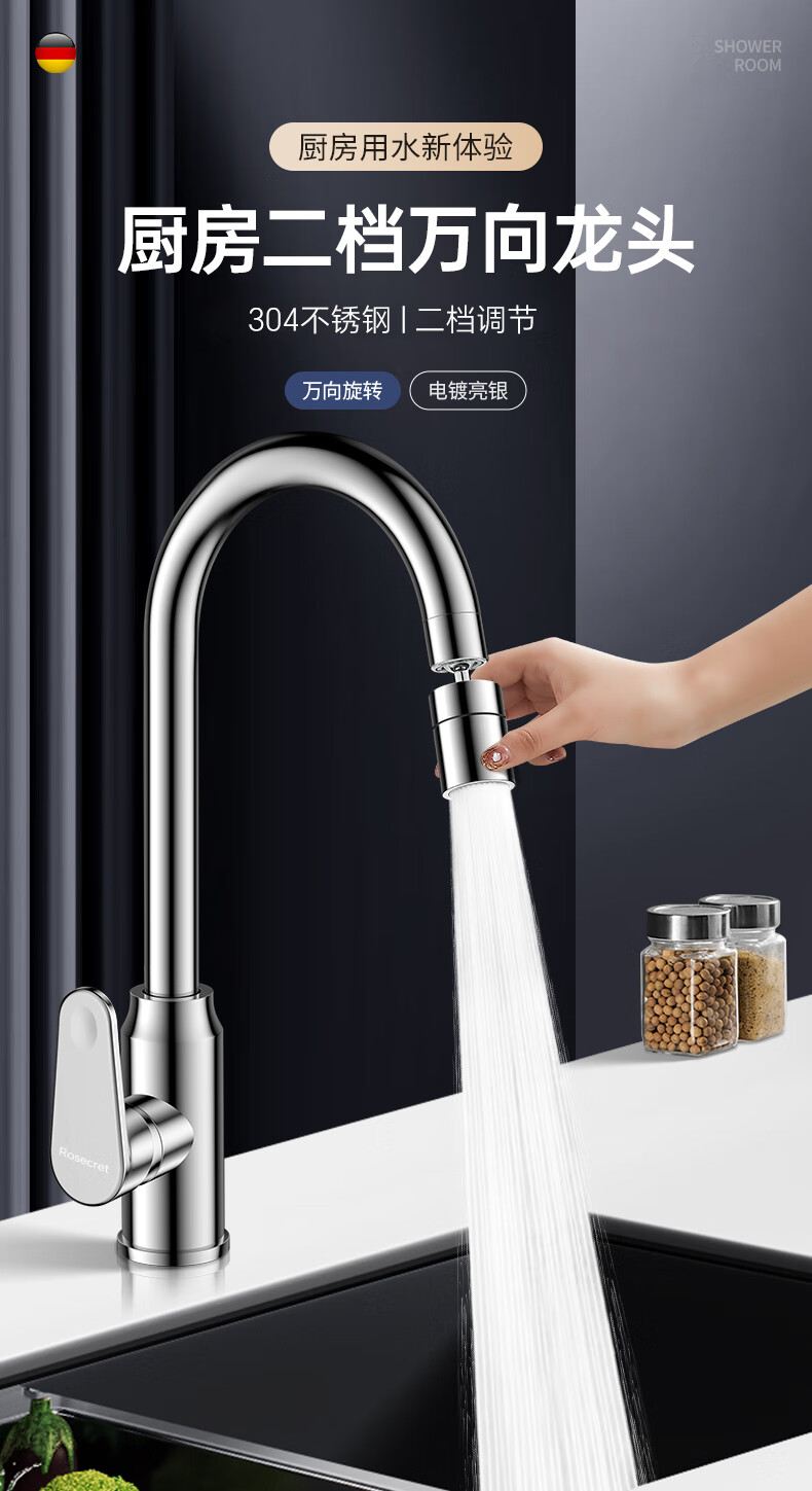 Rosecret【德国】304不锈钢厨房水龙头高抛冷热水器二合一万向洗菜盆龙头 两档增压厨房龙头【电镀银】 加厚加重主体丨送80cm冷热进水管*2