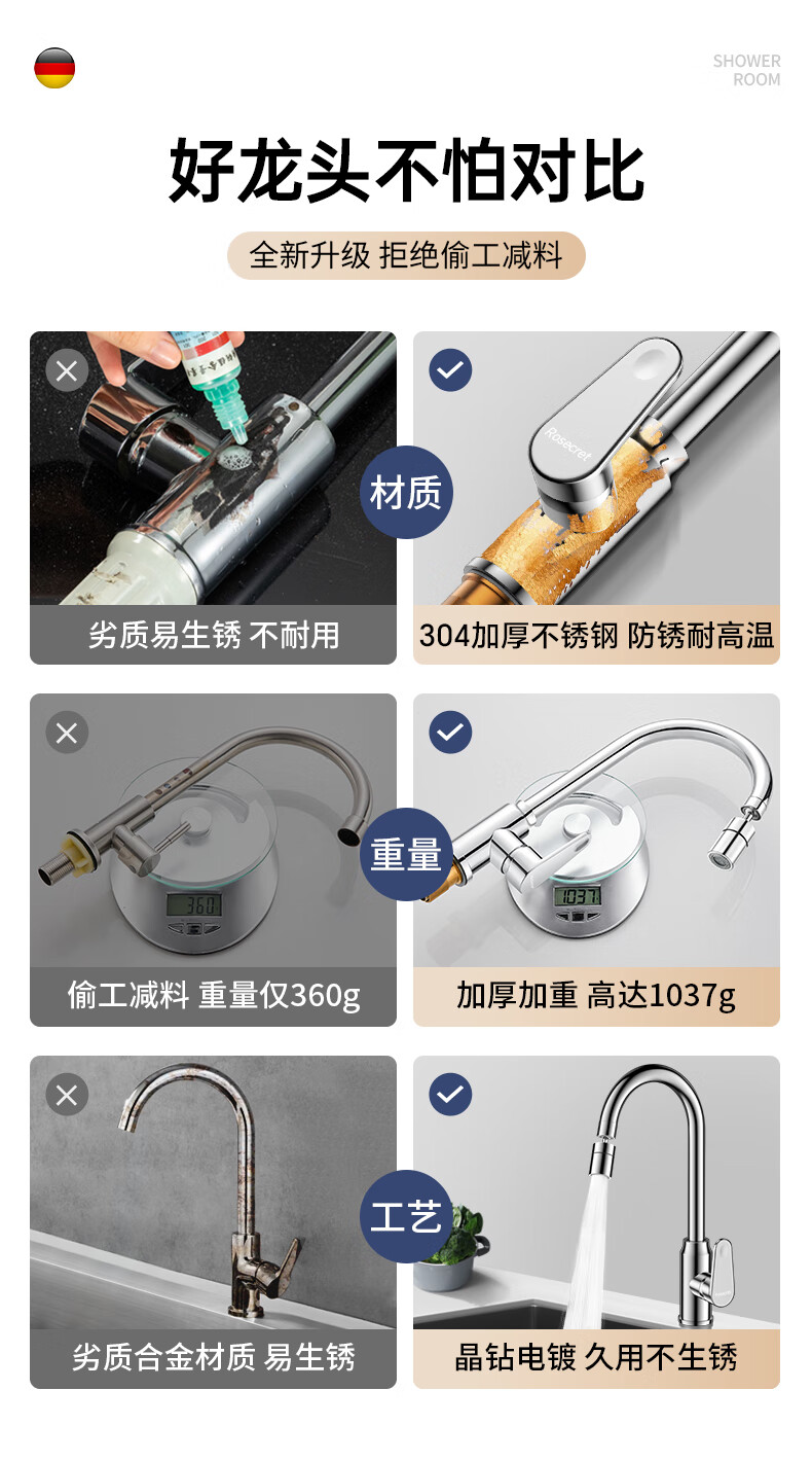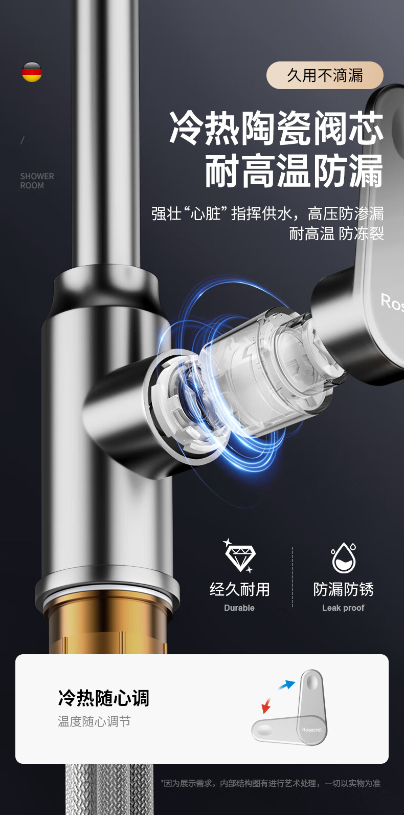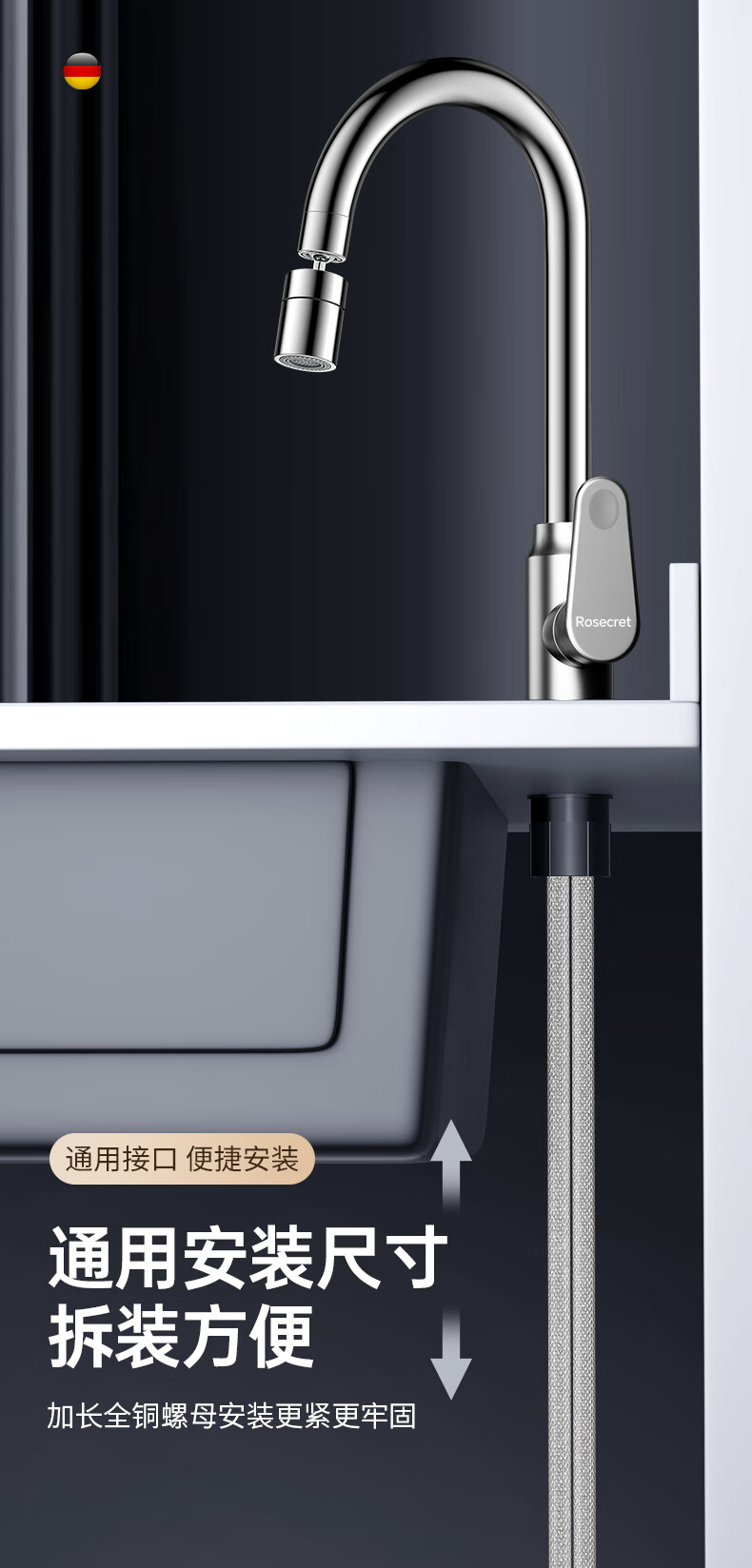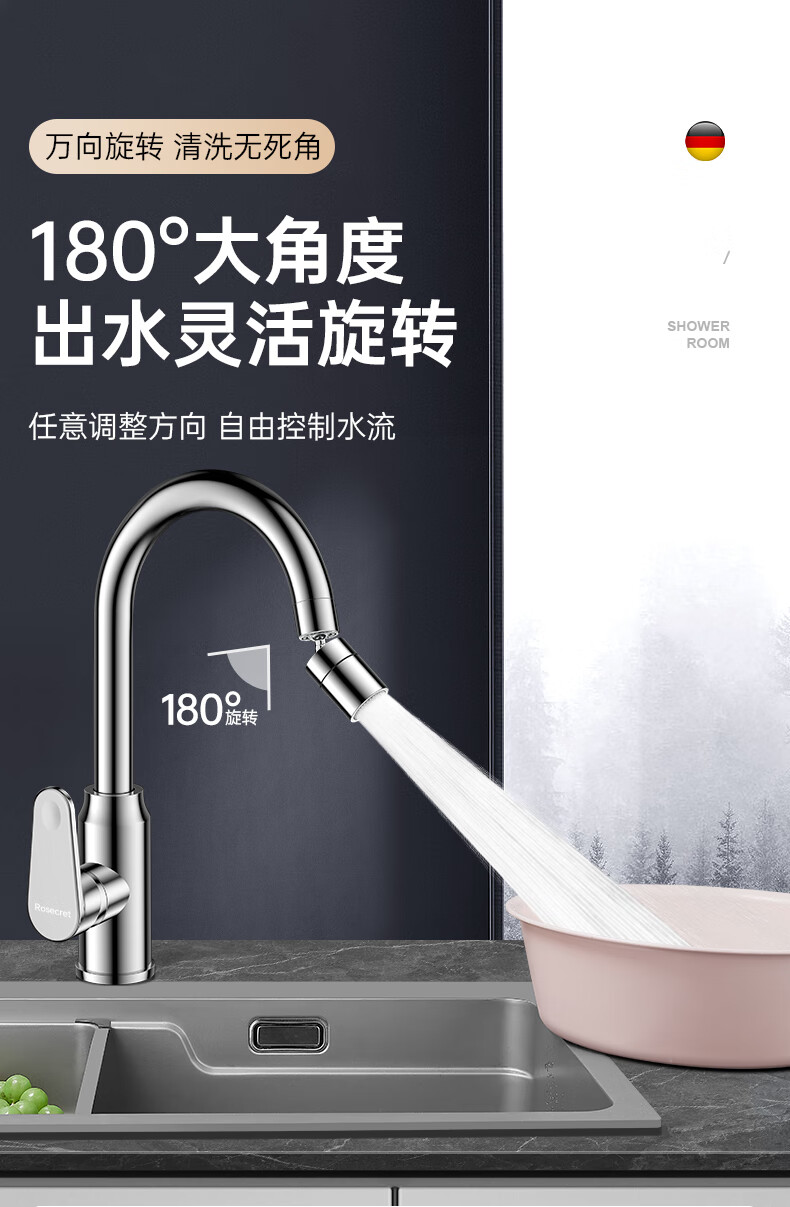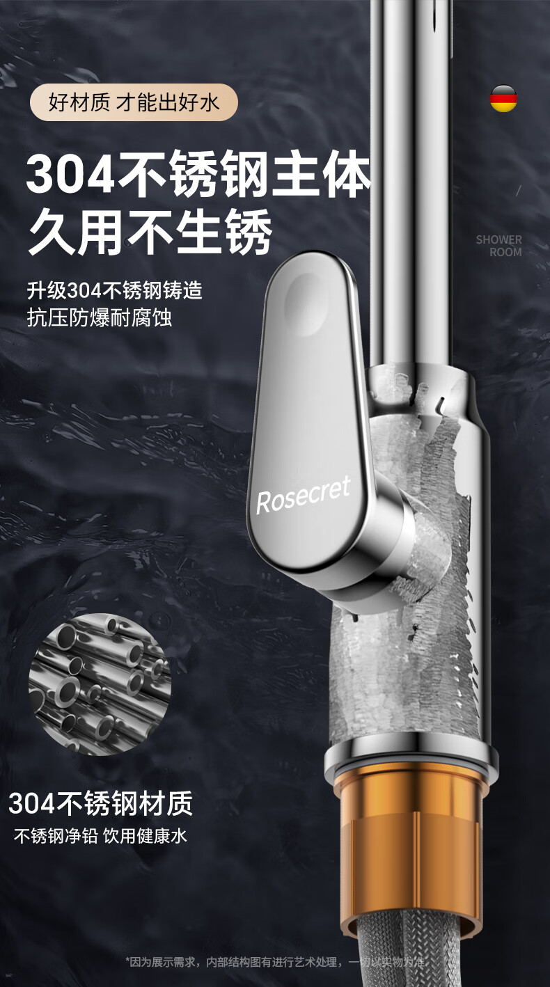 Rosecret【德国】304不锈钢厨房水龙头高抛冷热水器二合一万向洗菜盆龙头 两档增压厨房龙头【电镀银】 加厚加重主体丨送80cm冷热进水管*2