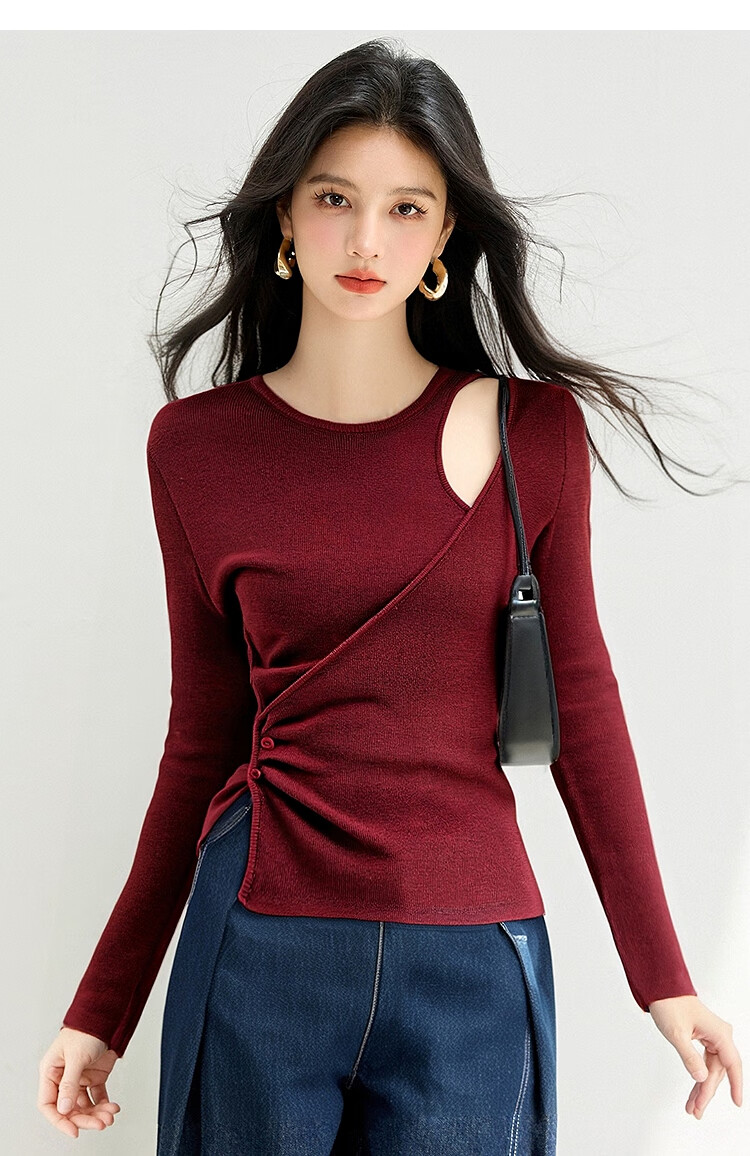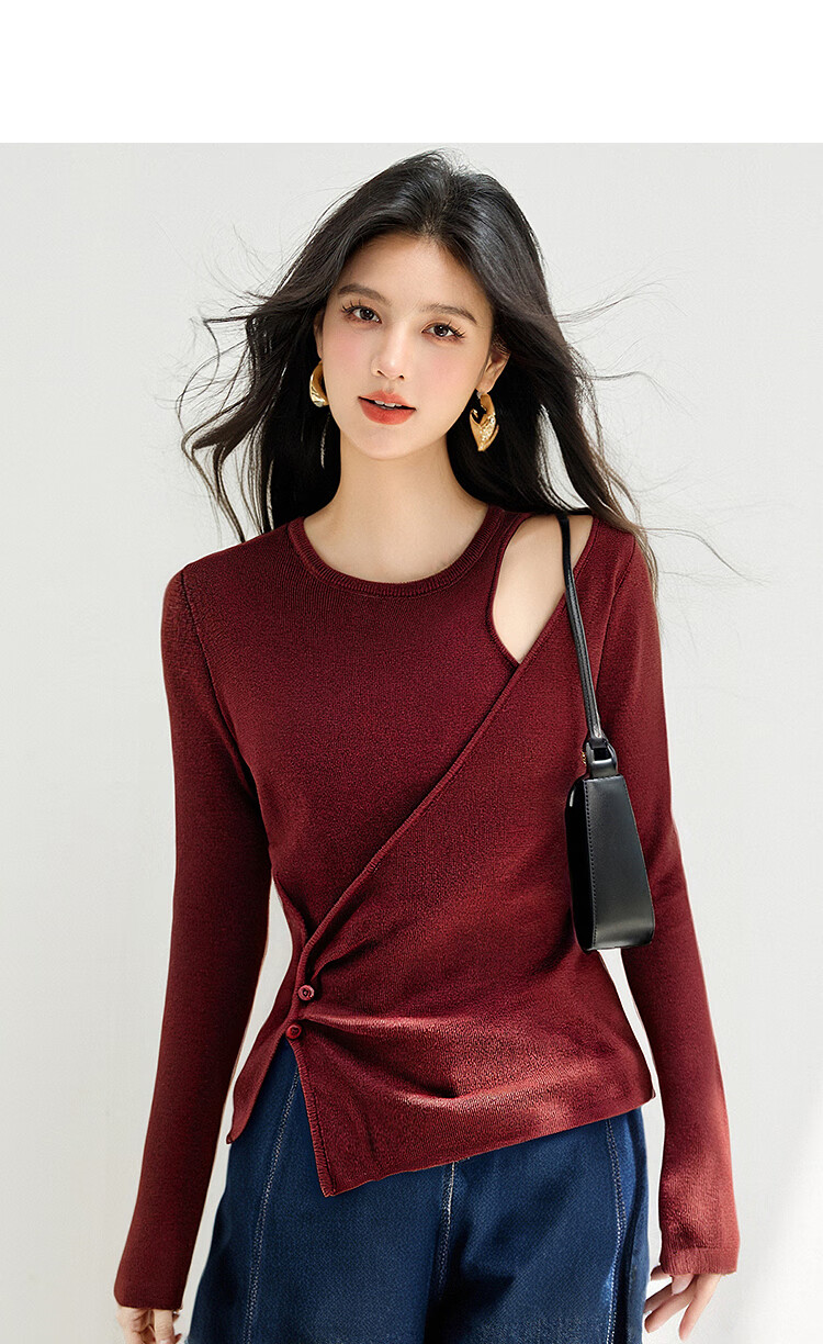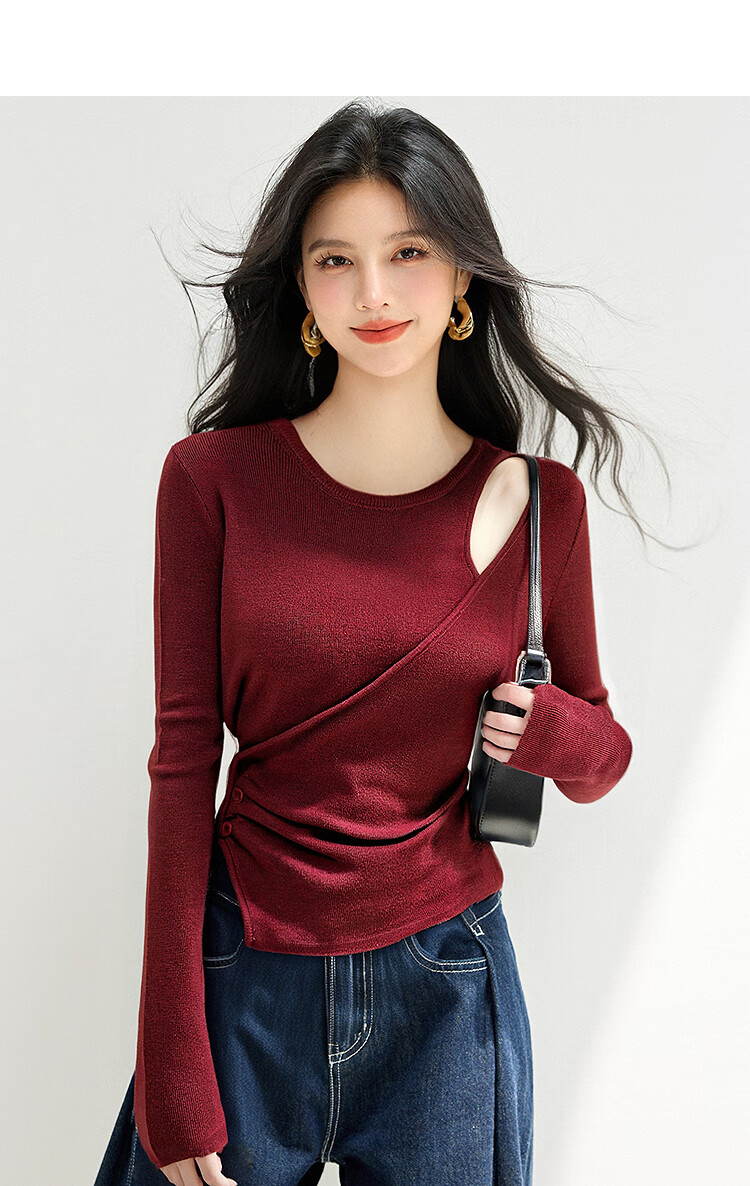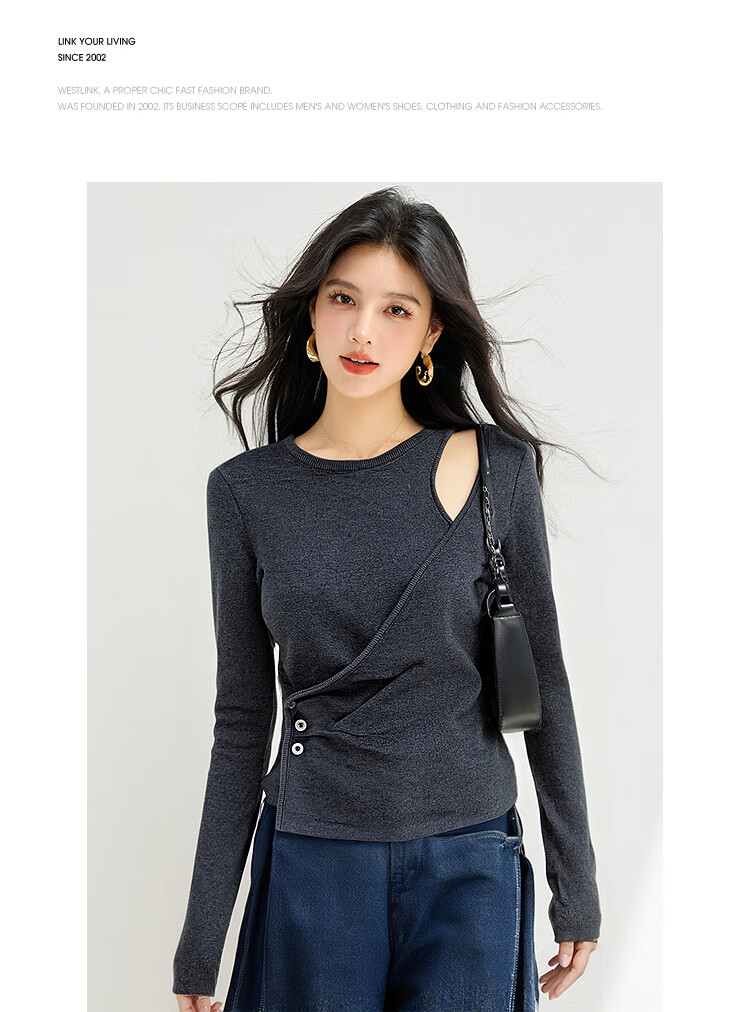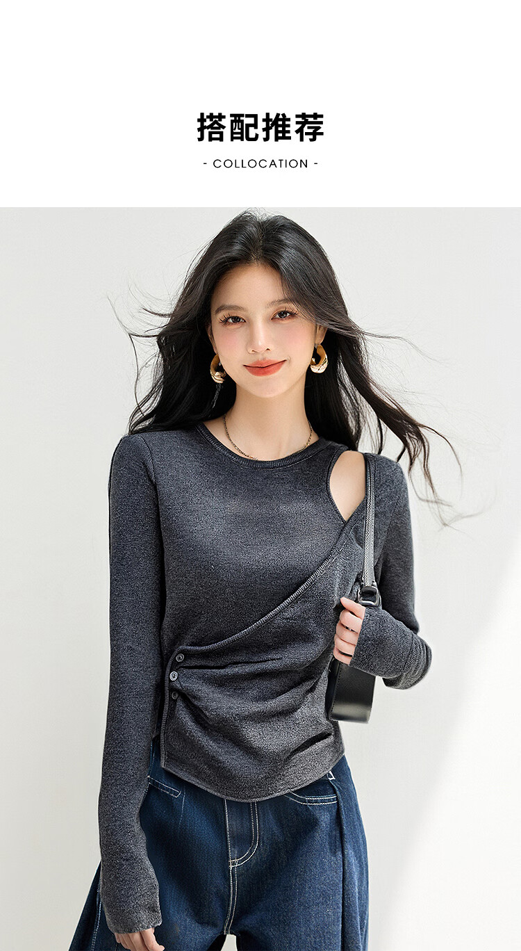 西遇长袖针织衫女2025年秋季新款设计感圆领露肩修身显瘦打底毛衣 灰色 (预售15天) M (160)