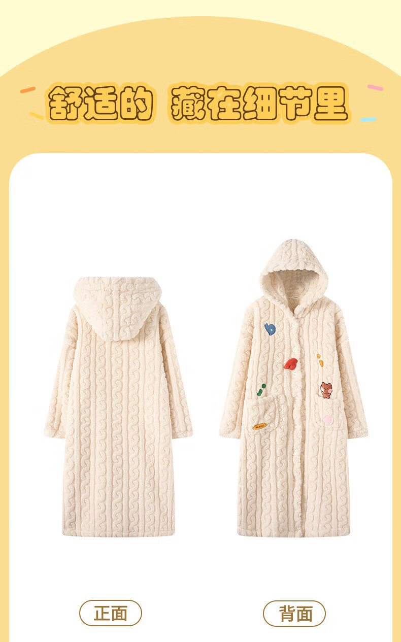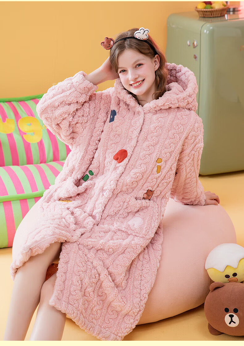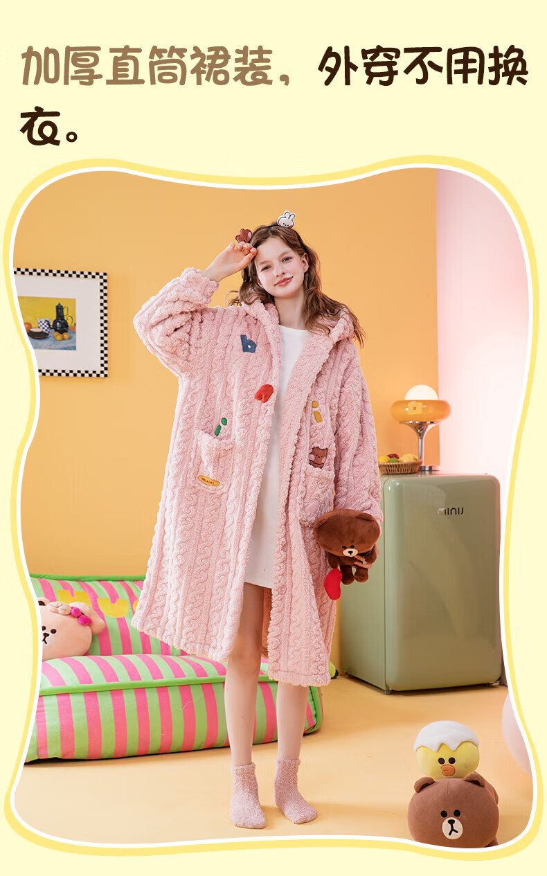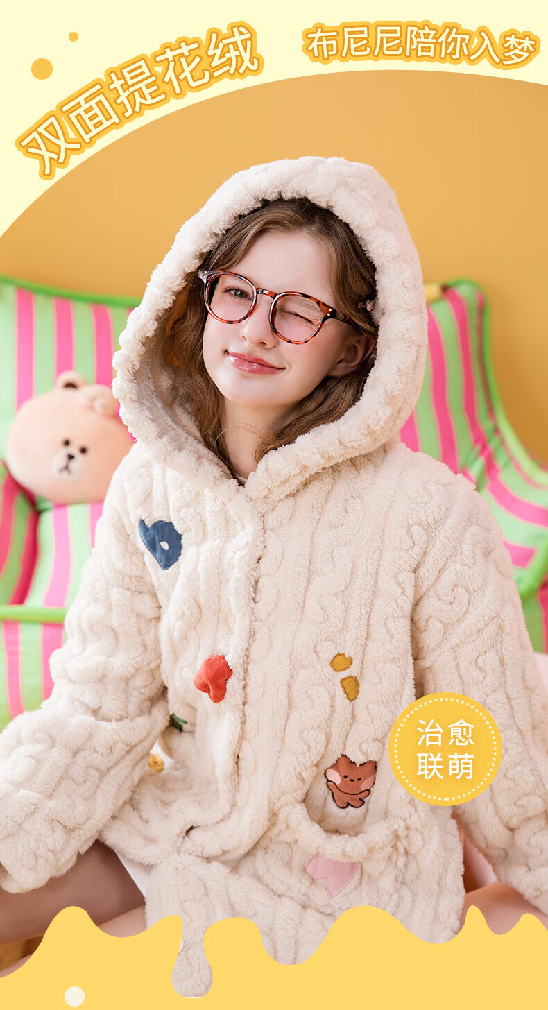 芬腾睡袍女【布朗熊IP联名】双面暖绒秋冬连帽长袖外穿加厚裙子 米百 XL