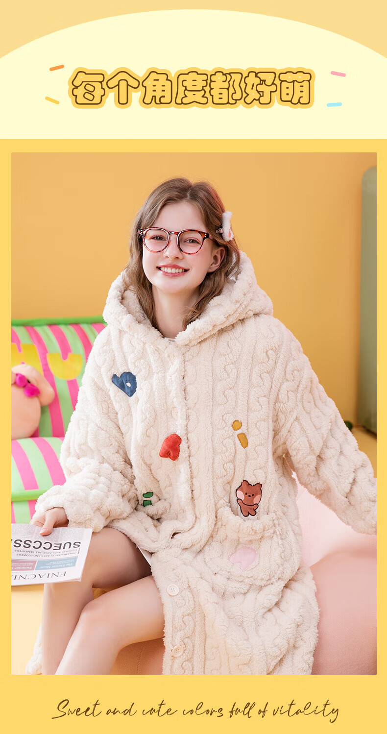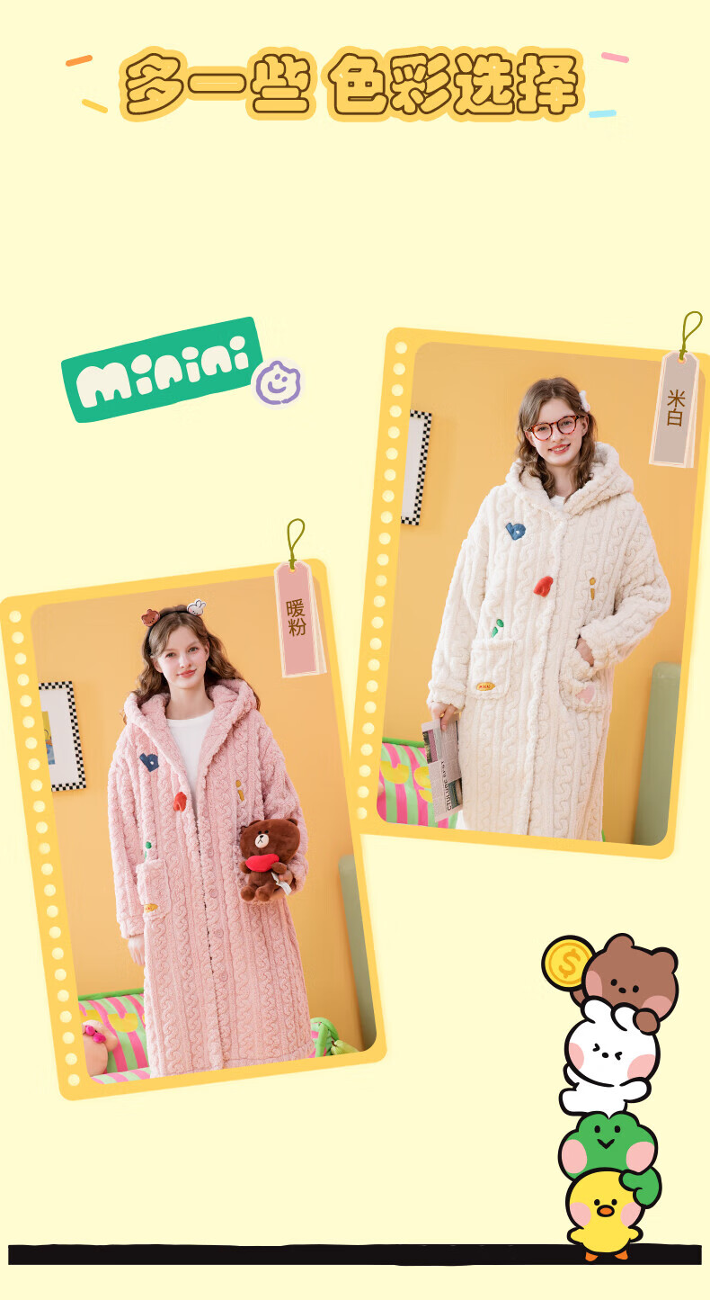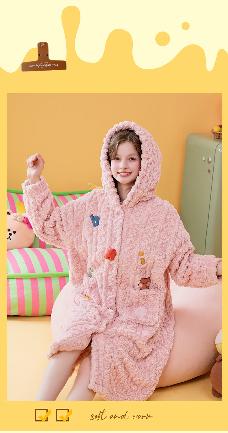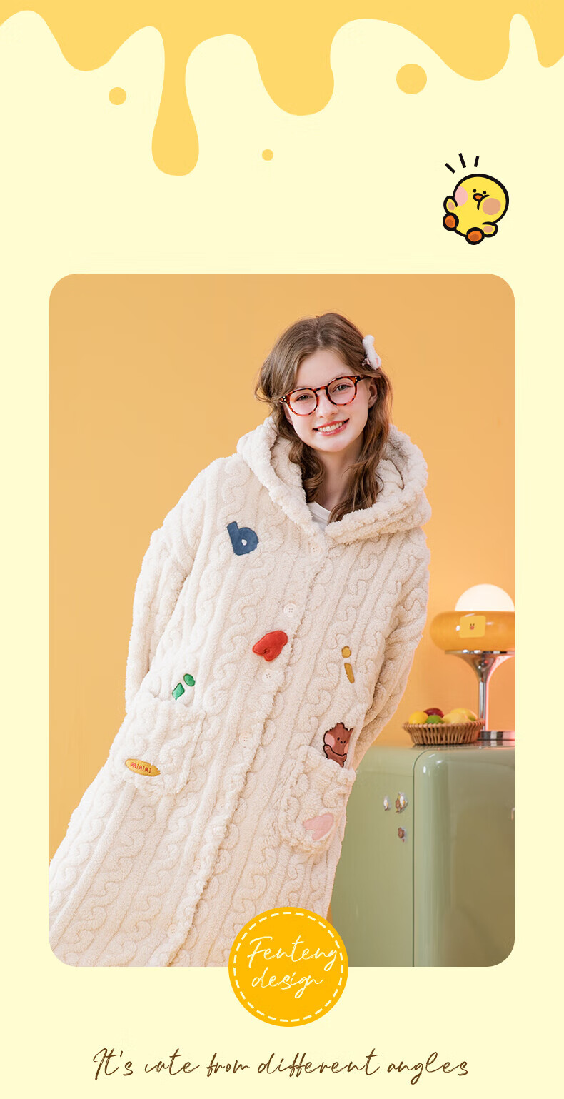芬腾睡袍女【布朗熊IP联名】双面暖绒秋冬连帽长袖外穿加厚裙子 米百 XL