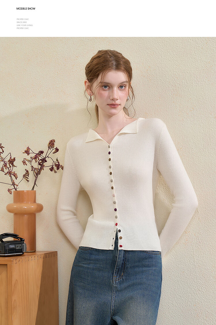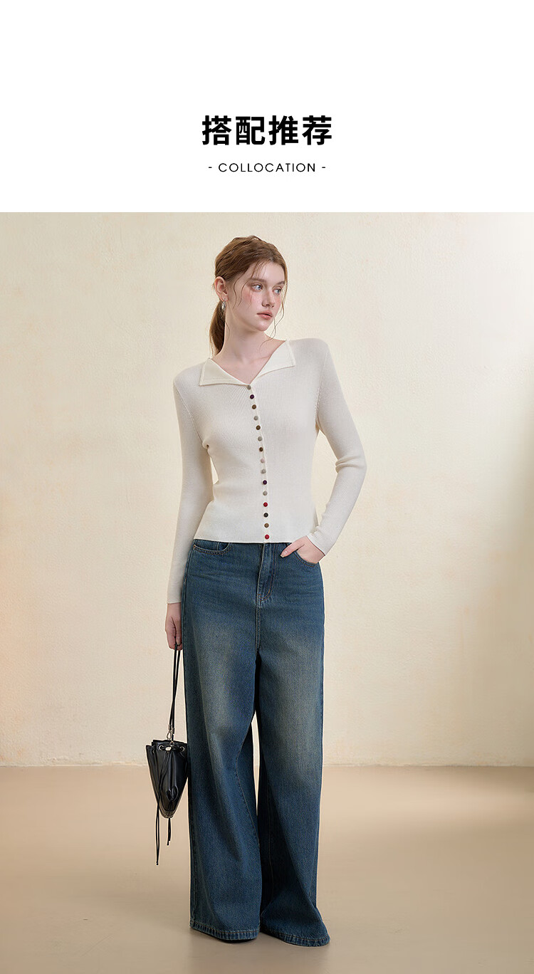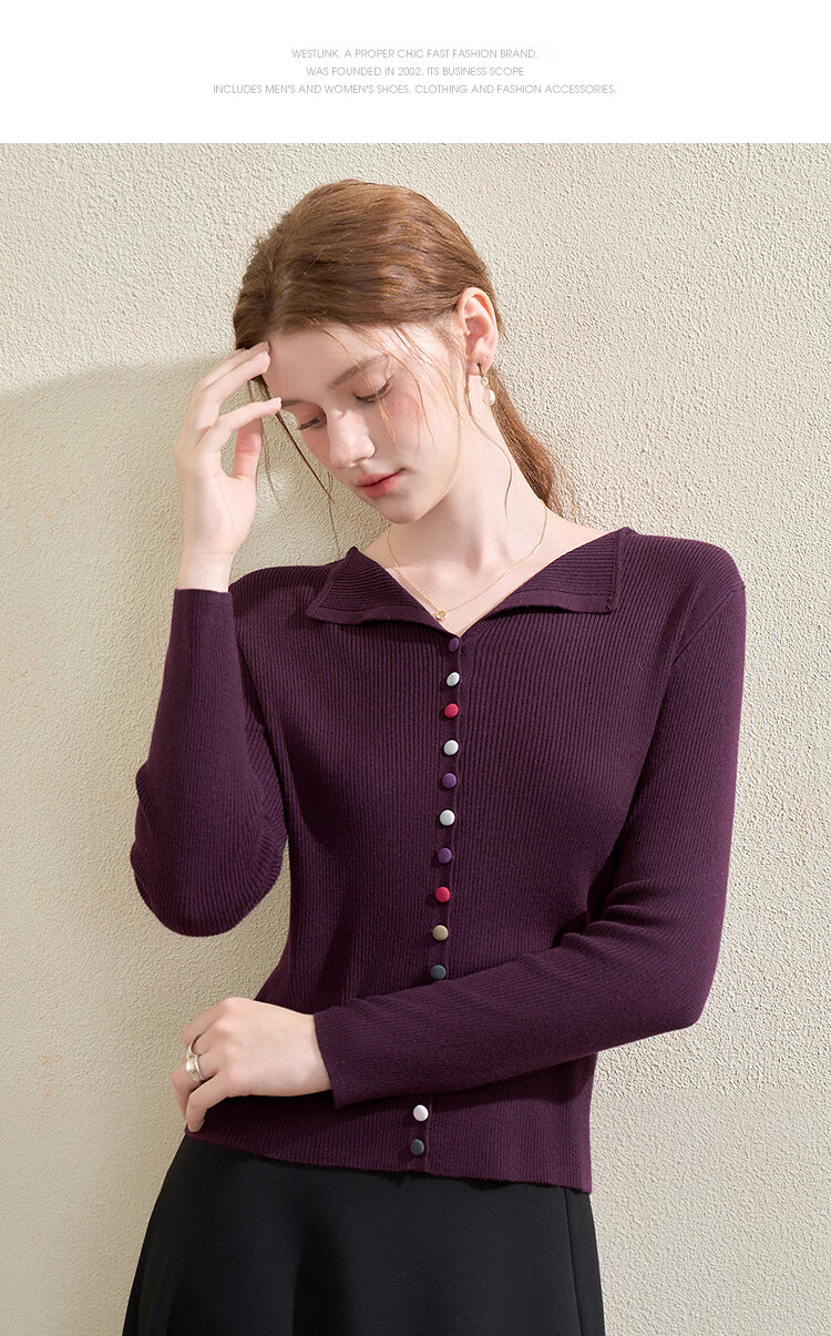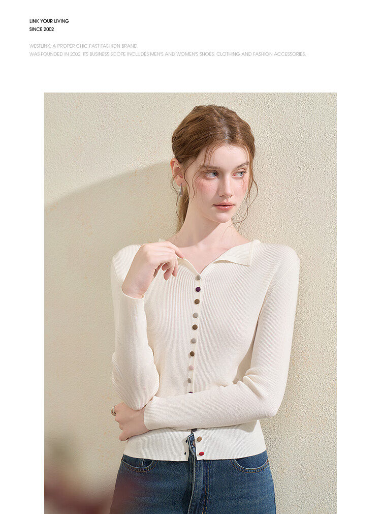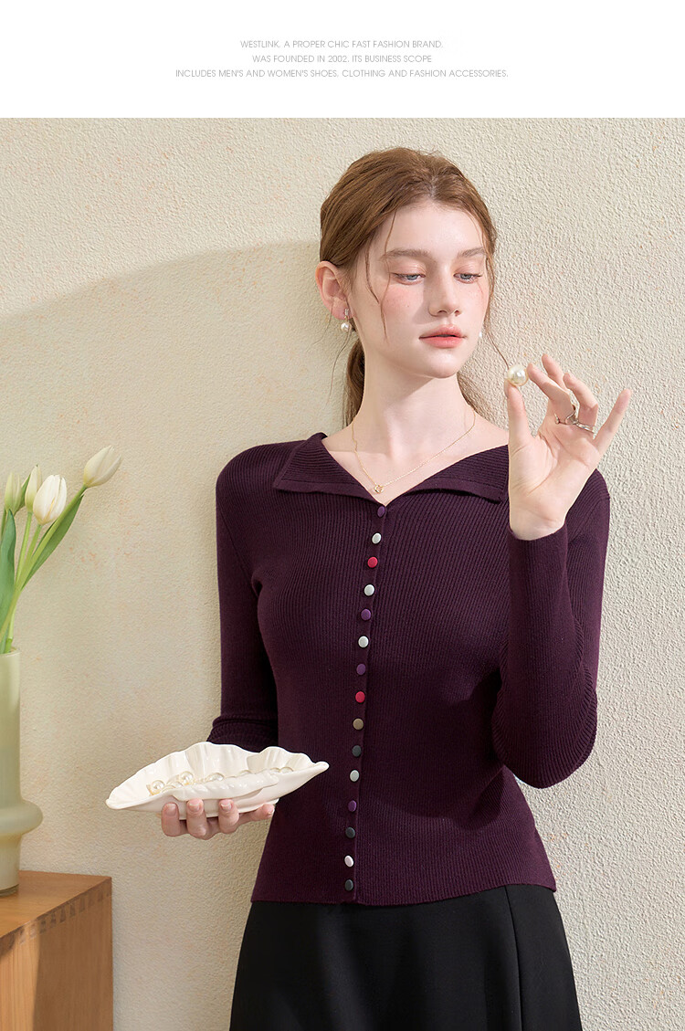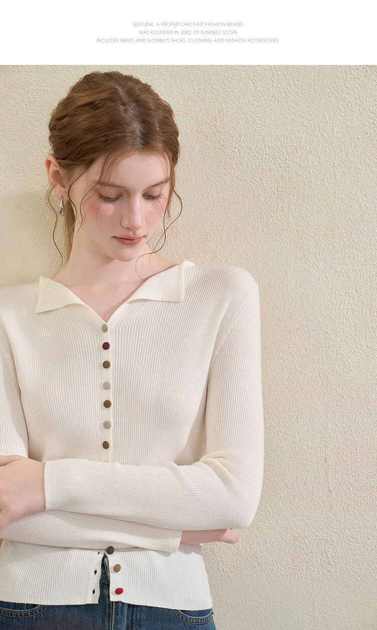 西遇(Westlink)西遇彩色纽扣长袖针织衫女2025秋季新款温柔翻领软糯打底衫上衣 白色 M (160)