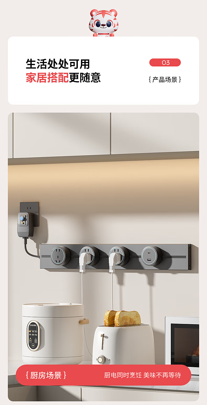 国际电工漏保插头滑动轨道插座防触电免安装可移动滑轨厨房大间距带线插排 灰色16A漏保带线轨道插座 80cm +4个大五孔+USB/Type-C