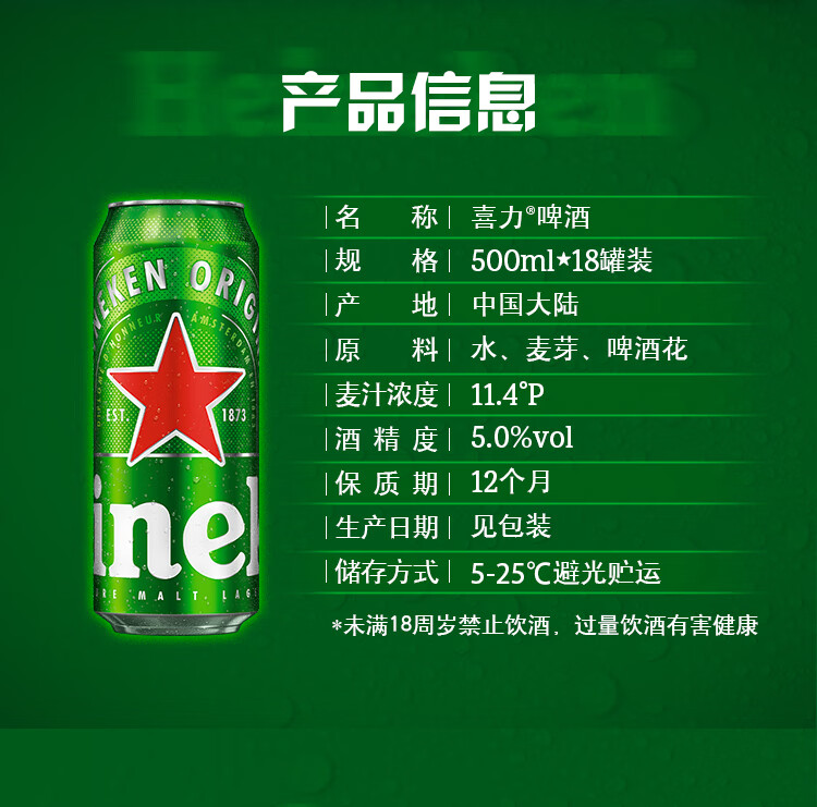 喜力经典500ml*18听整箱装 喜力啤酒Heineken 中秋送酒