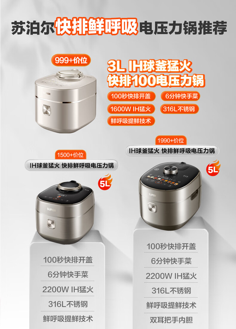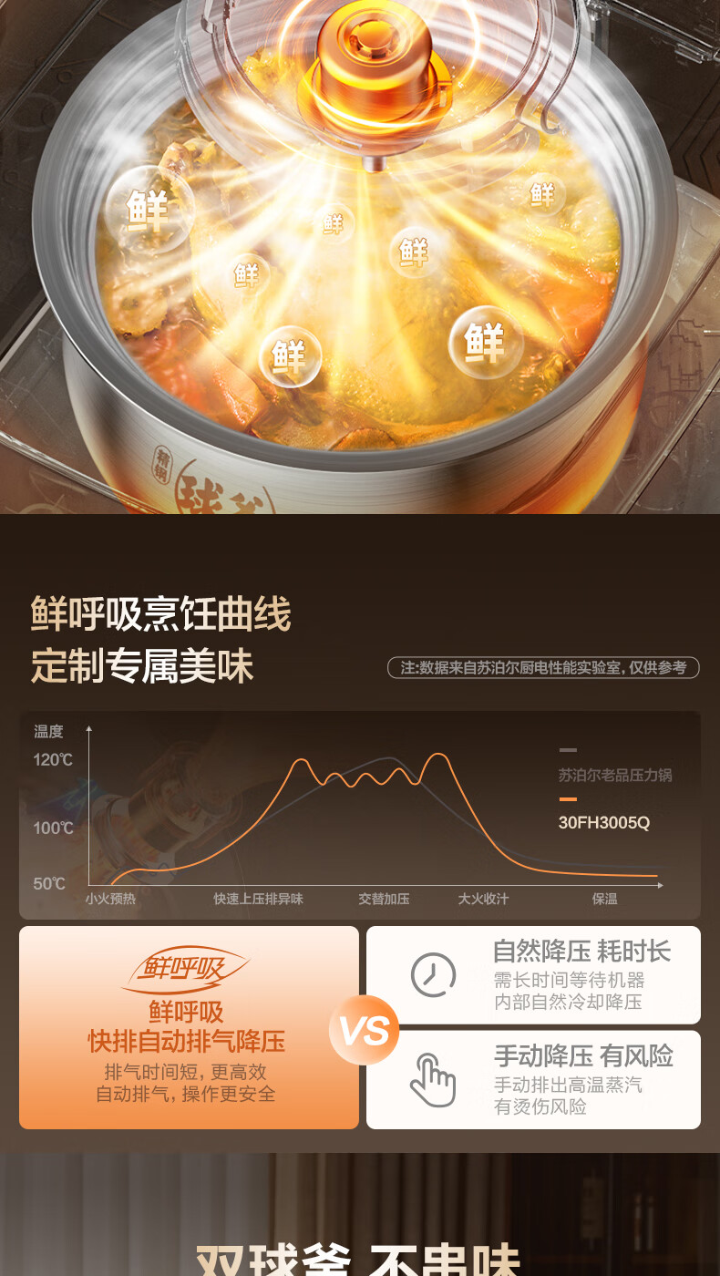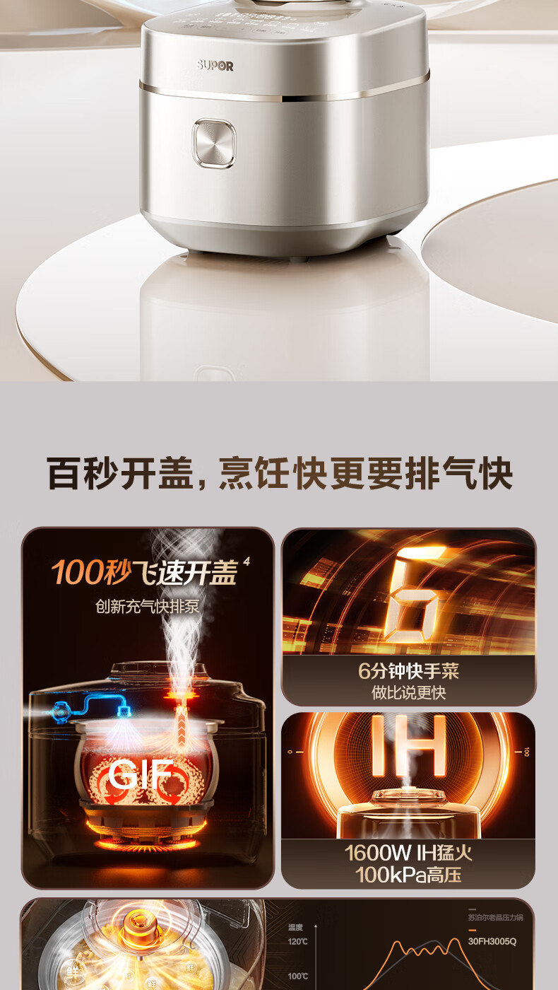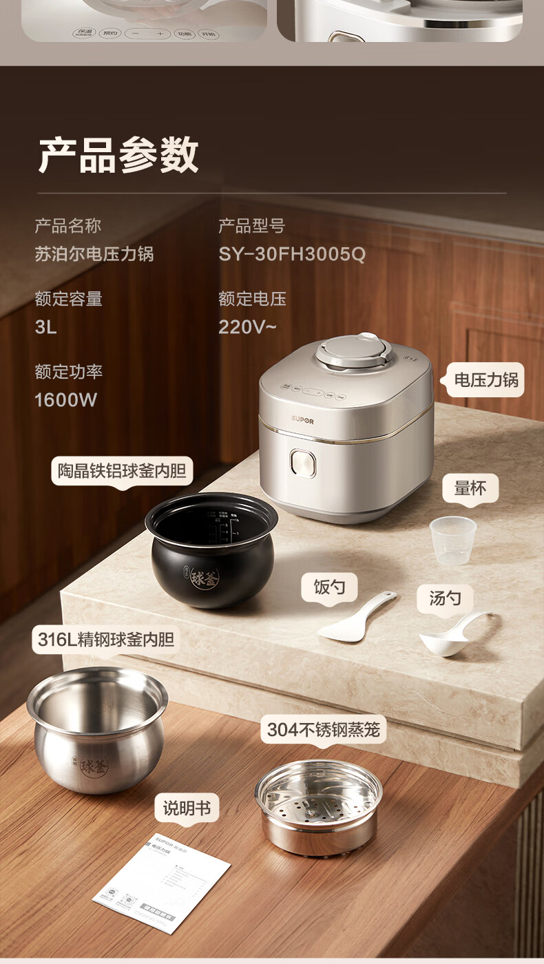 苏泊尔(SUPOR)快排100系列电压力锅3L 鲜呼吸IH猛火 精钢316L球釜内胆2-4人家用高压锅SY-30FH3005Q