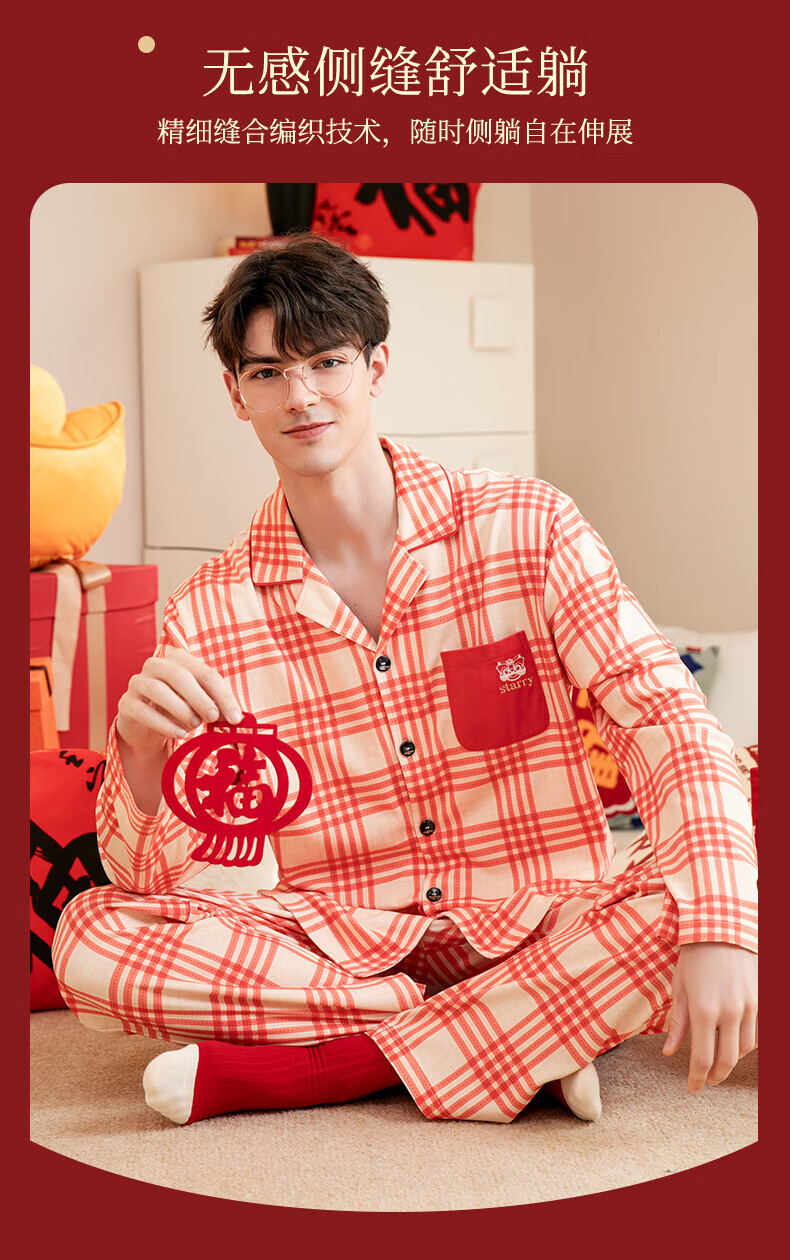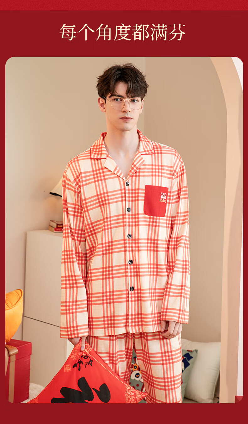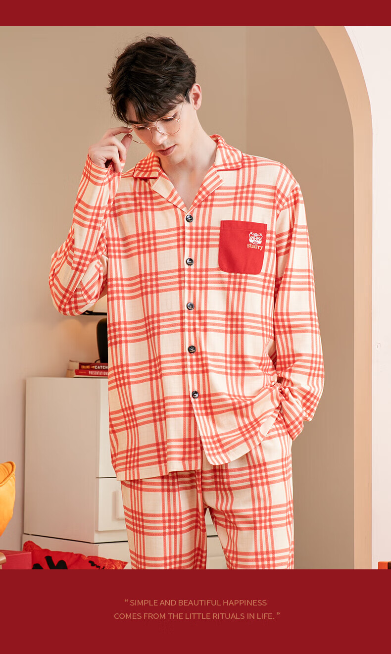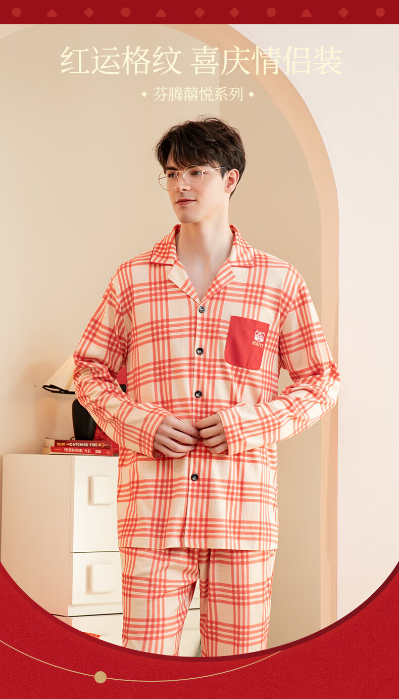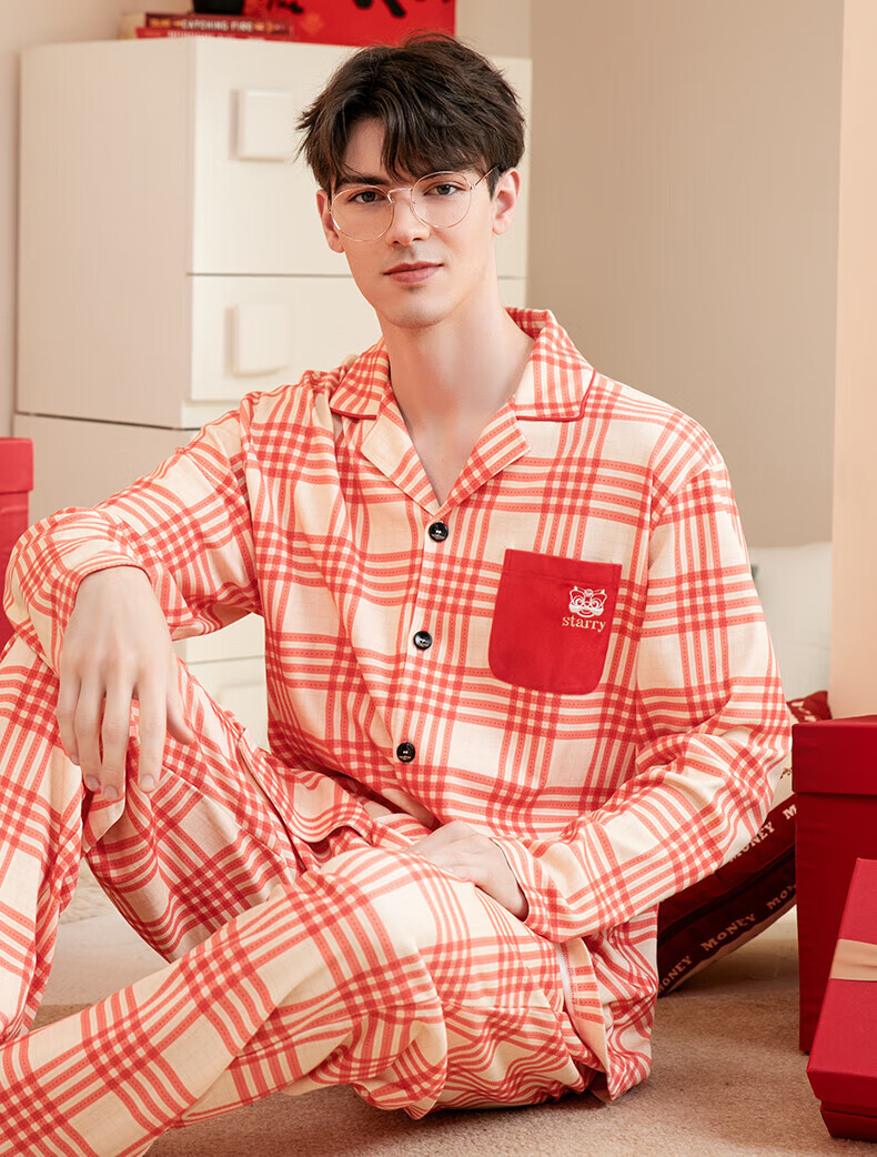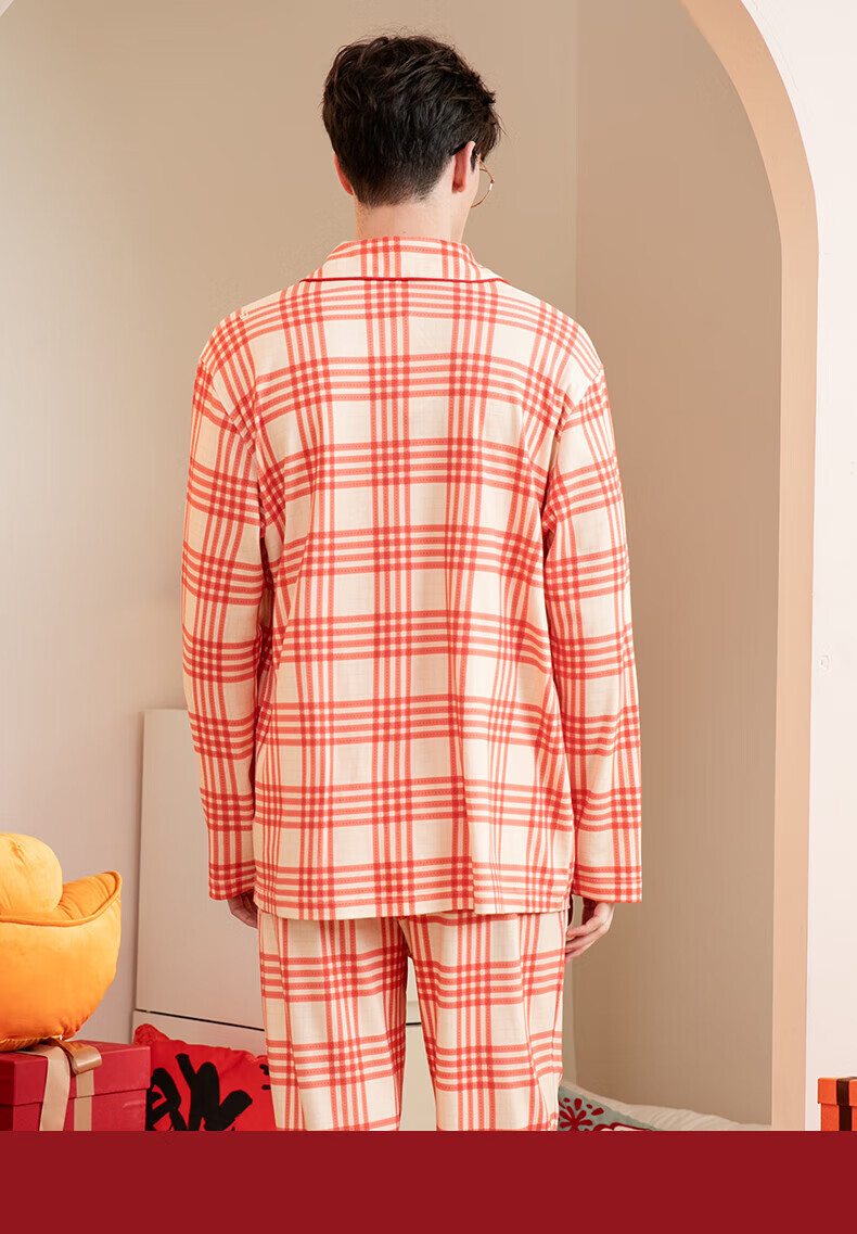 芬腾情侣睡衣【喜庆红棉】格纹可外穿翻领长袖家居服套装 桔格-男款 XL