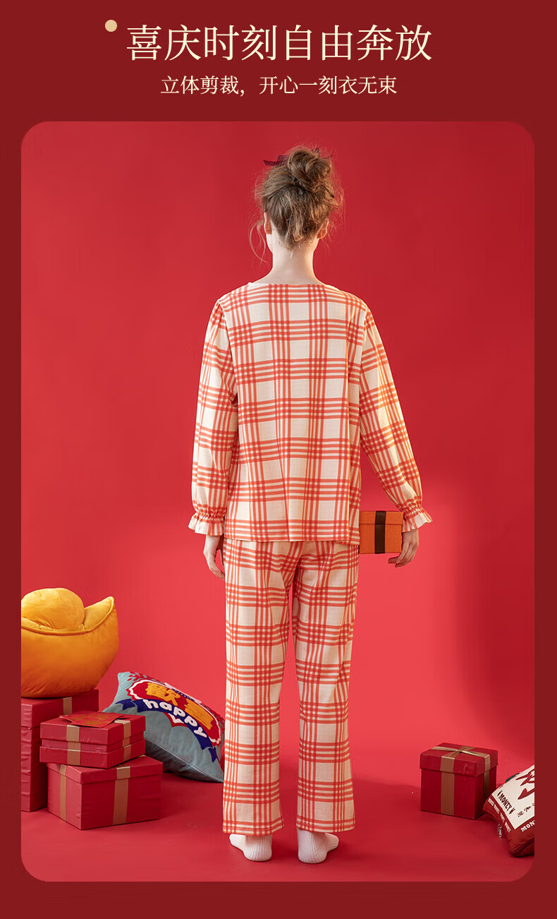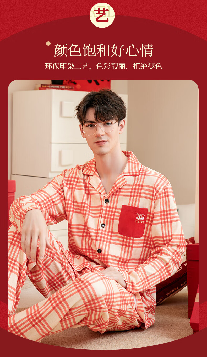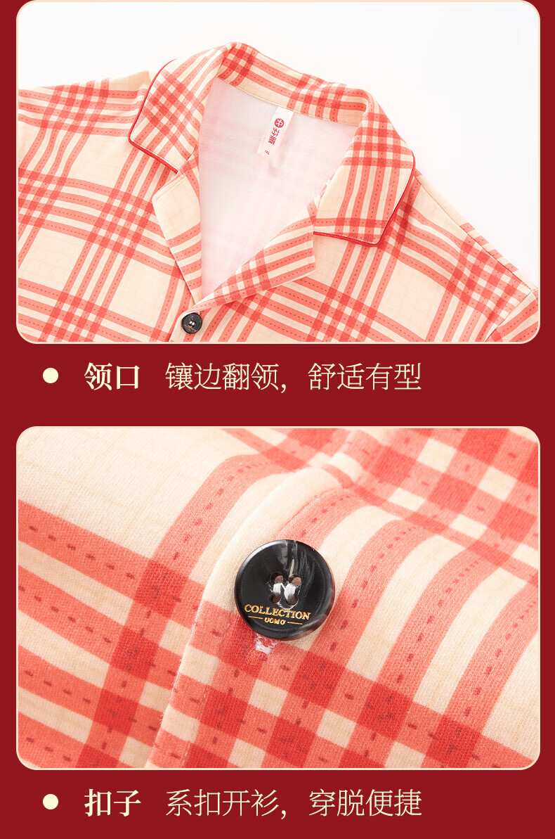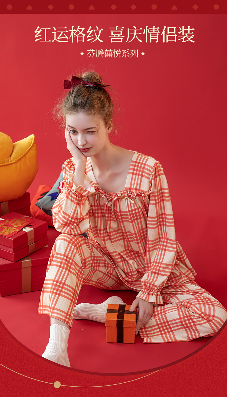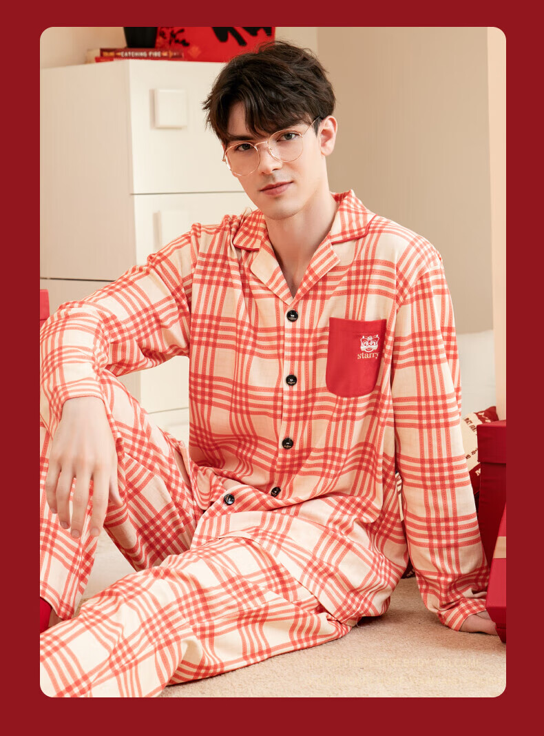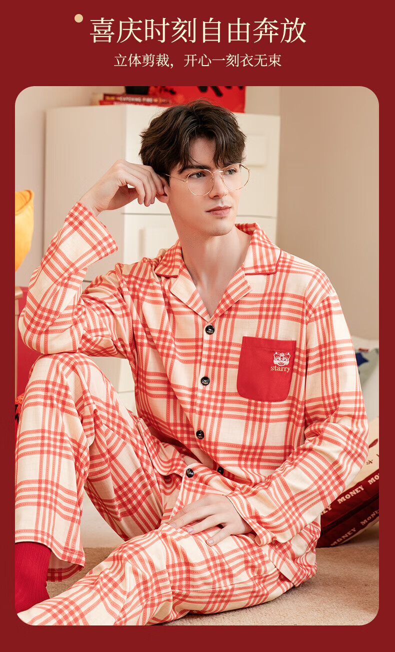 芬腾情侣睡衣【喜庆红棉】格纹可外穿翻领长袖家居服套装 桔格-男款 XL