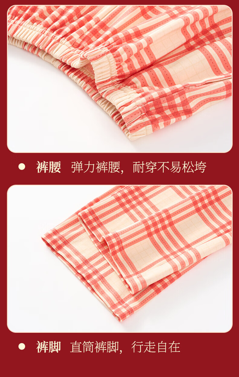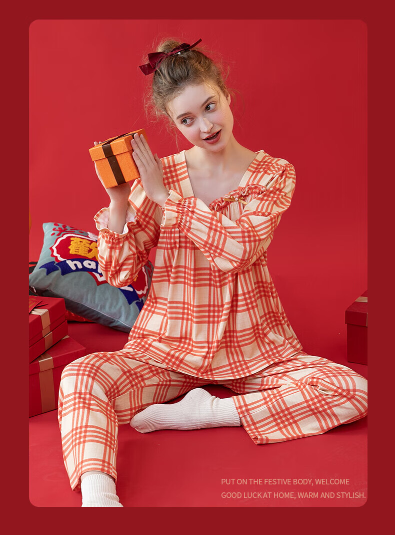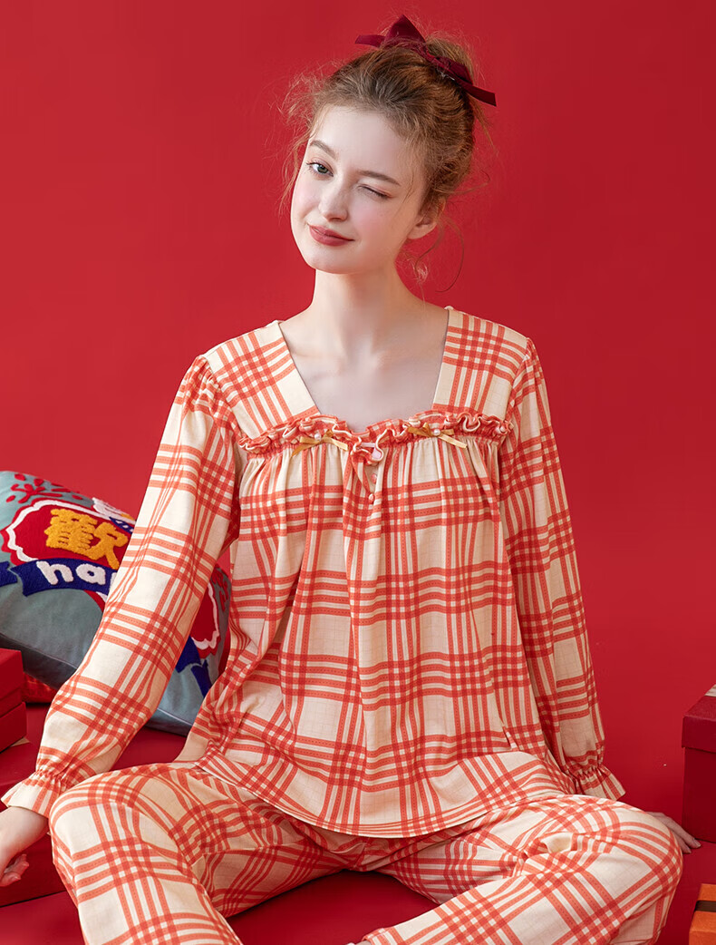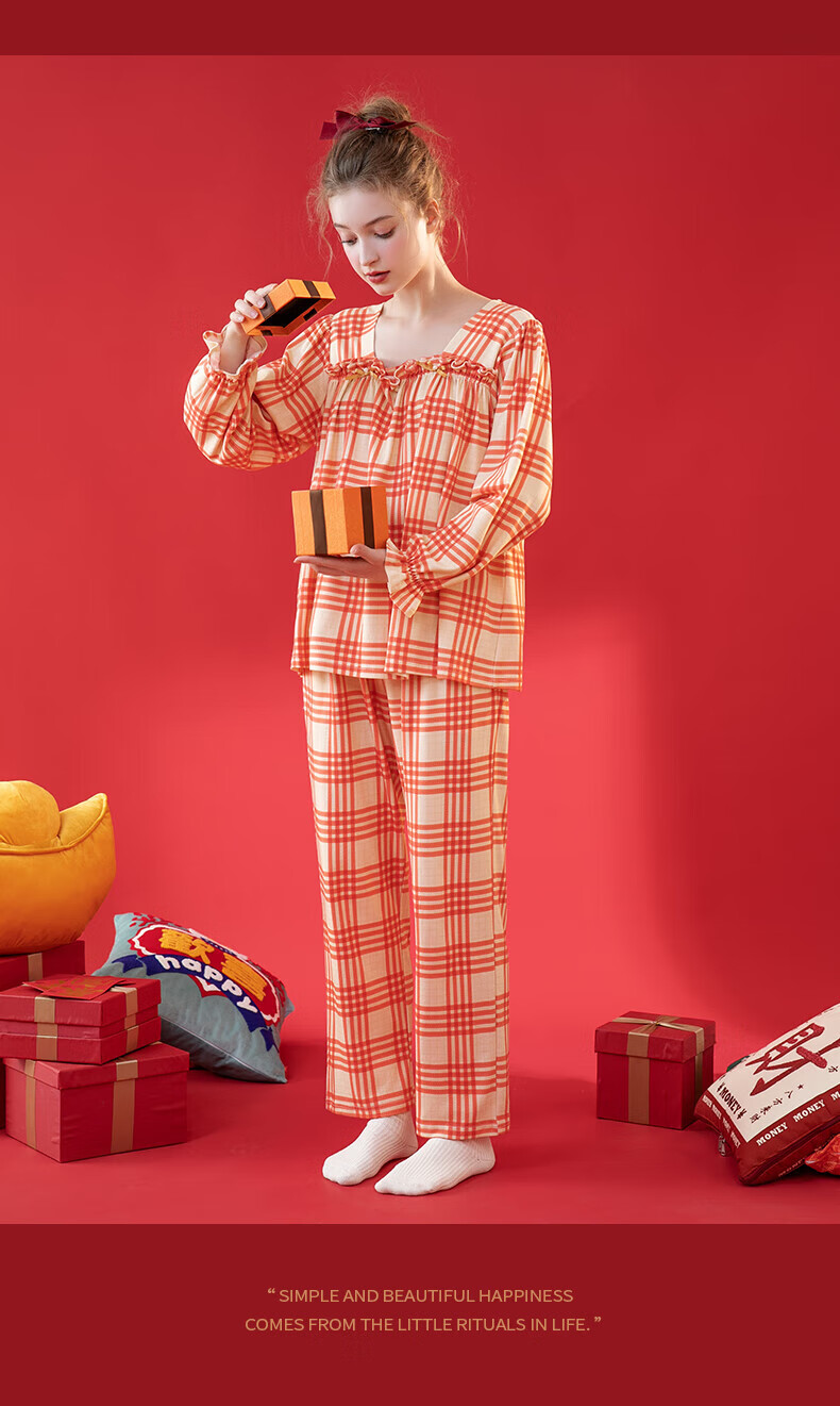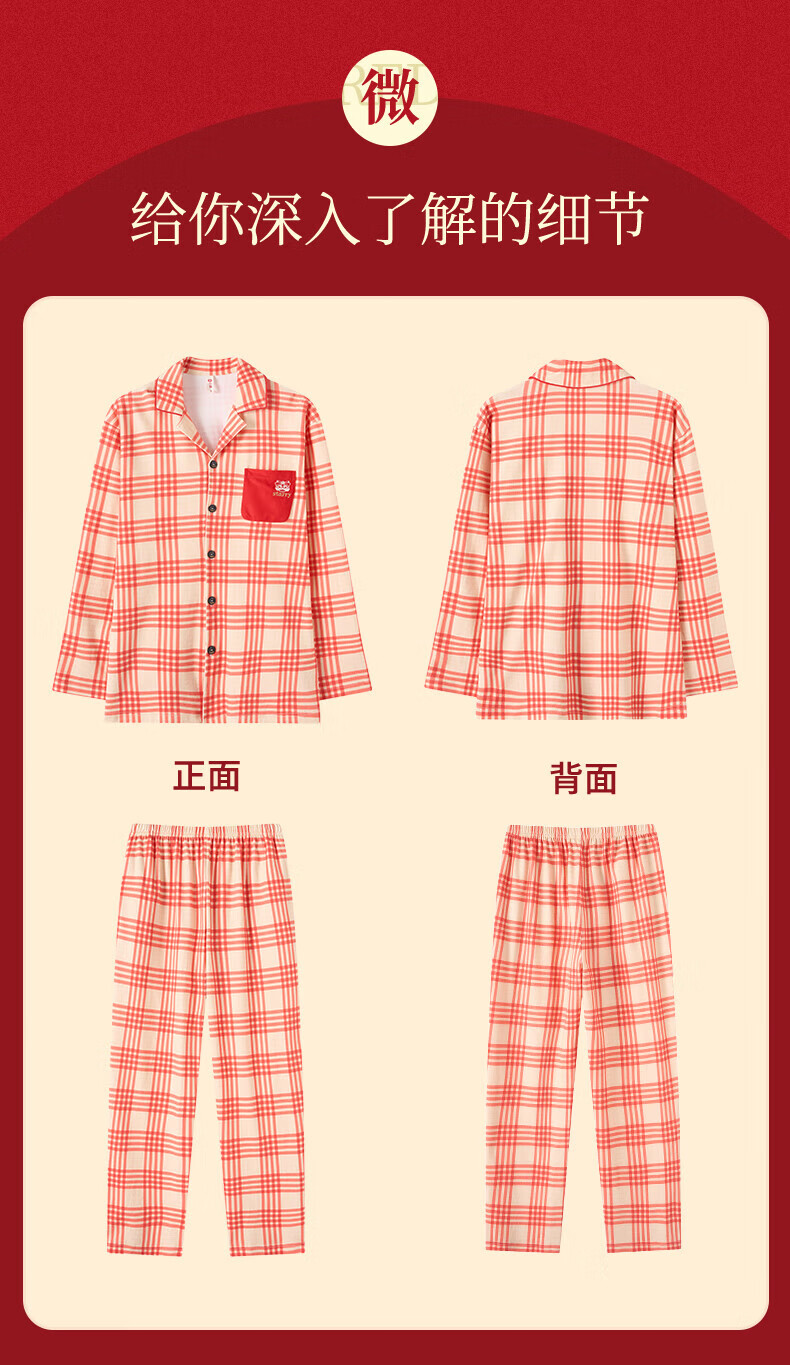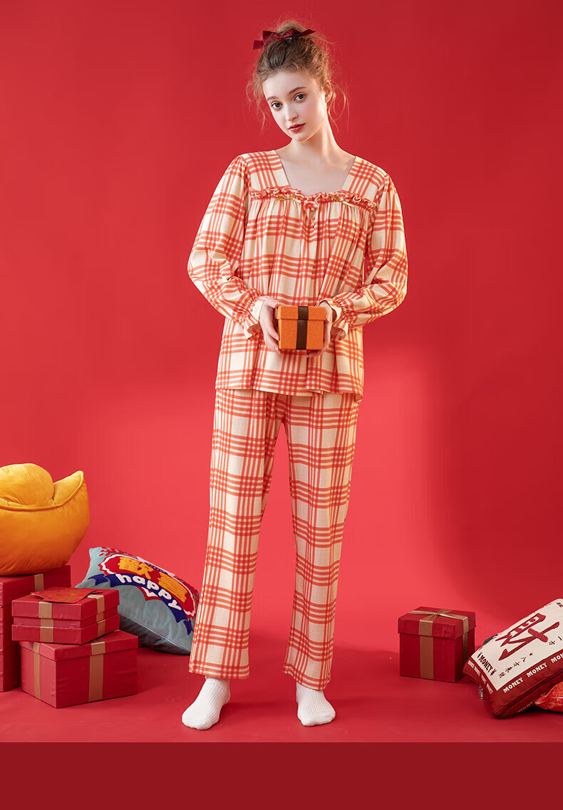 芬腾情侣睡衣【喜庆红棉】格纹可外穿翻领长袖家居服套装 桔格-男款 XL