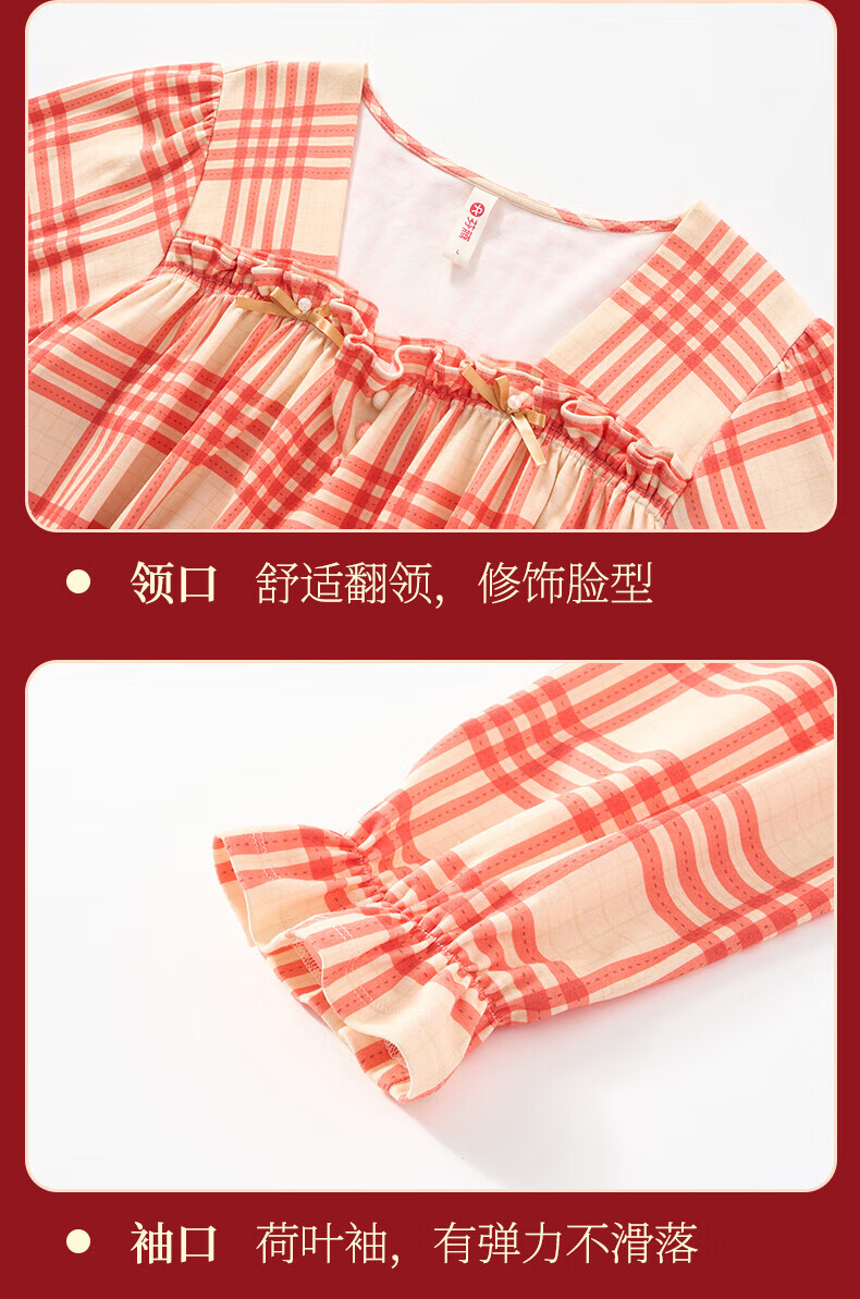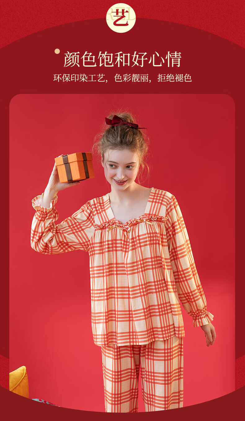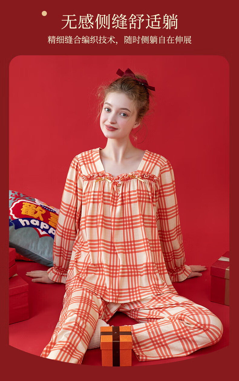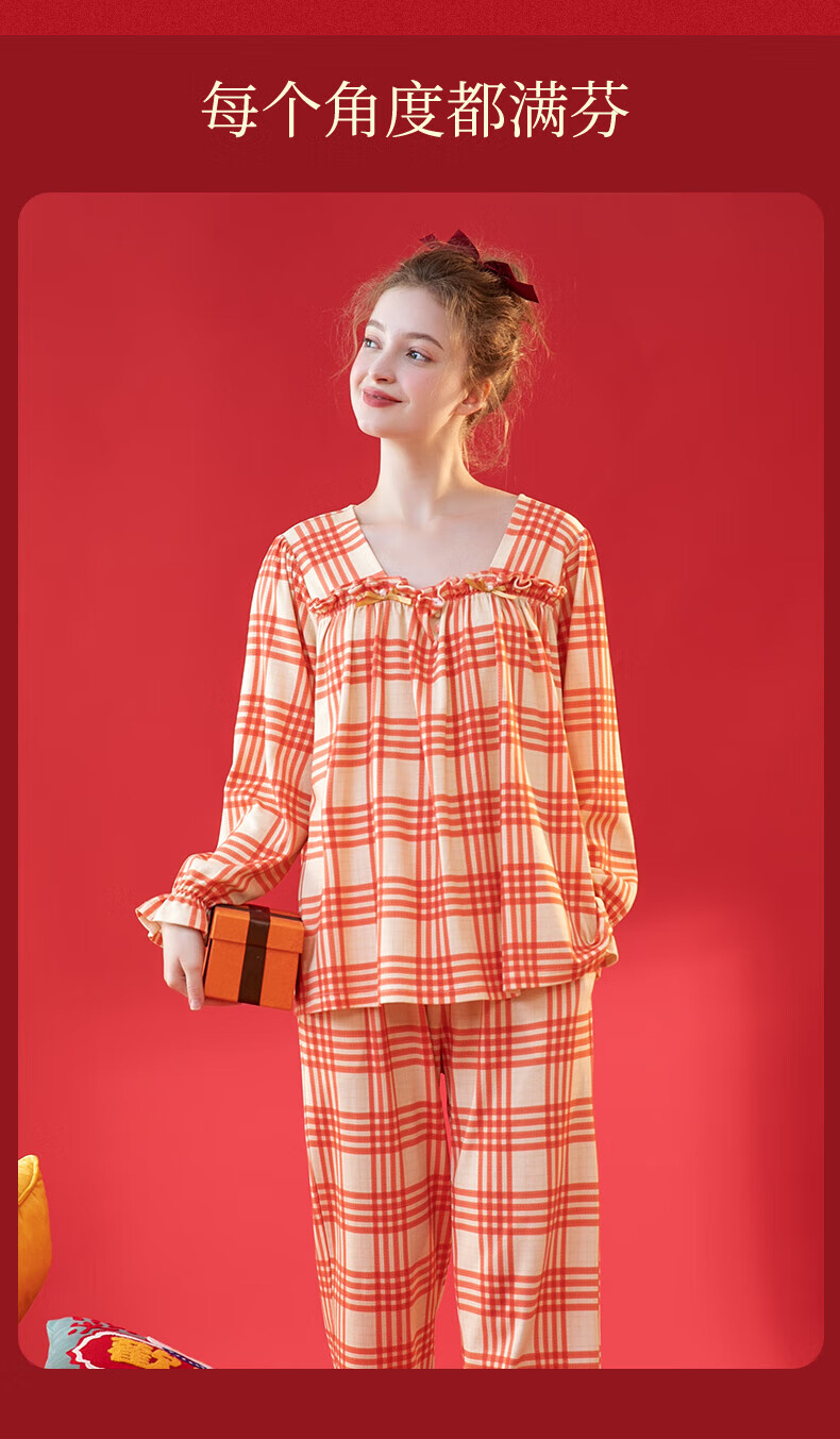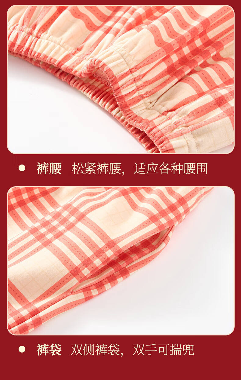 芬腾情侣睡衣【喜庆红棉】格纹可外穿翻领长袖家居服套装 桔格-男款 XL