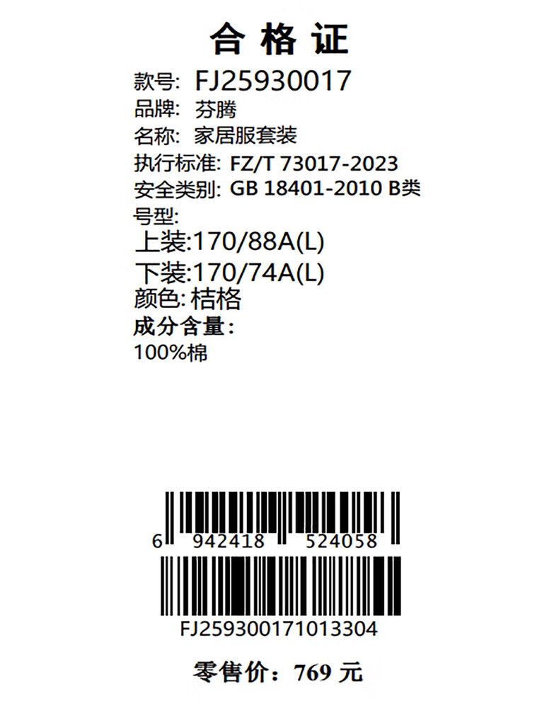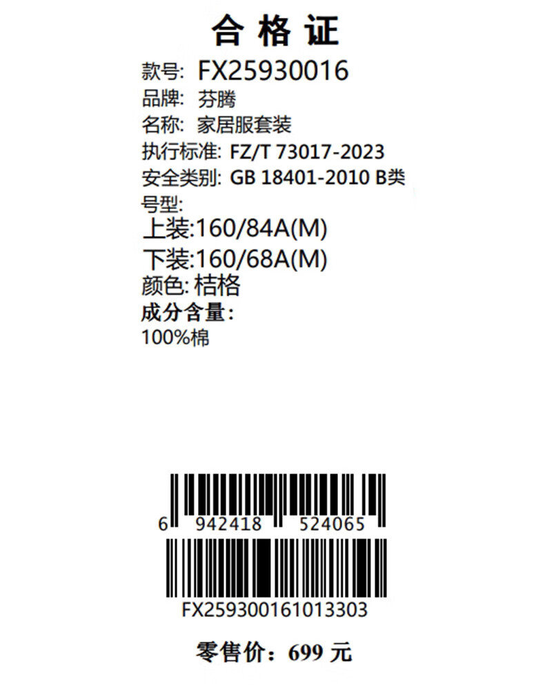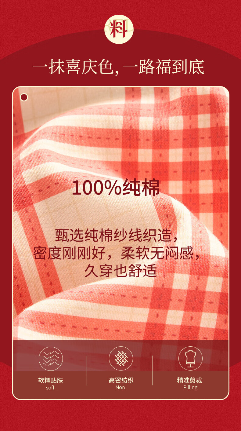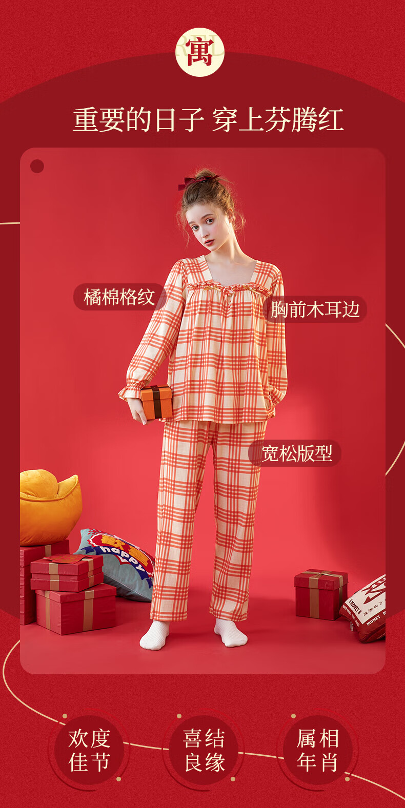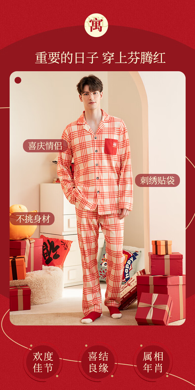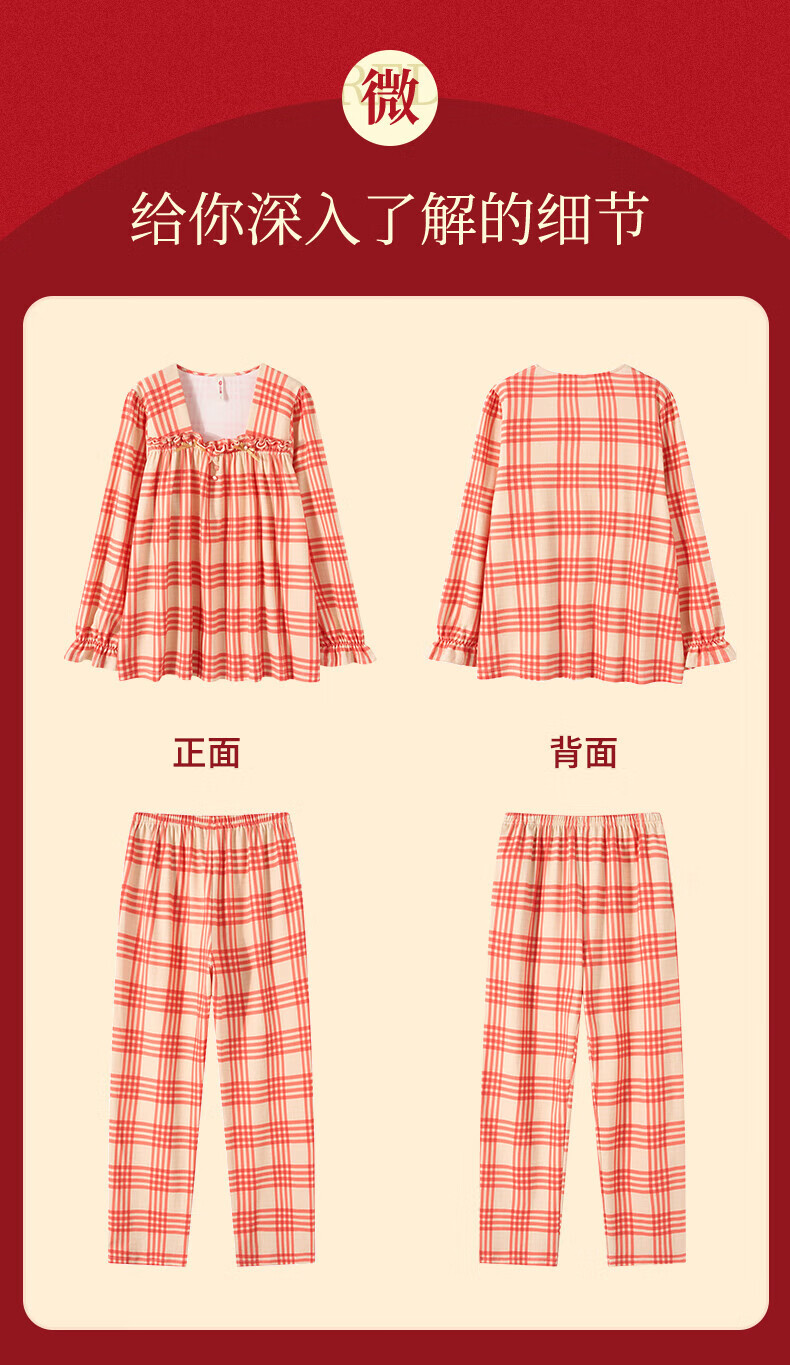 芬腾情侣睡衣【喜庆红棉】格纹可外穿翻领长袖家居服套装 桔格-男款 XL