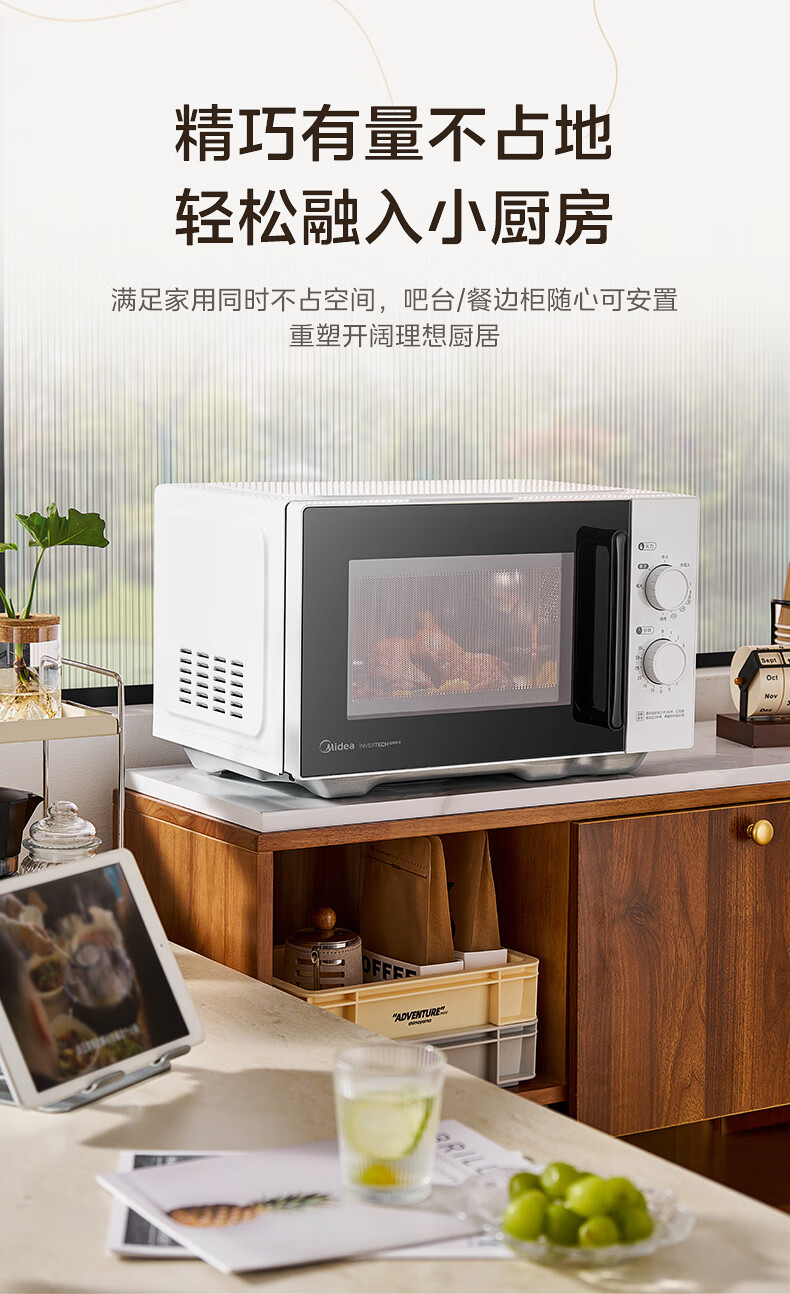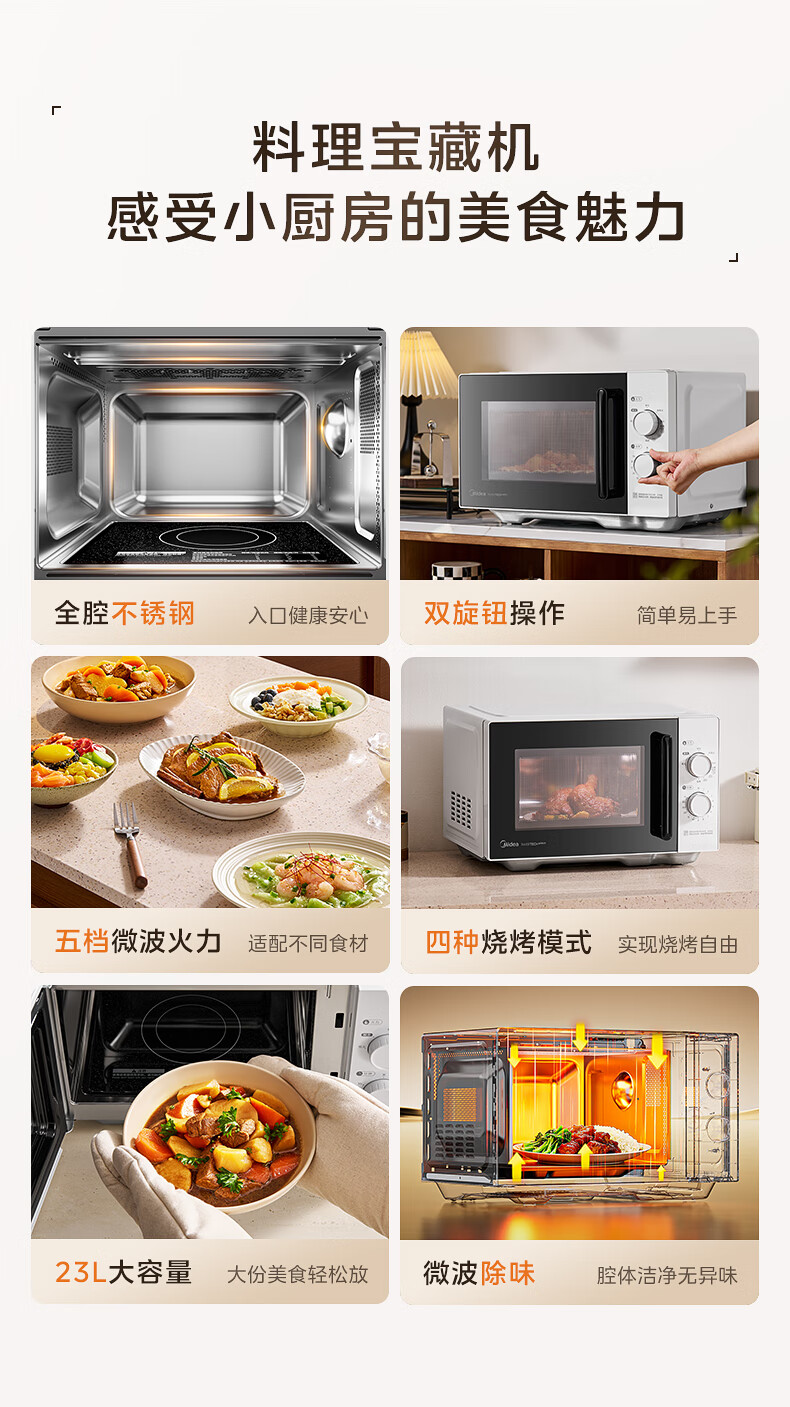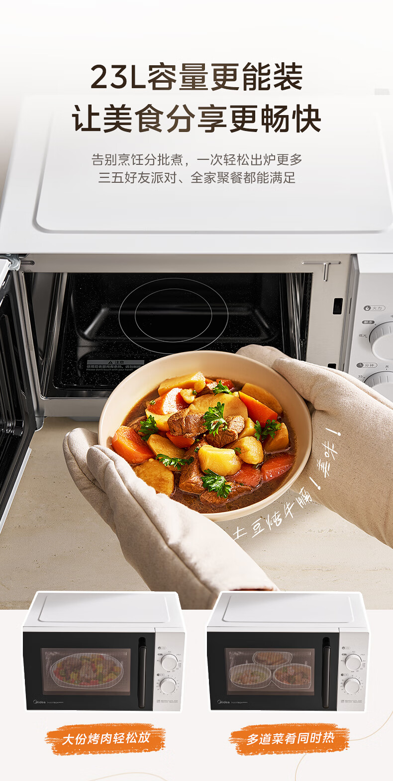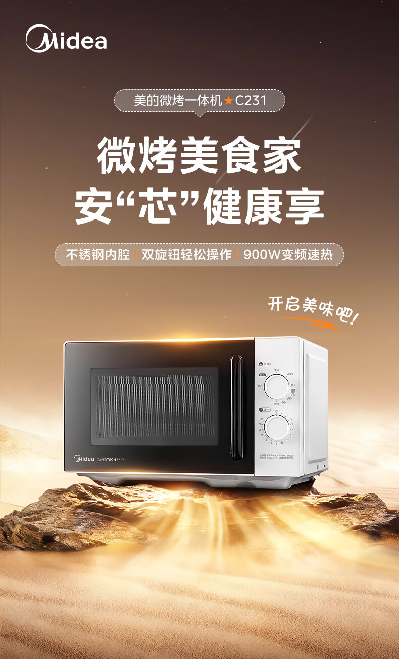 美的(Midea)微波炉烤箱一体机国家补贴一级能效家用小型平板式900W变频不锈钢内胆23L解冻加热旋钮操作C231