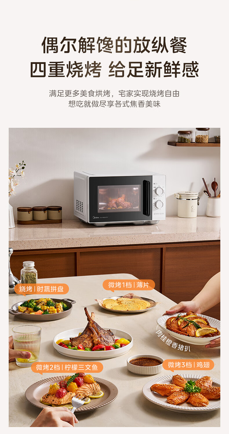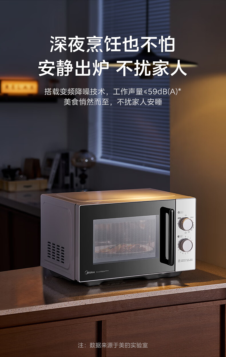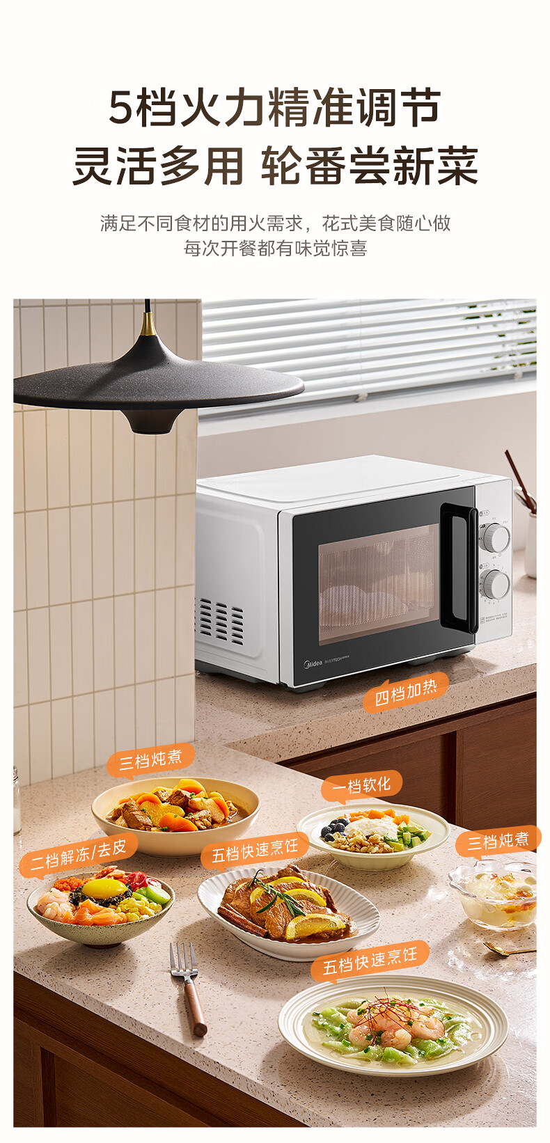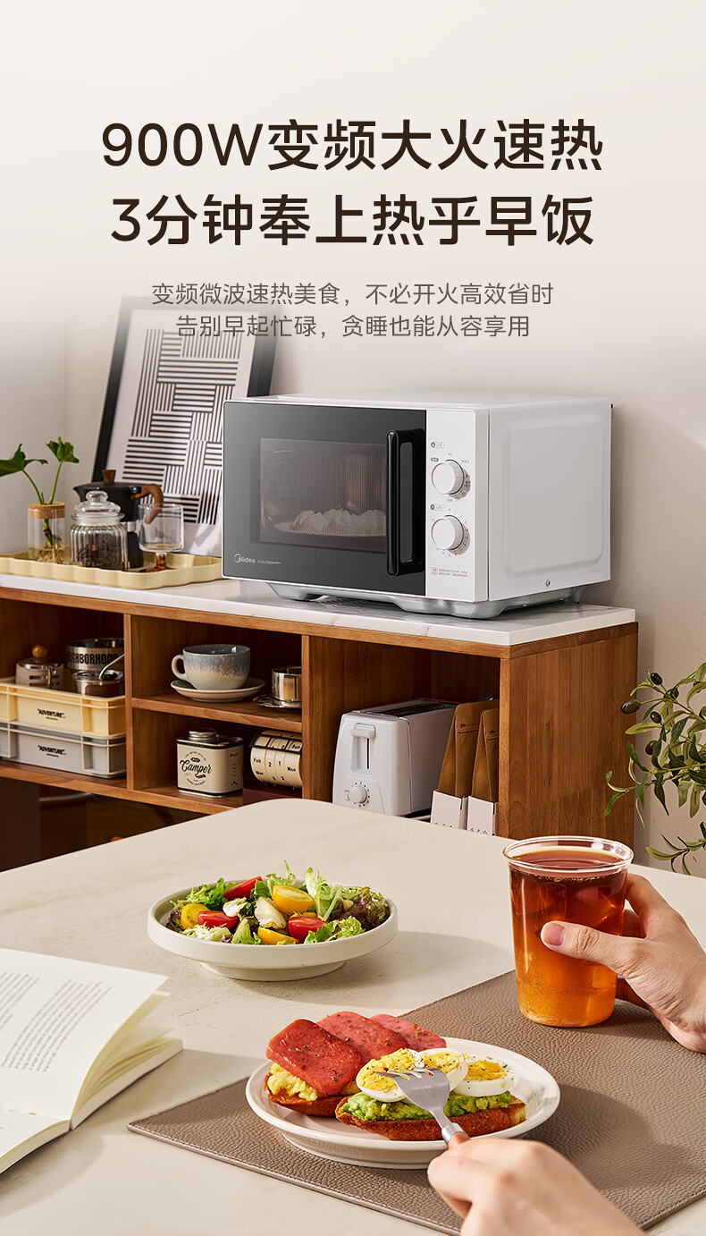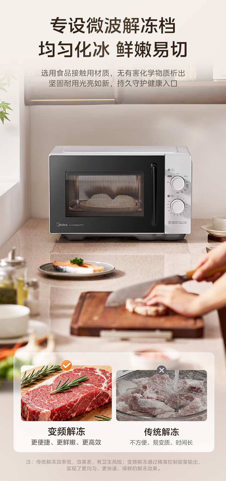 美的(Midea)微波炉烤箱一体机国家补贴一级能效家用小型平板式900W变频不锈钢内胆23L解冻加热旋钮操作C231
