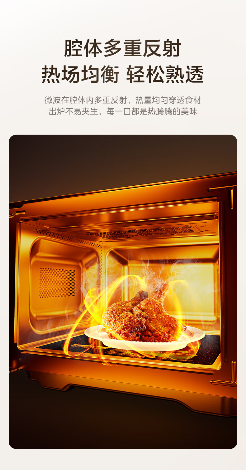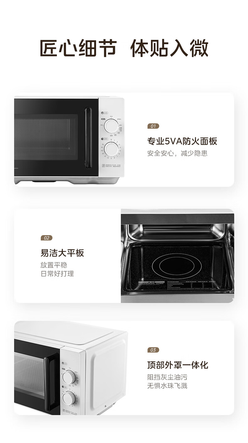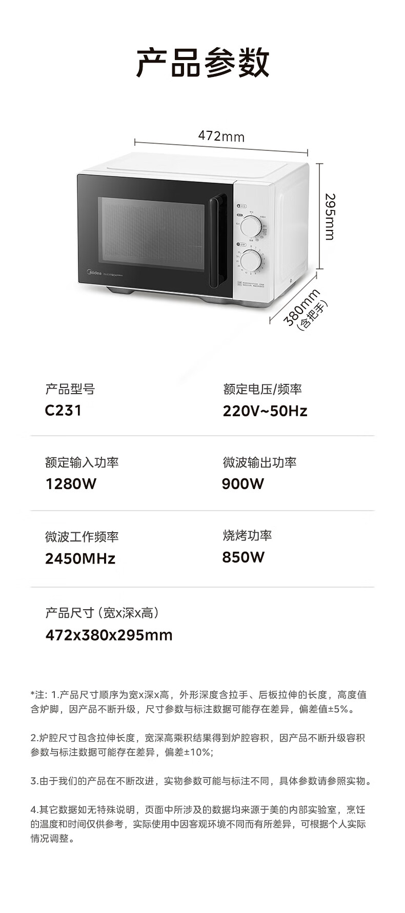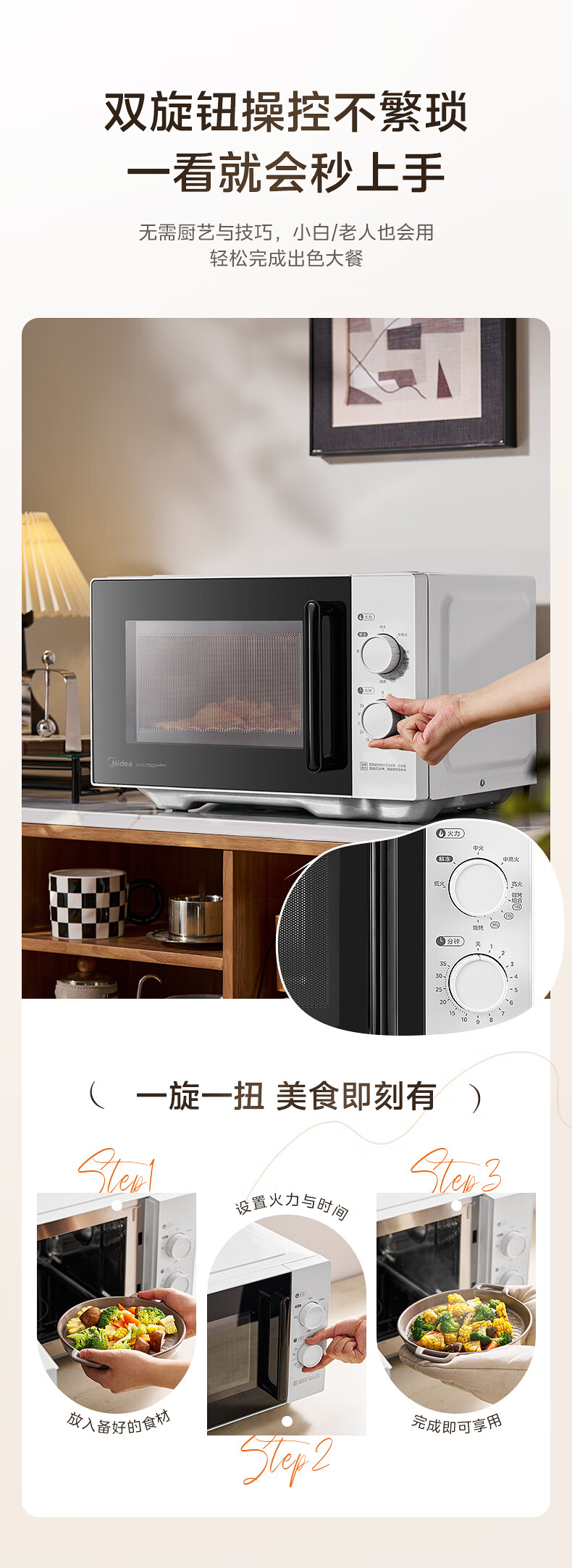 美的(Midea)微波炉烤箱一体机国家补贴一级能效家用小型平板式900W变频不锈钢内胆23L解冻加热旋钮操作C231