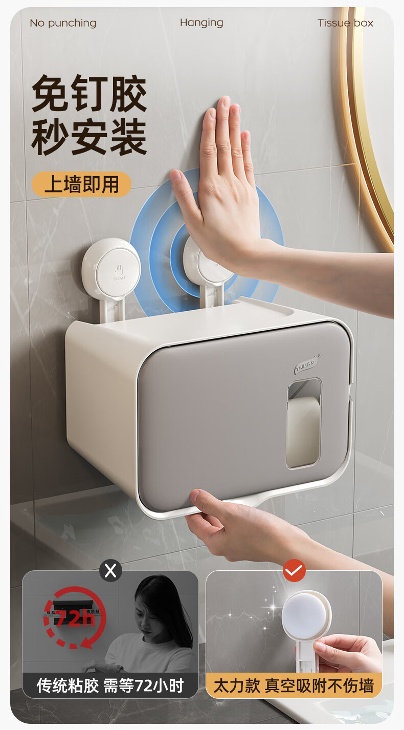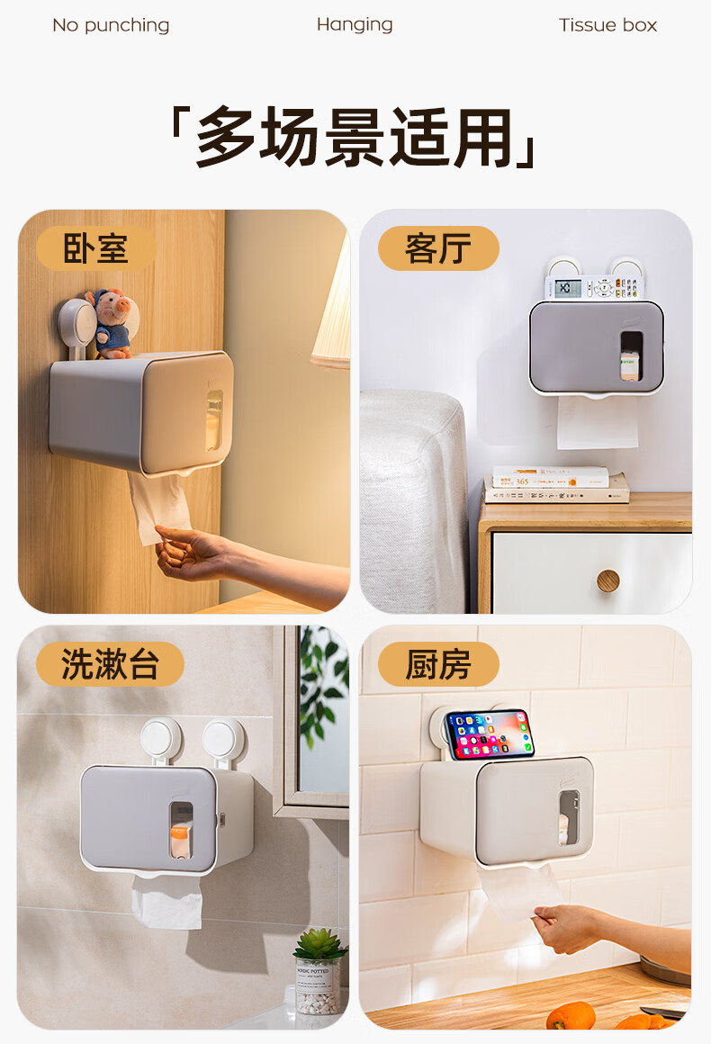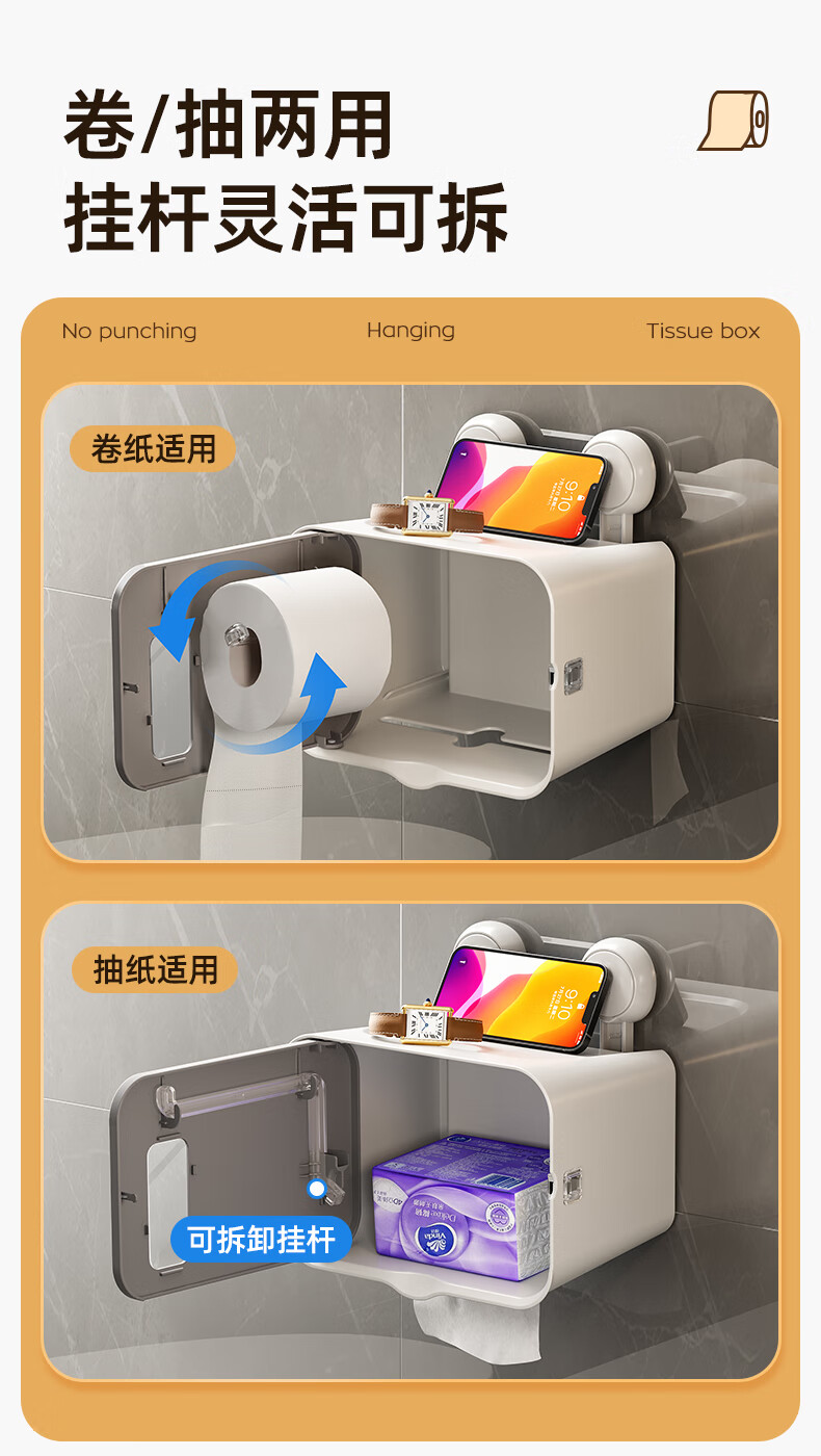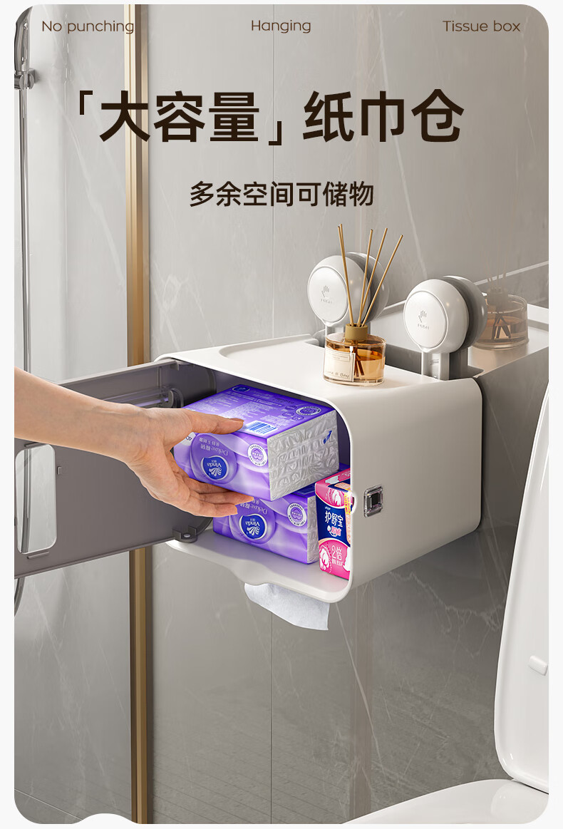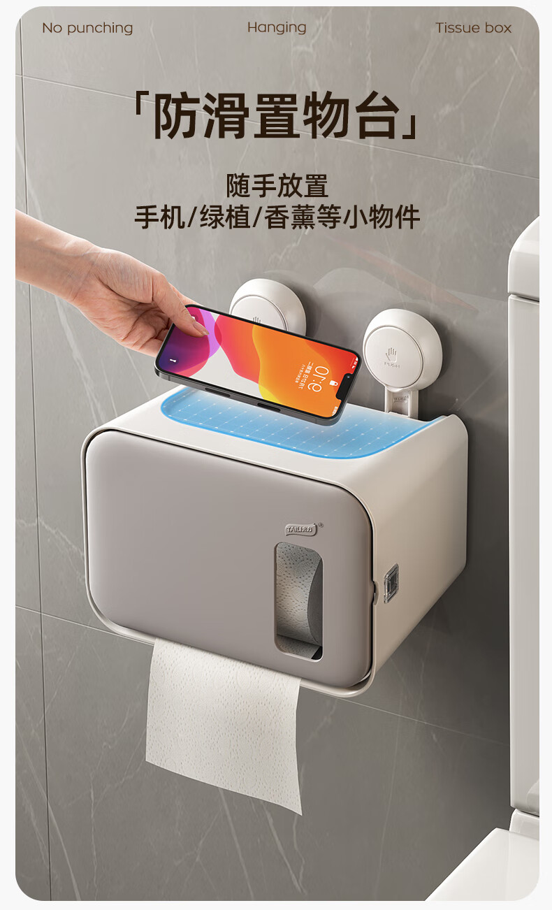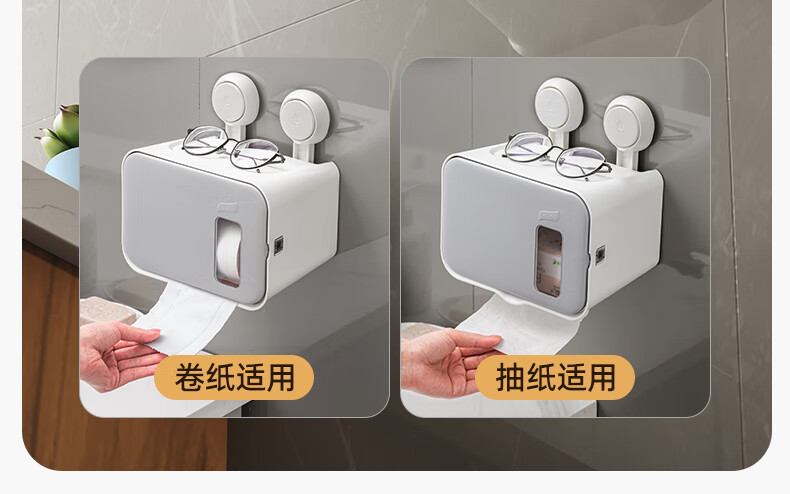 太力卫生间吸盘纸巾盒免打孔壁挂式抽纸盒置物架厕纸多功能卷纸挂盒 灰白色【卷/抽纸两用】